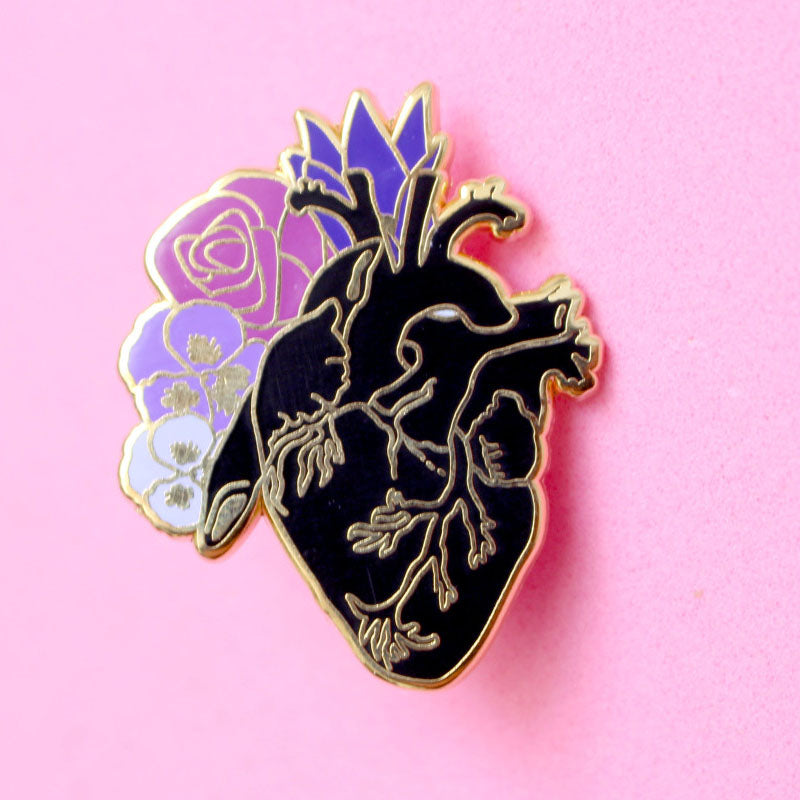 Who said romance was dead? This cute anatomical heart surrounded by flowers is perfect enamel pin for all true romantics! This 35mm gold hard enamel pin is available with either a black or a white heart, with purple, black or white flowers.