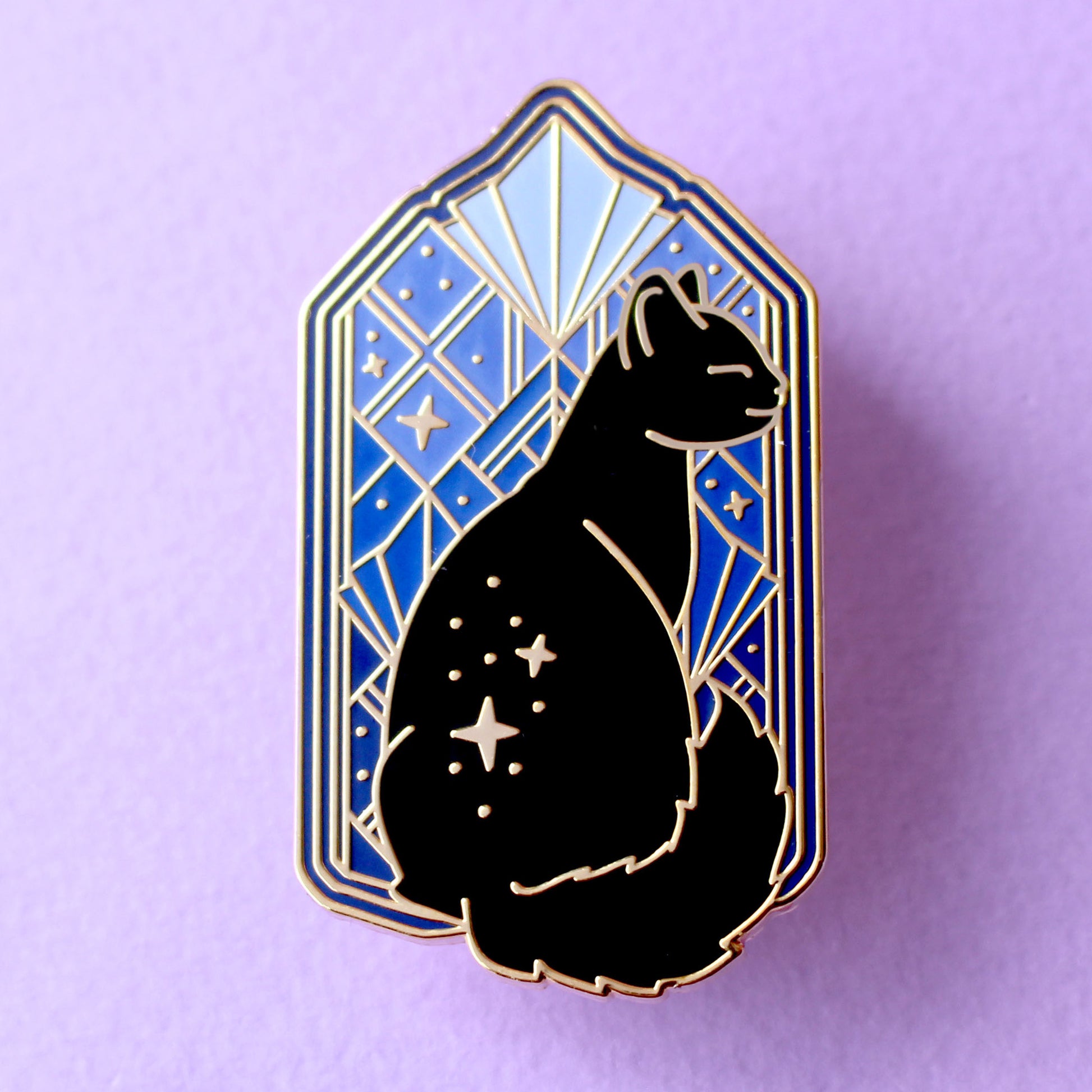 Featuring a black cat in front of a celestial window-like blue art deco triangle, this super sweet pin is the perfect way to jazz up a bag or jacket!