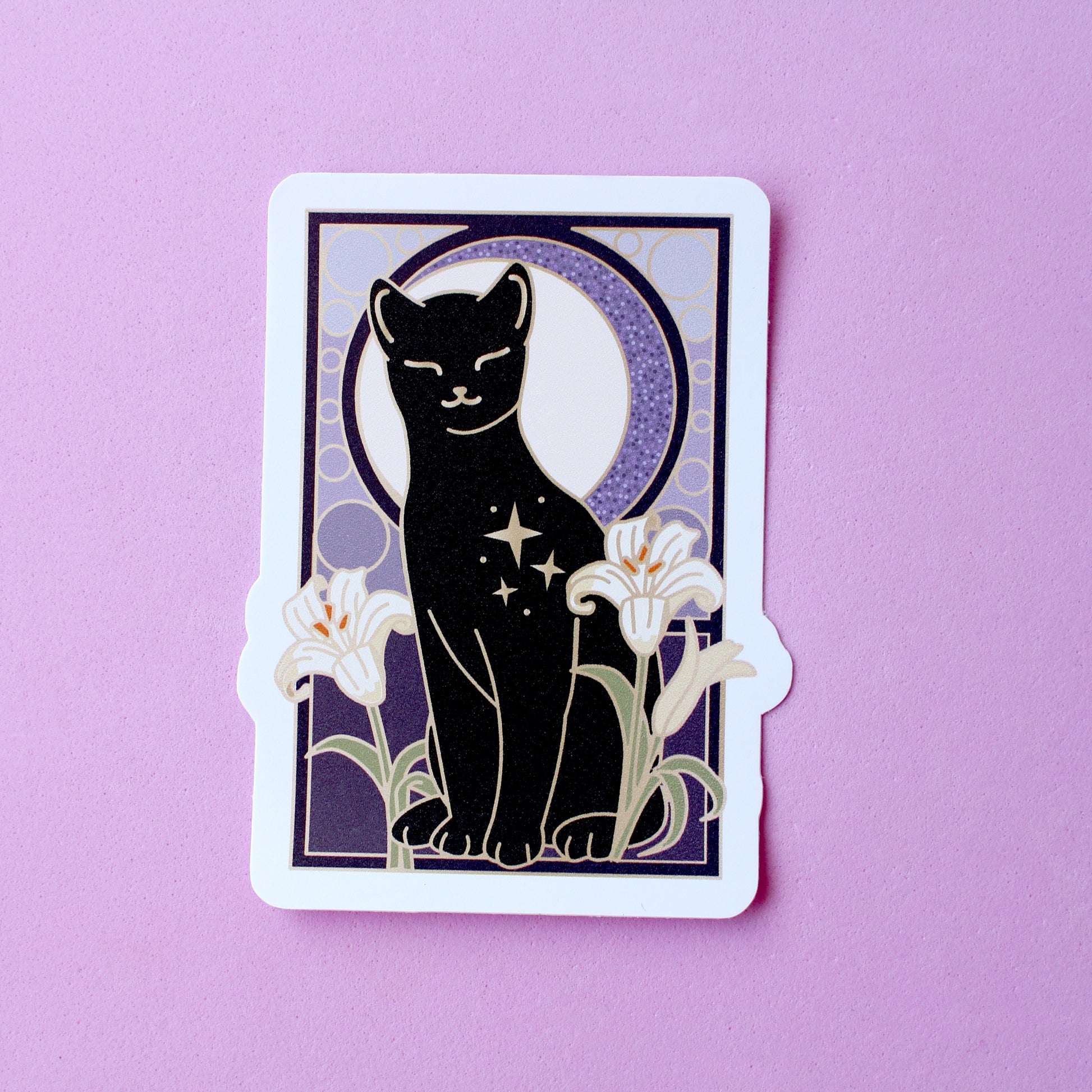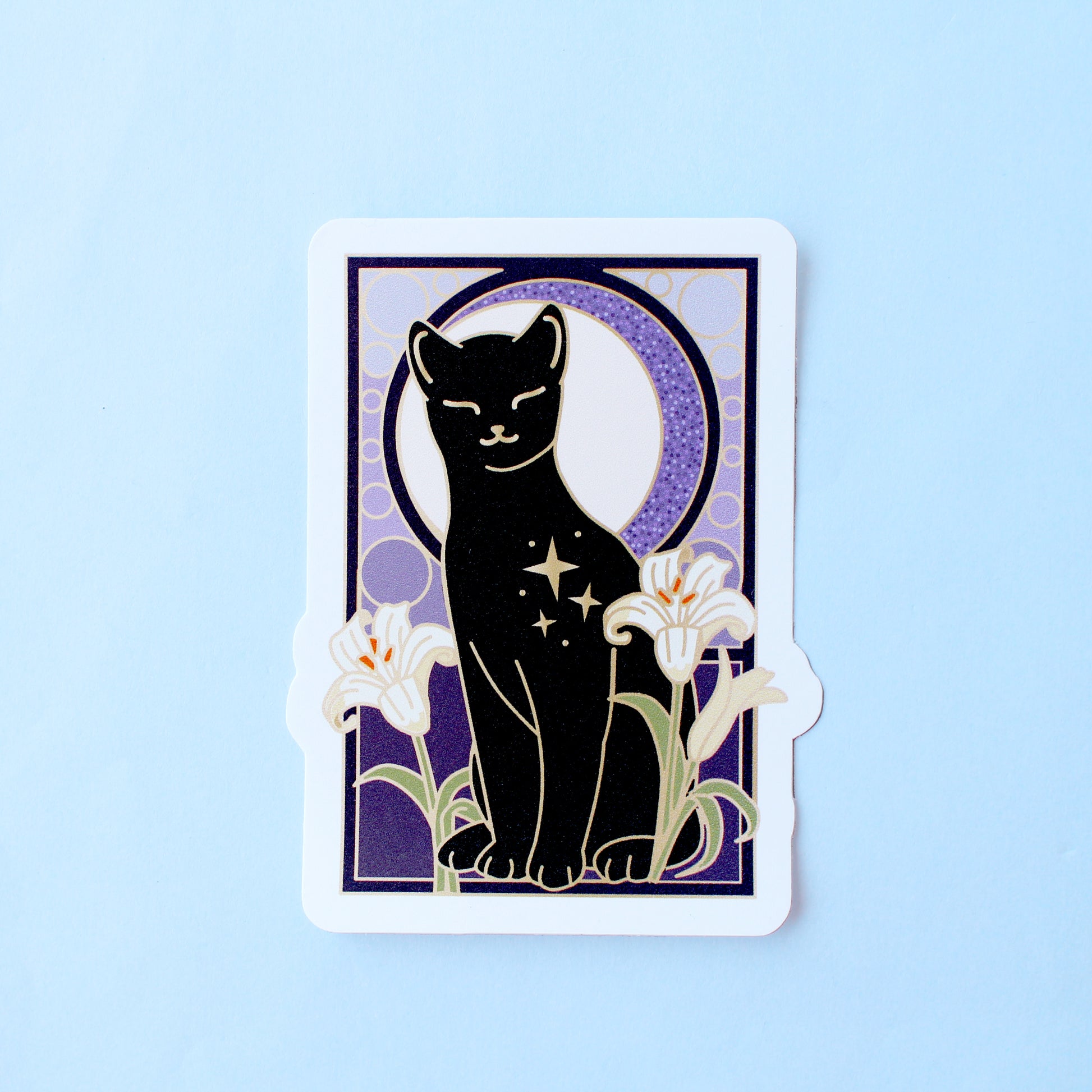 This super sweet Lily Cat sticker features a calm black cat surrounded by lilies, in front of a glittery moon set against an ornamental purple art nouveau background.