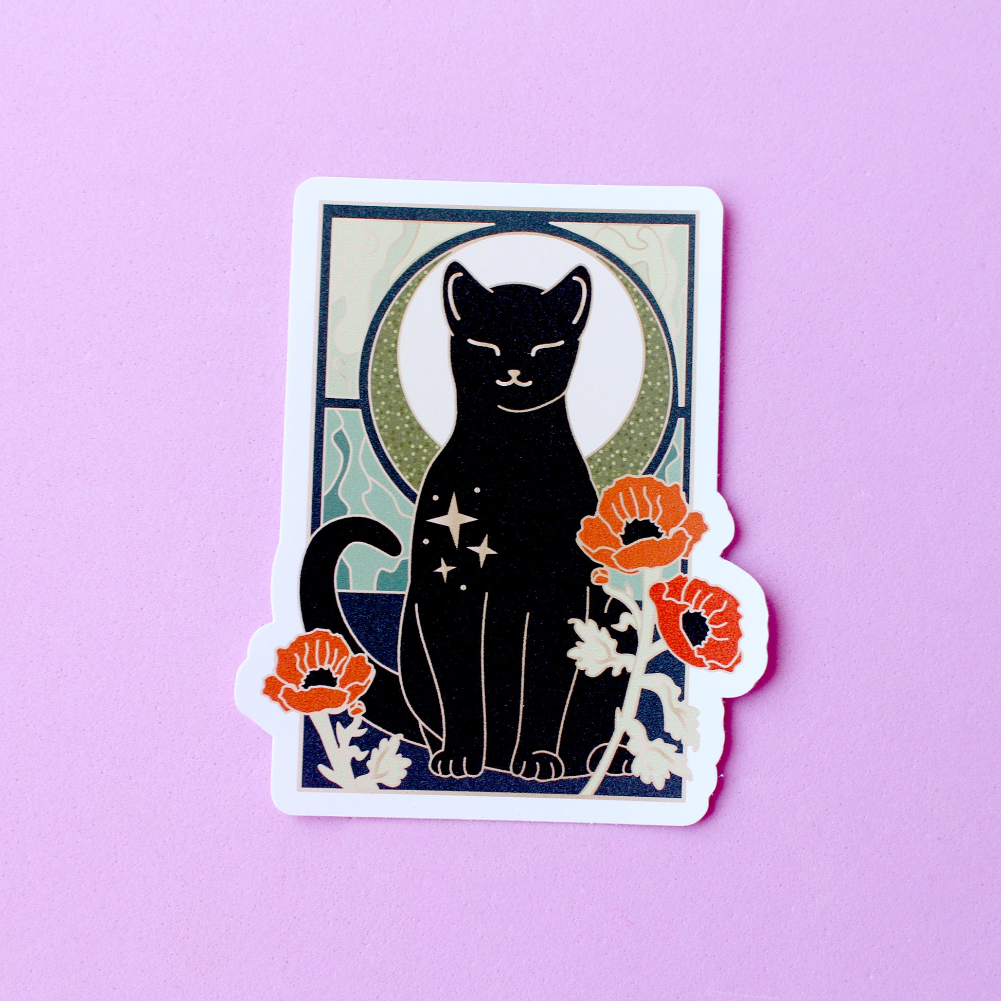 This peaceful Poppy Cat sticker features a happy black cat surrounded by red poppies, in front of a glittery moon set against an ornamental green art nouveau background.