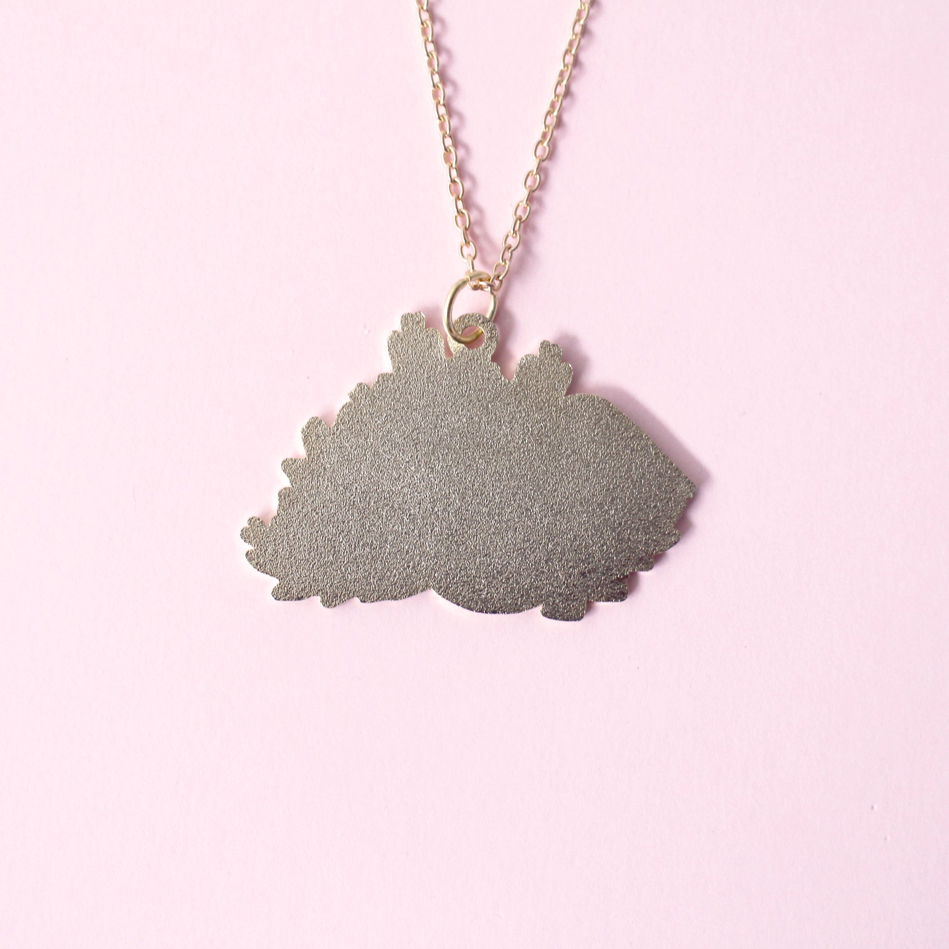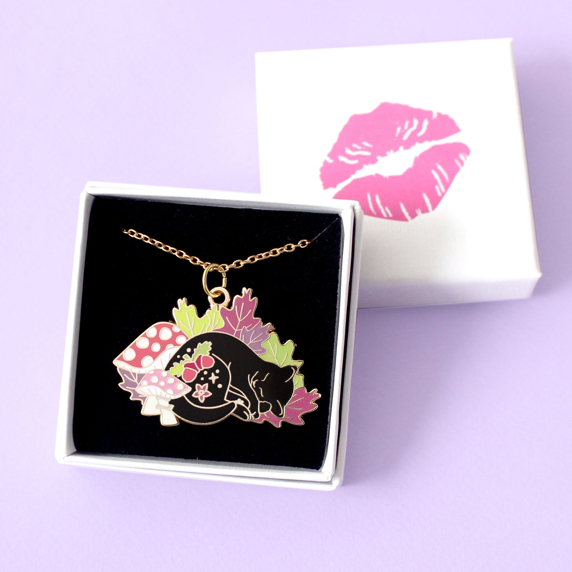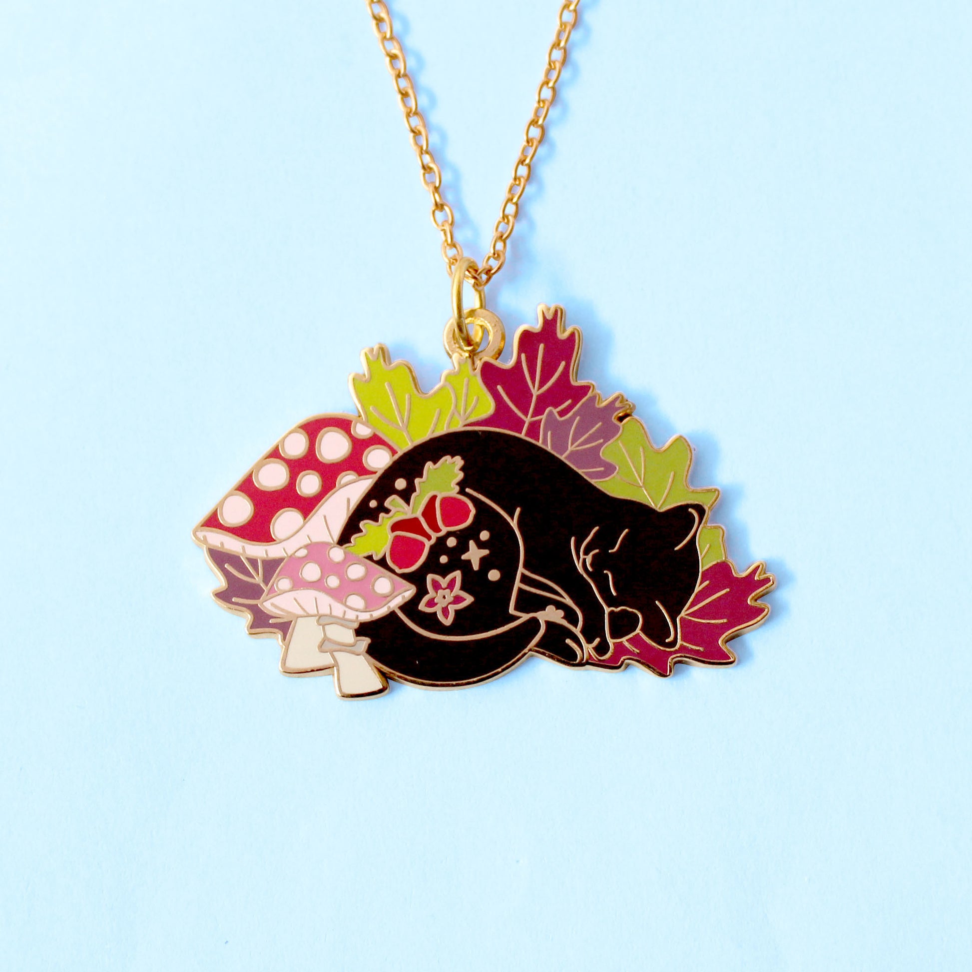 Get in the autumnal mood with this super cute Fall Cat! This 48mm gold hard enamel charm necklace features a dark grey cat surrounded by mushrooms and autumn leaves. It's hung from an 18" gold chain.