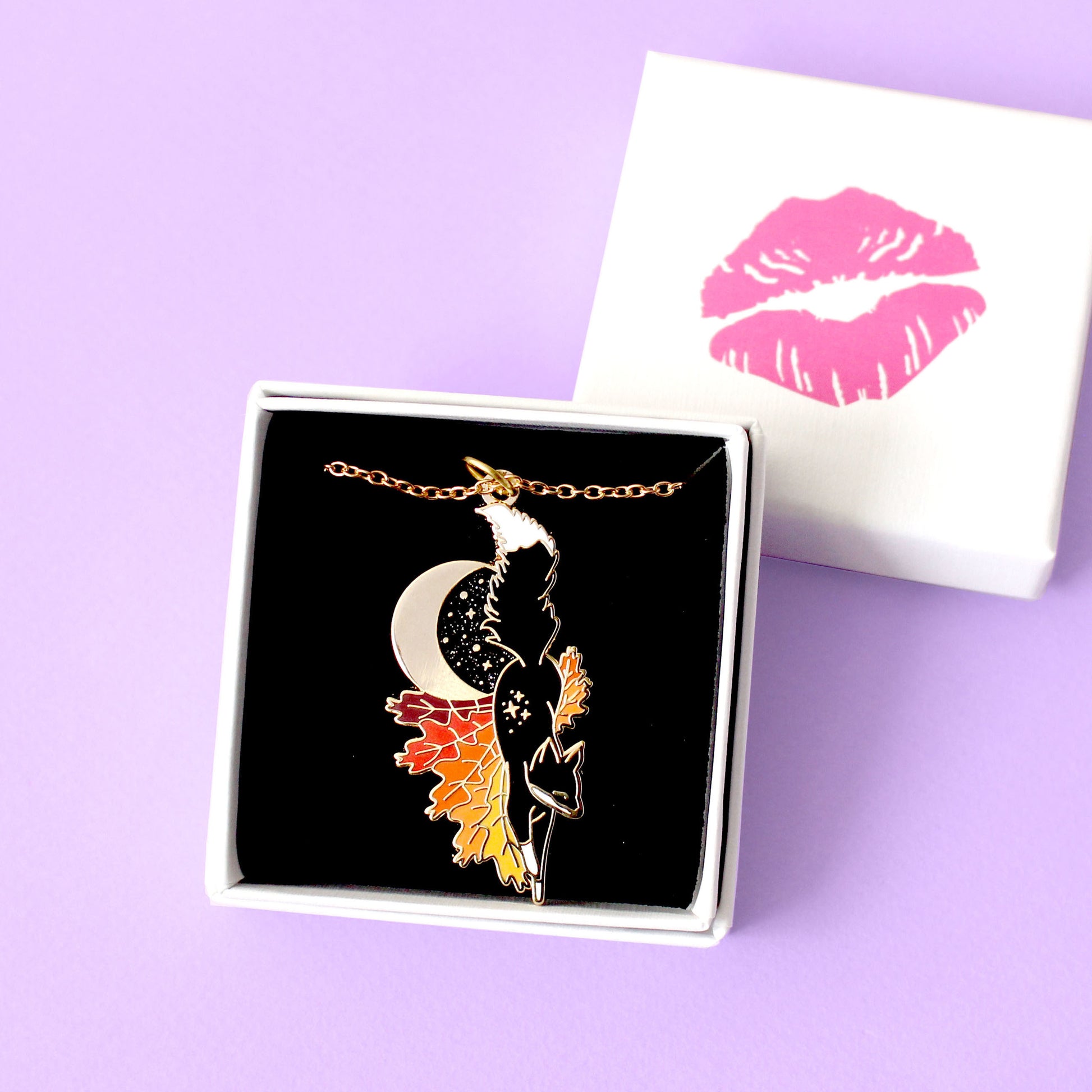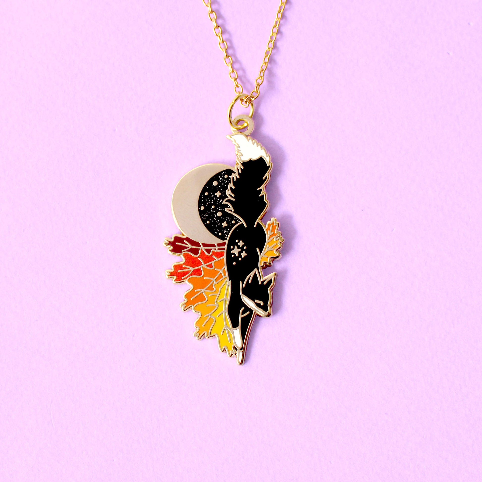 The Autumn Fox design is now available as a necklace! If you love the autumn season this fantastic Fall Fox is the necklace for you! It features a black fox jumping over a glittery moon, surrounded by vibrant autumnal leaves.