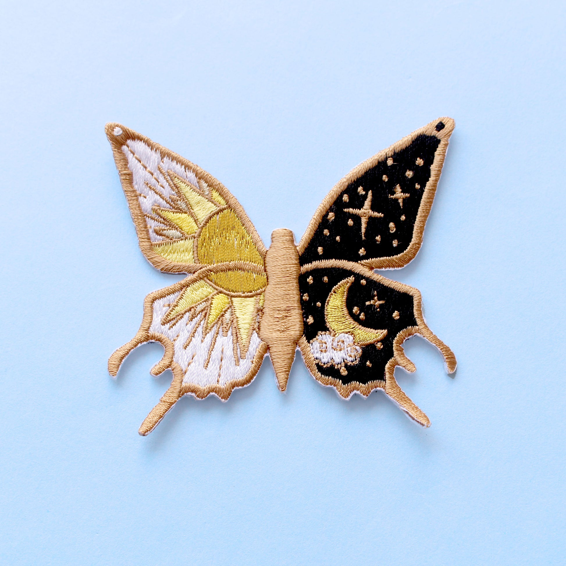 This fab iron-on patch features a butterfly with one wing in white and a glittery sun design, and the other in black with an equally glittery moon. This fabulous patch will brighten up any coat, bag or hat!