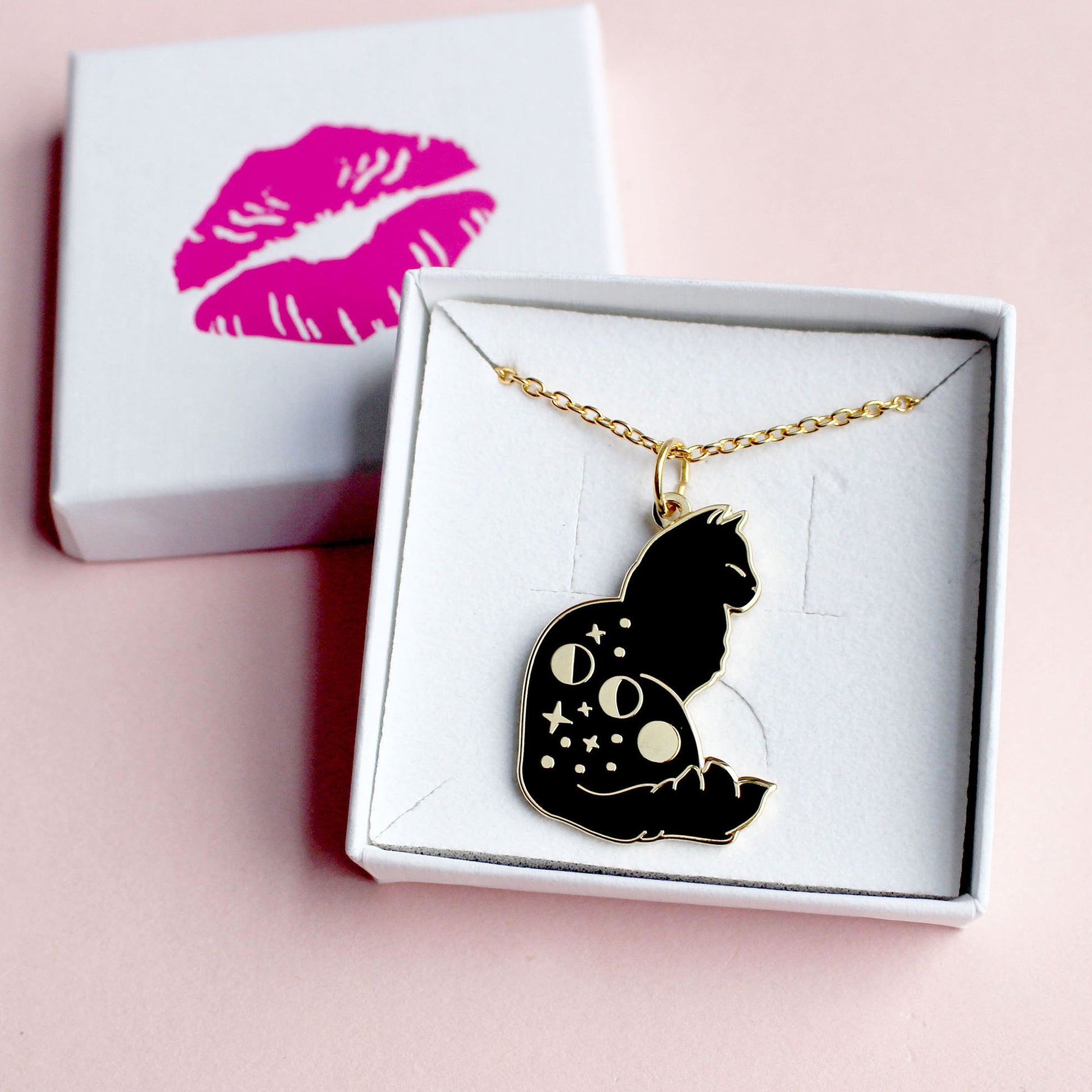 The Celestial Cat design is now available as a necklace! Made from gold hard enamel, the charm measures 35x24mm and is hung from an 18" gold chain.