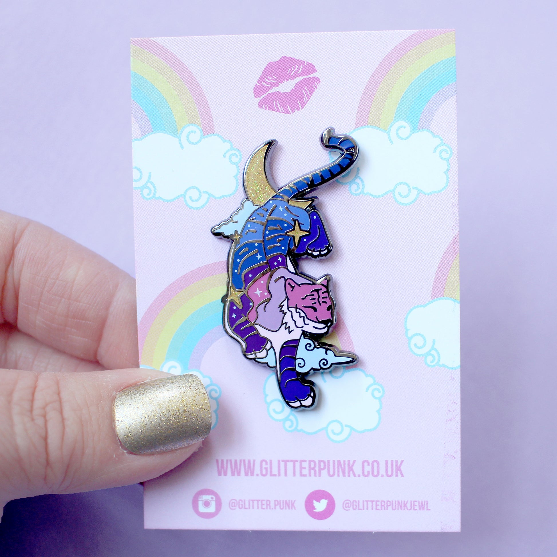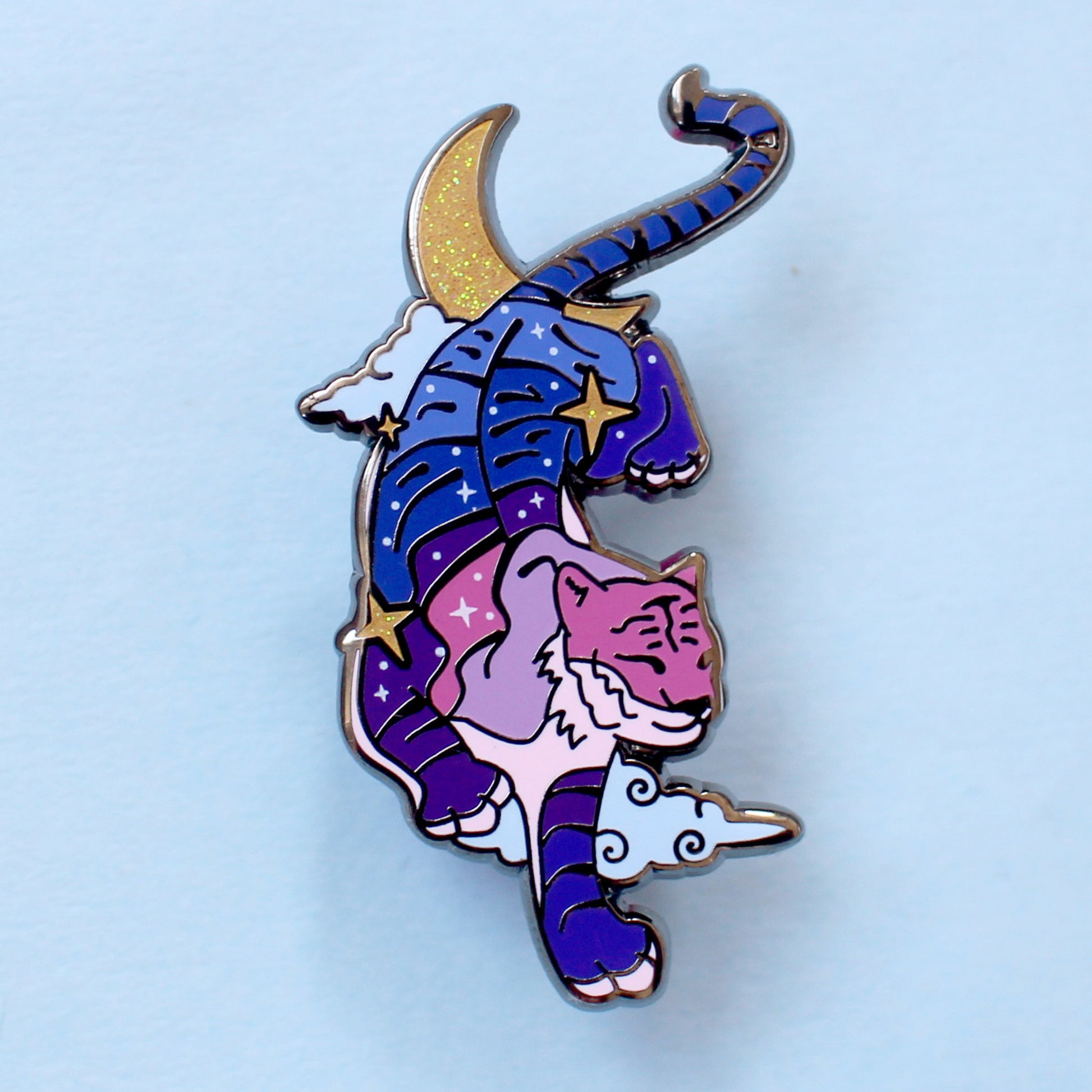Featuring a tiger prowling through the clouds under a crescent moon, its body is coloured in dreamy blues and purples, with glittery moon & star details.