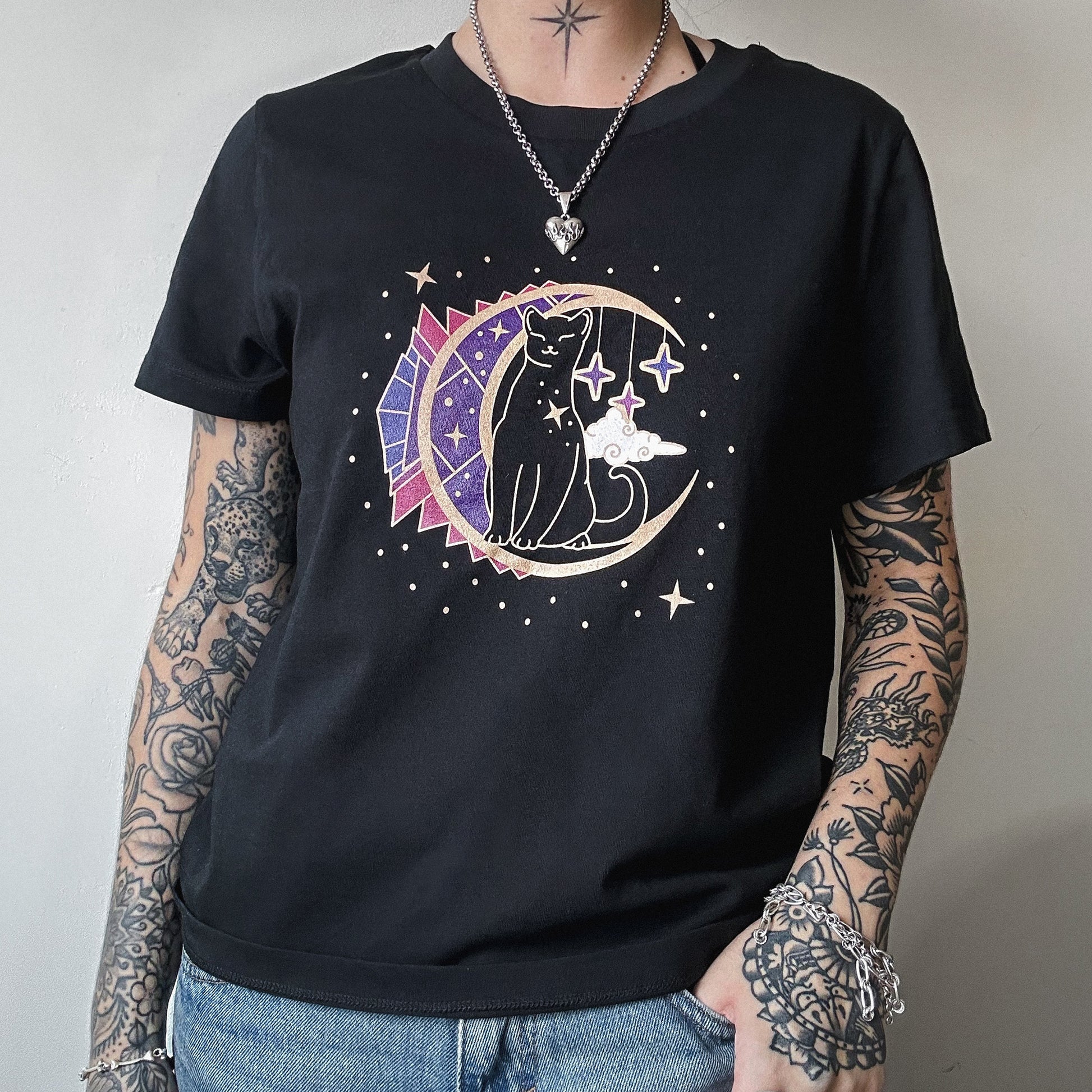 This celestial Deco Moon Cat t-shirt is perfect for cat lovers everywhere!