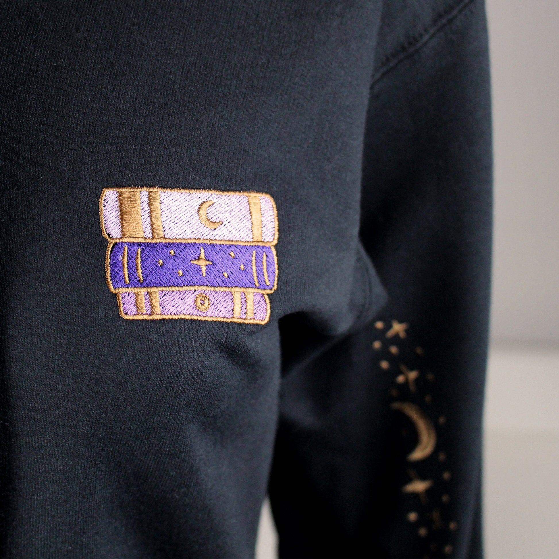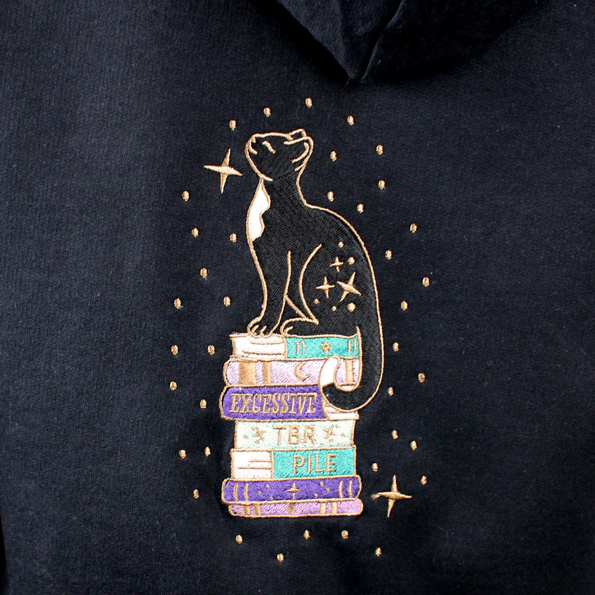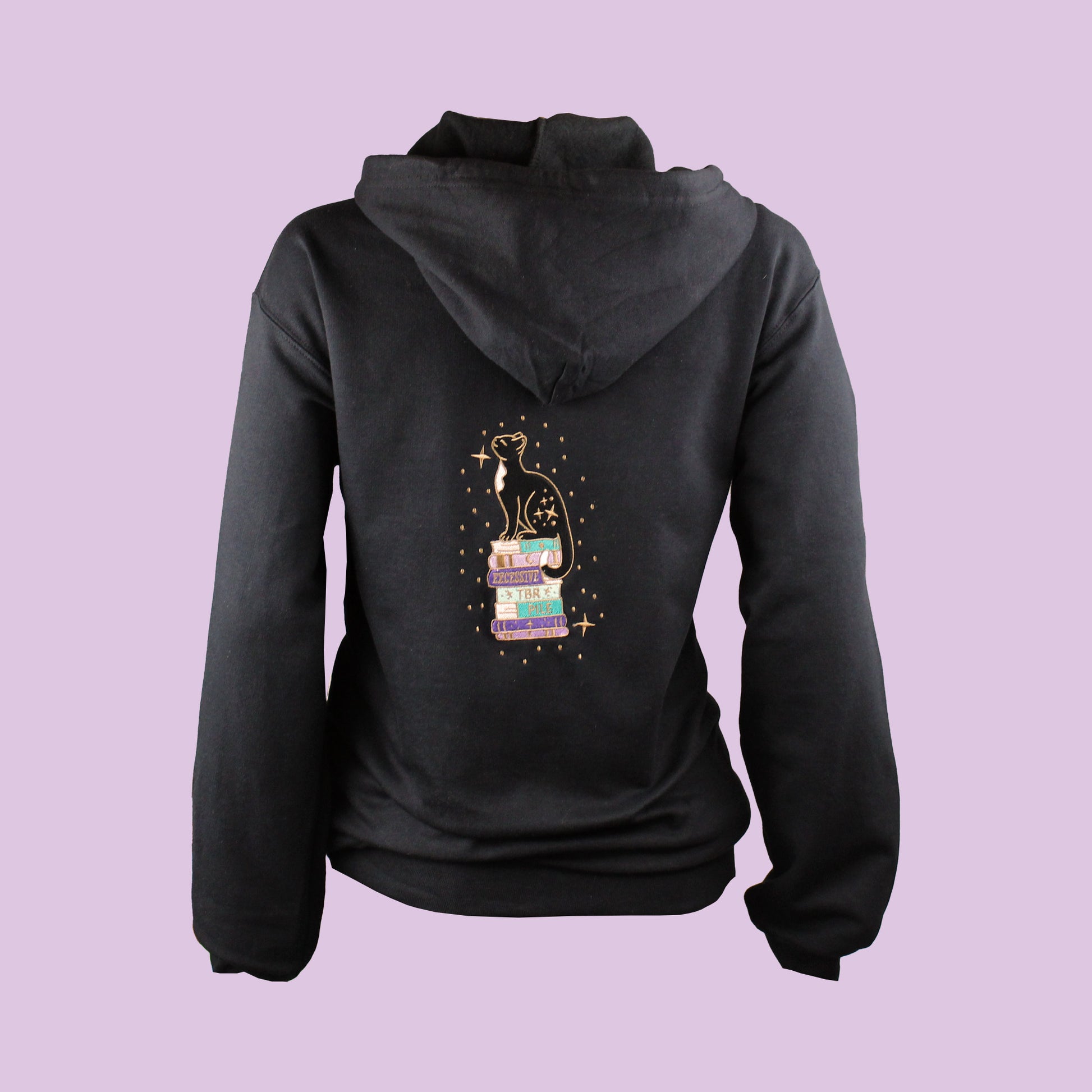 Made from a super soft cotton mix, this relaxed black unisex zip-up hoodie has the Excessive TBR design embroidered onto the back, a small trio of books on the front right chest, and starry sleeves.