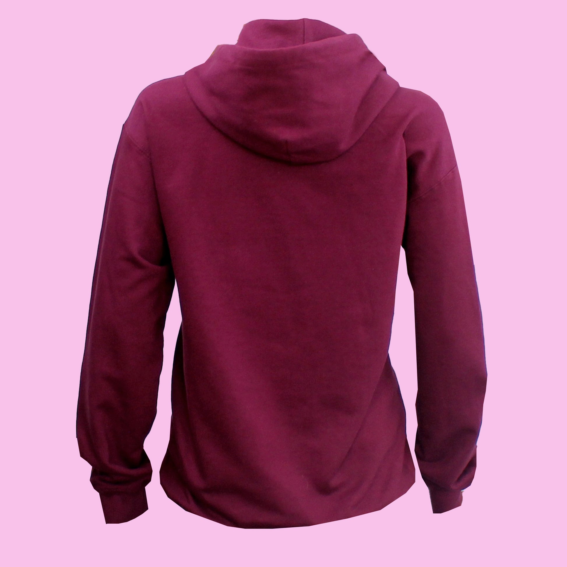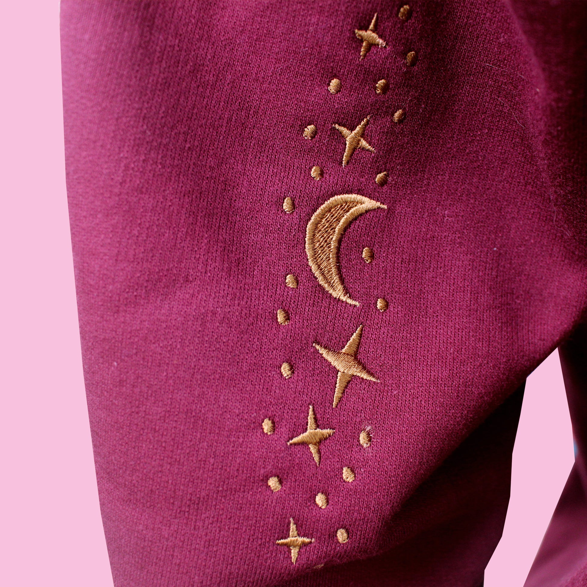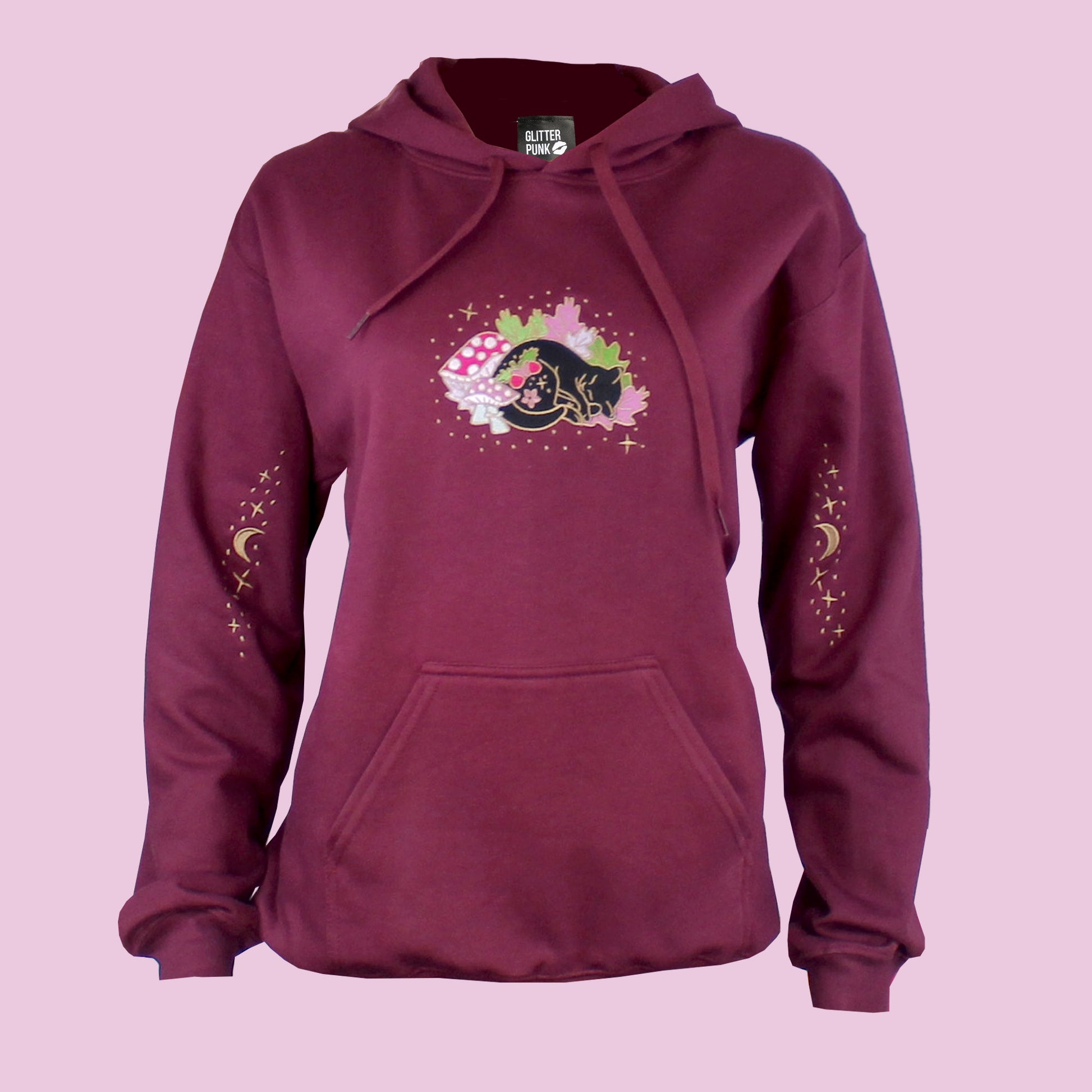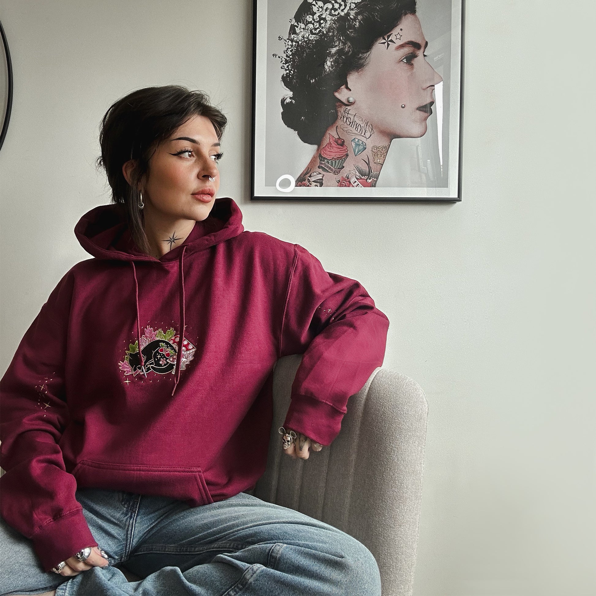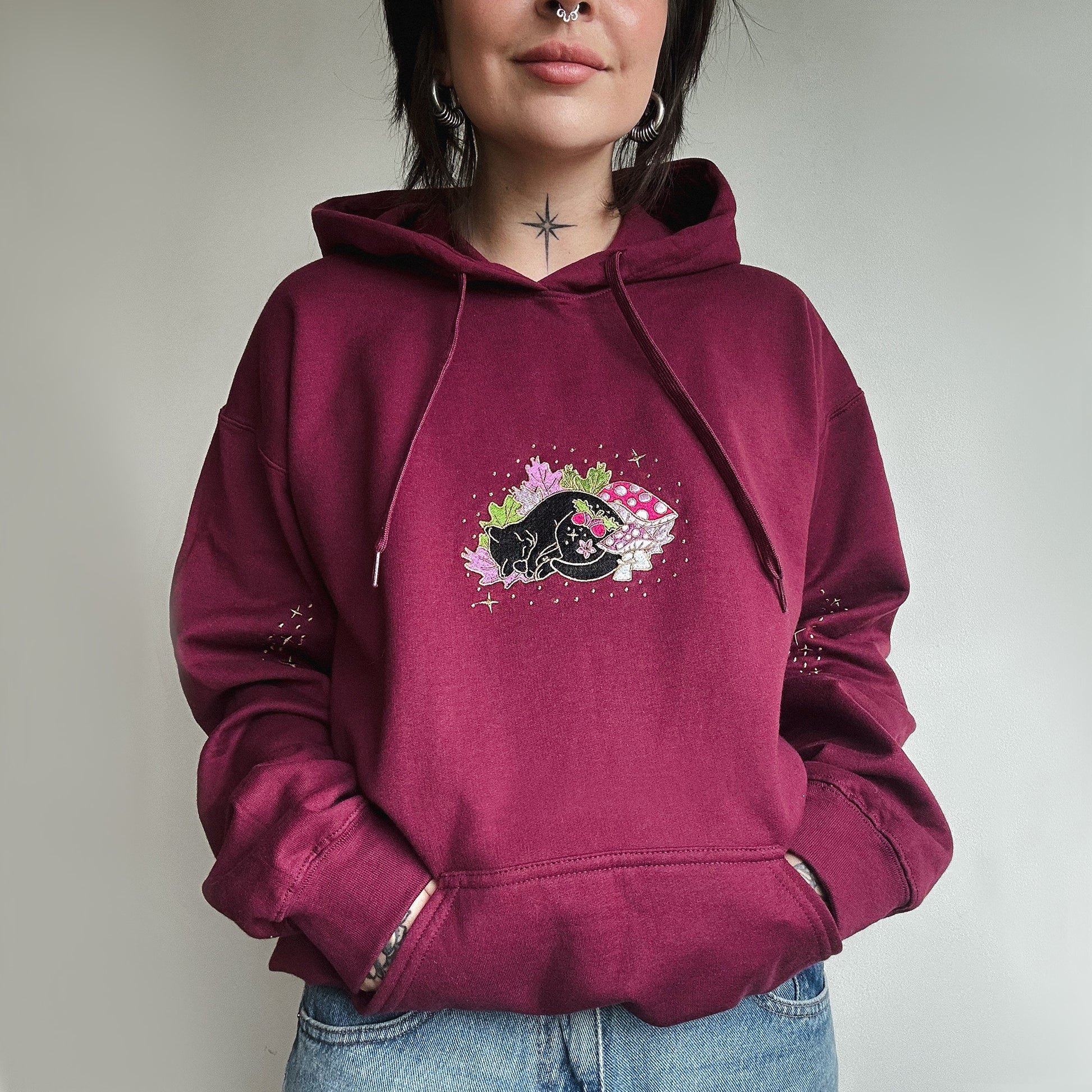Made from a super soft cotton mix, this relaxed maroon unisex hoodie has the fall cat embroidered onto the chest and starry sleeves.