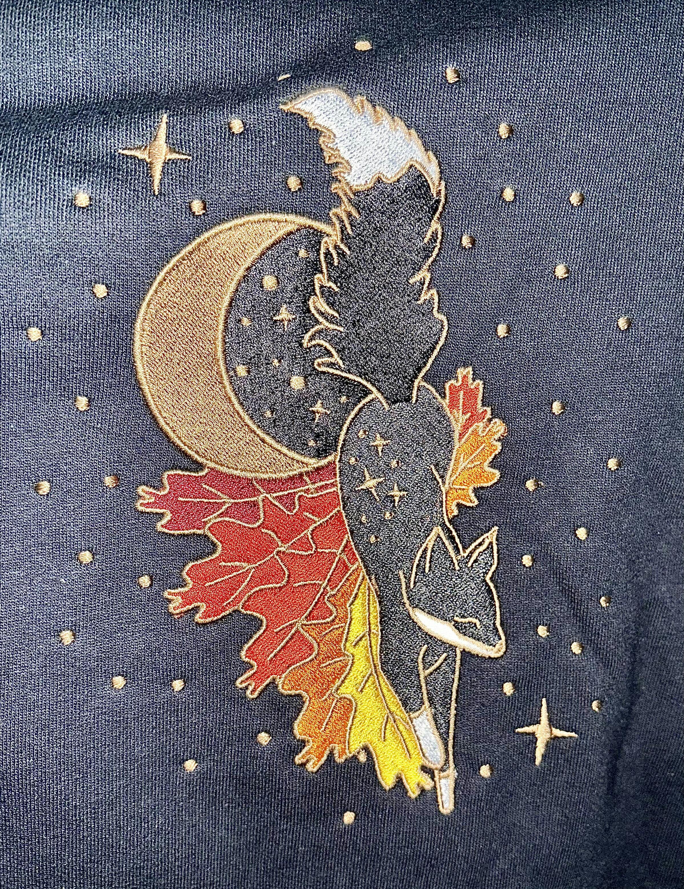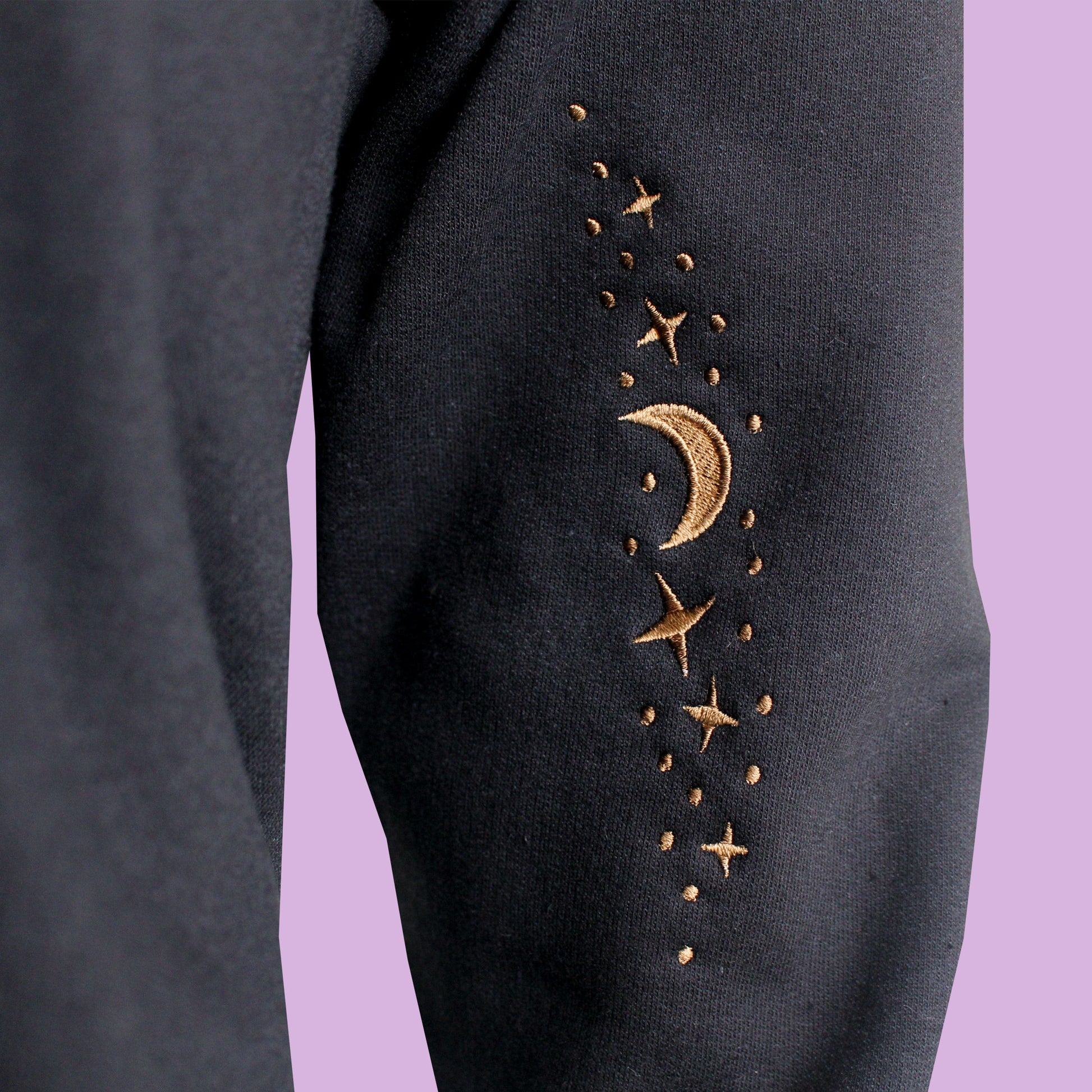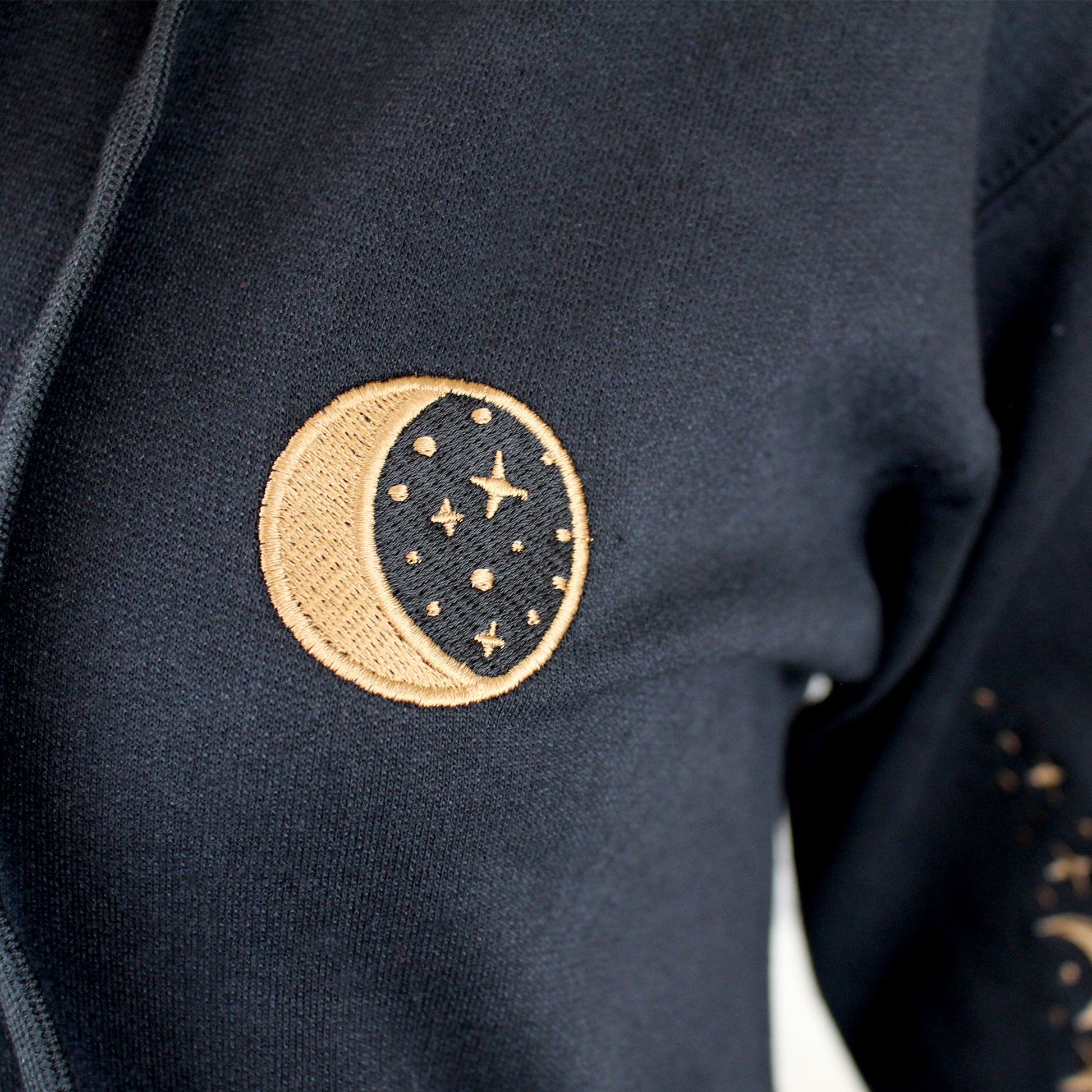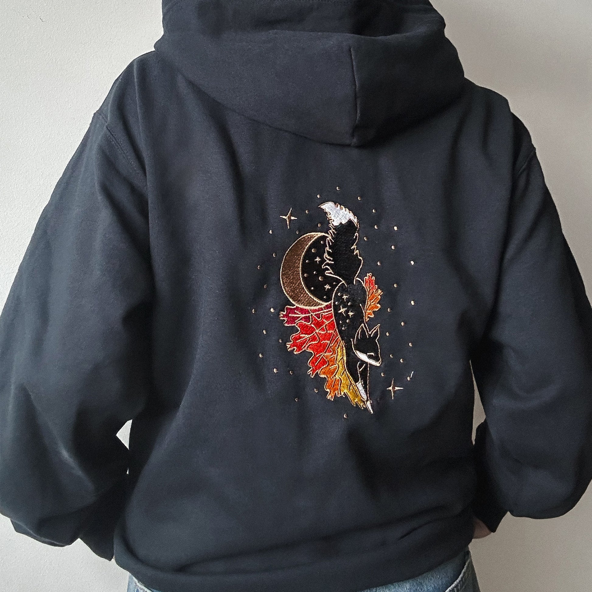 Made from a super soft cotton mix, this relaxed black unisex zip-up hoodie has the autumn fox embroidered onto the back, a mini moon on the front right chest, and starry sleeves.