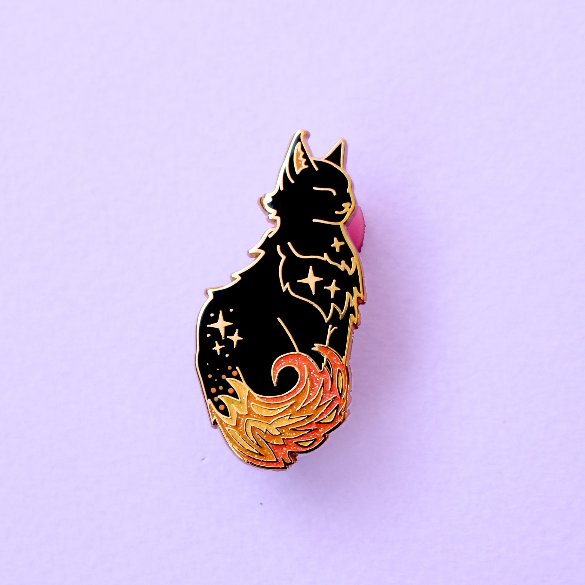 Made from gold hard enamel, this striking 37mm black cat has a glittery fire tail and ears.
