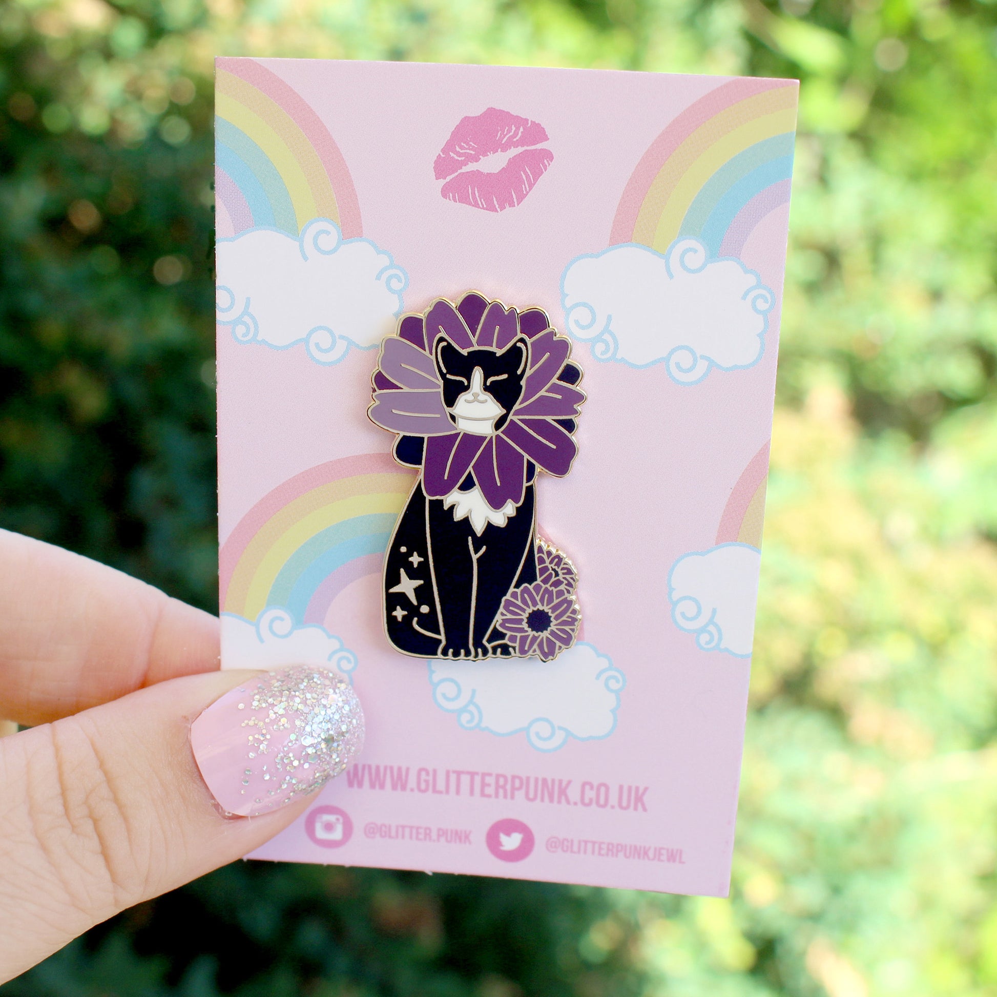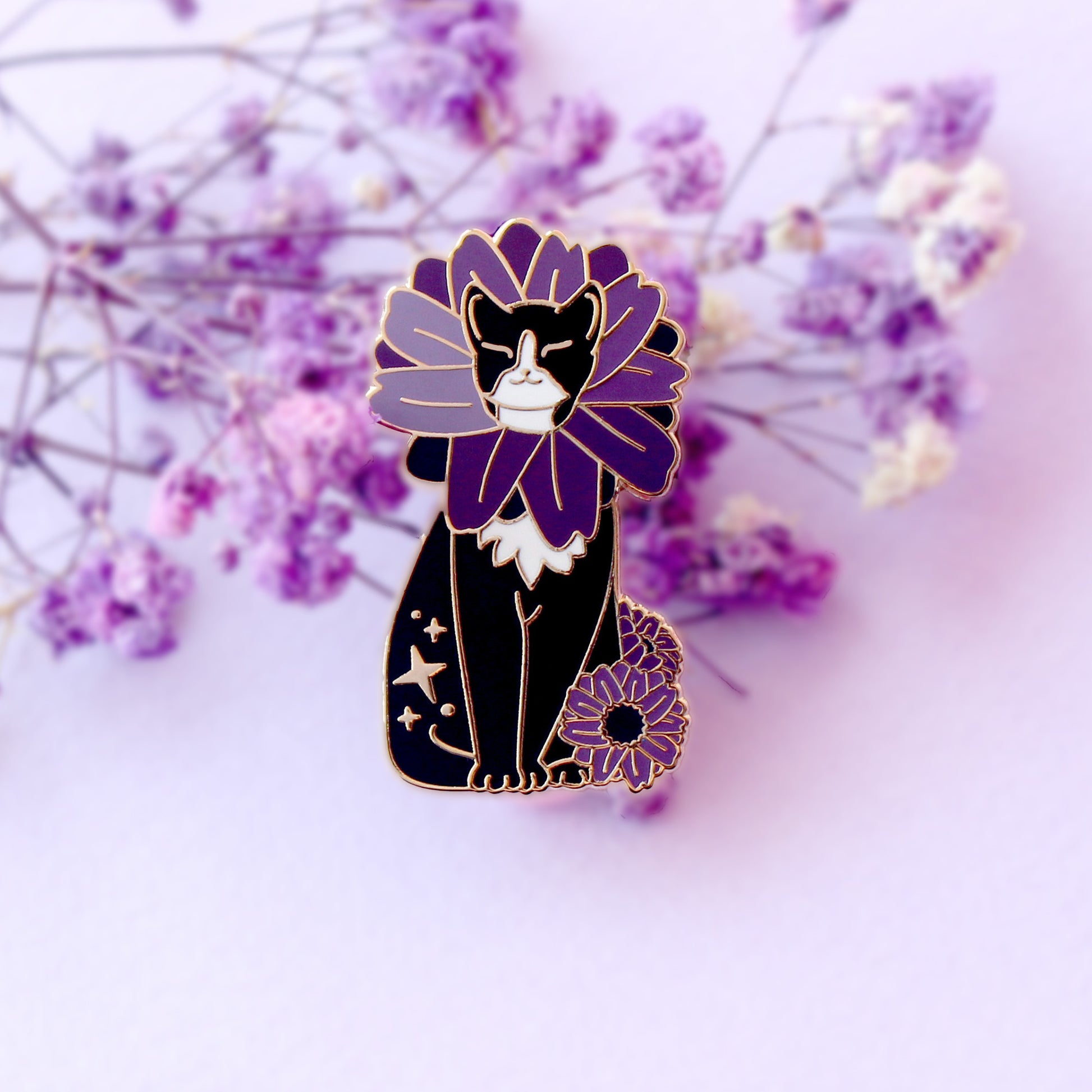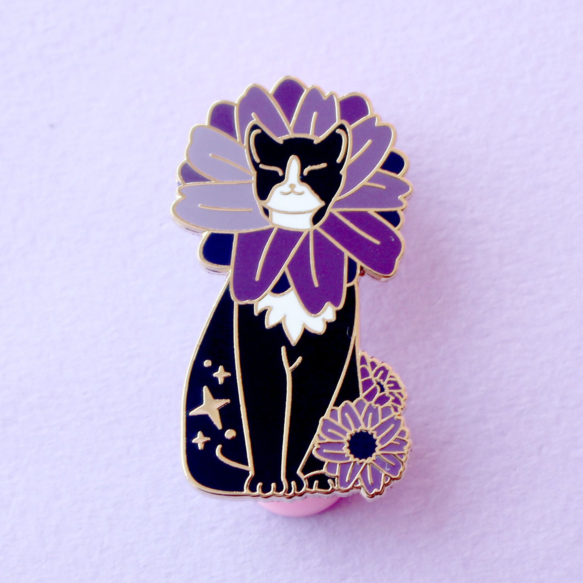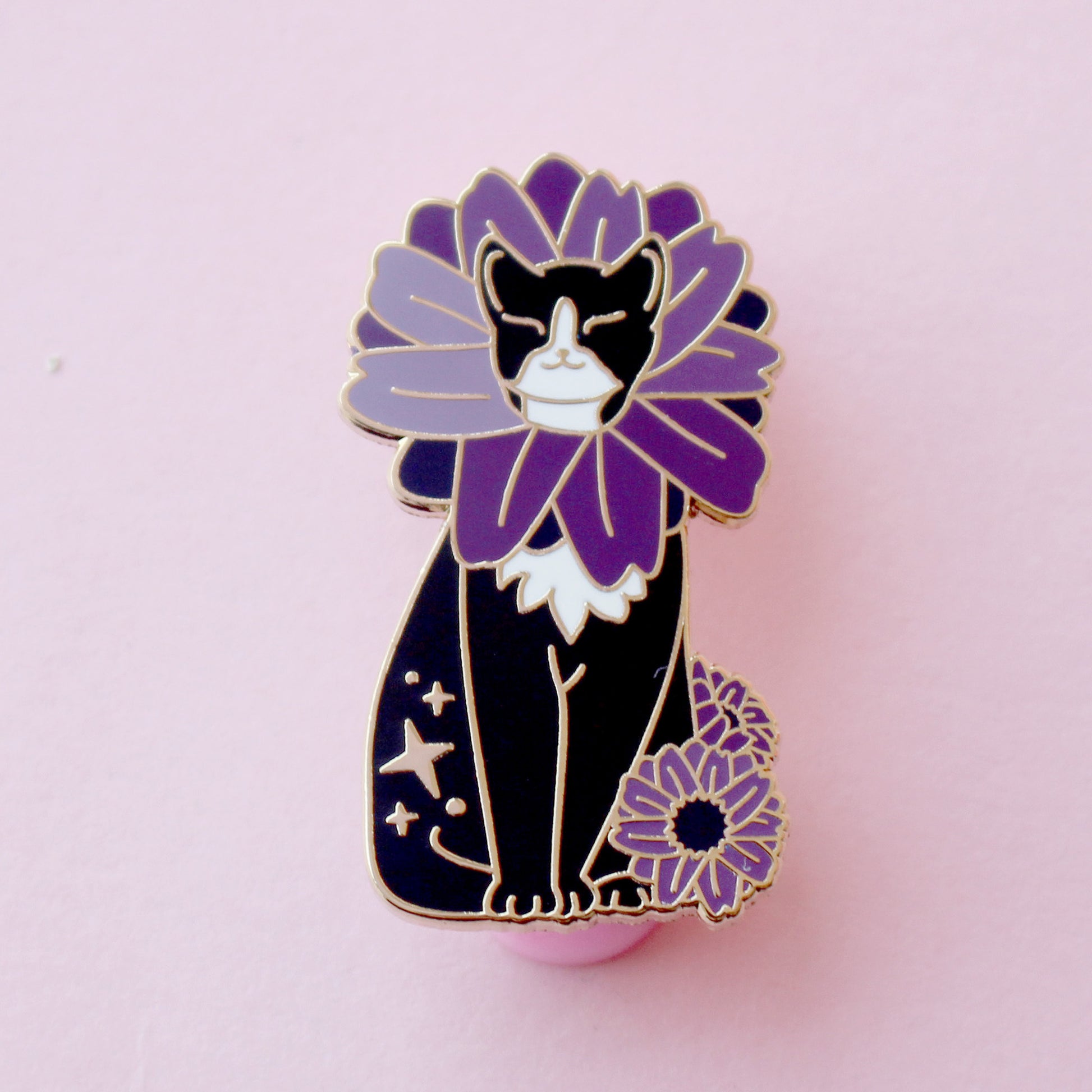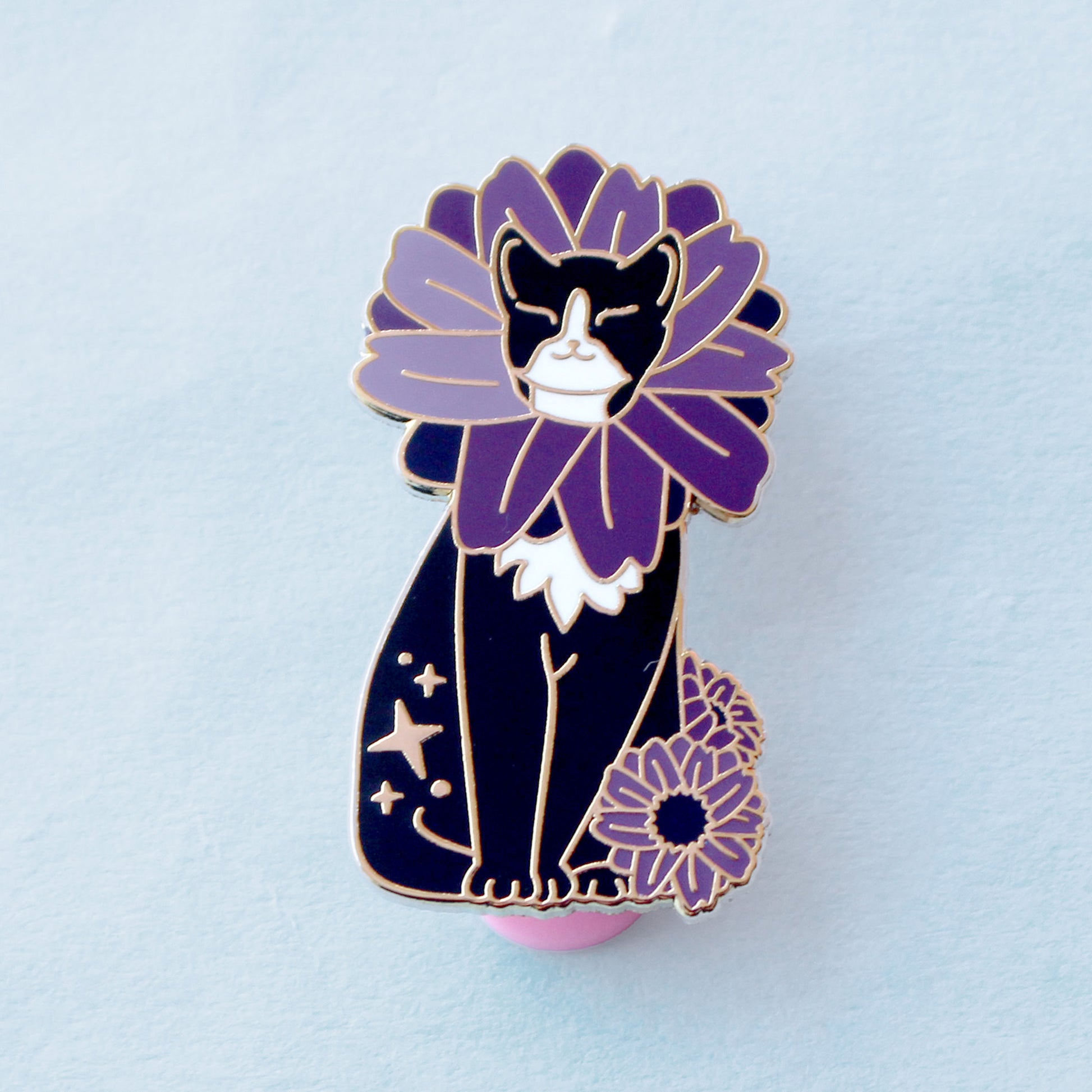 This fabulous Flower Cat is full of relaxed summer vibes. With this tuxedo cat’s gentle expression and oversized purple flower, this pin captures the feeling of summertime in full bloom.