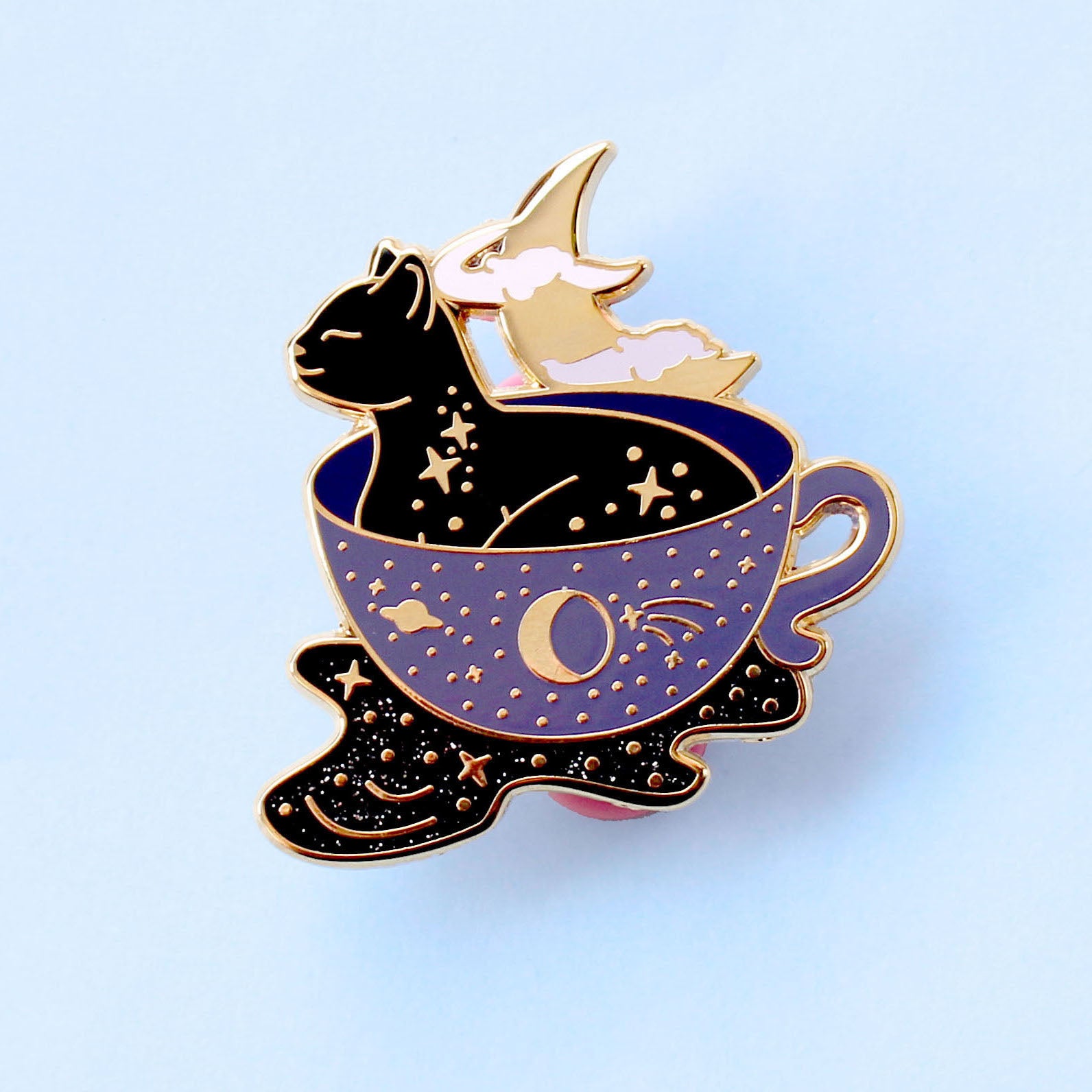 This super cute black cat is perfect for adding some space-themed vibes to your bag, coat or hat! Featuring a cat sitting in a cup covered in star motifs, in front of a moon with a little cosmic spillage!