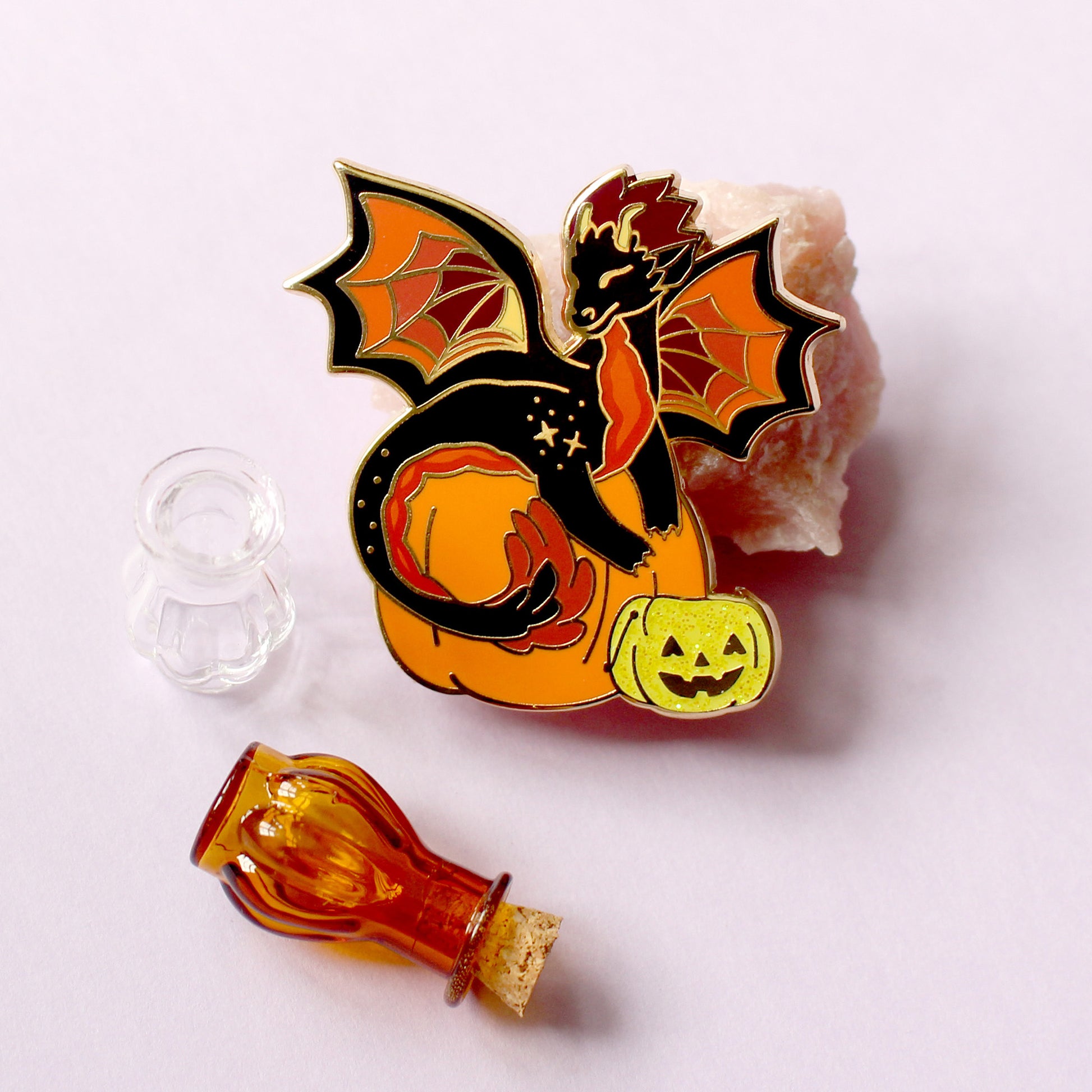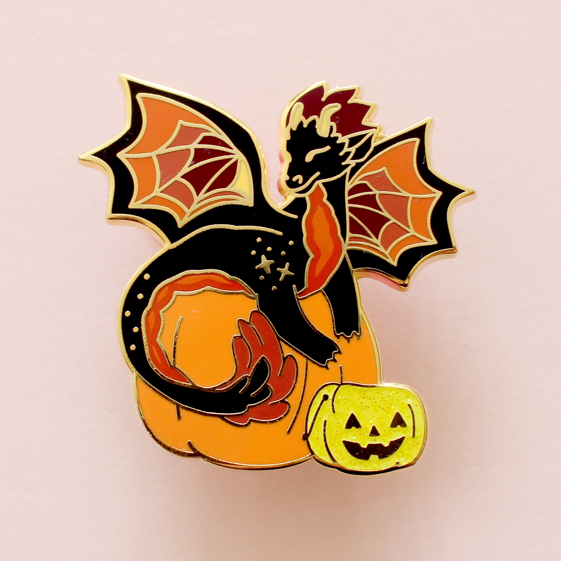 This awesome pin features a orange, yellow and purple dragon sitting on top of a pumpkin, with an acid green glittery pumpkin bucket front & centre.