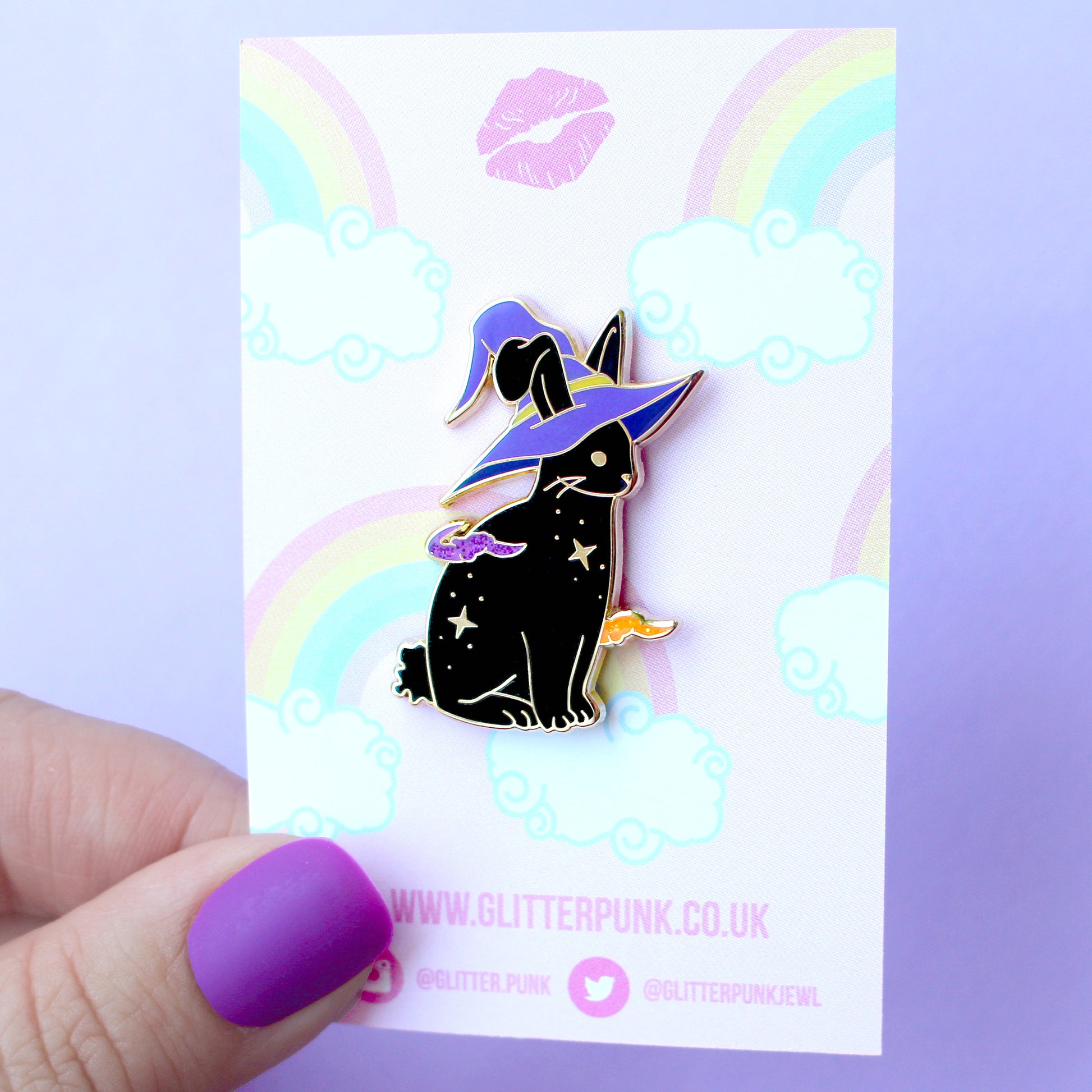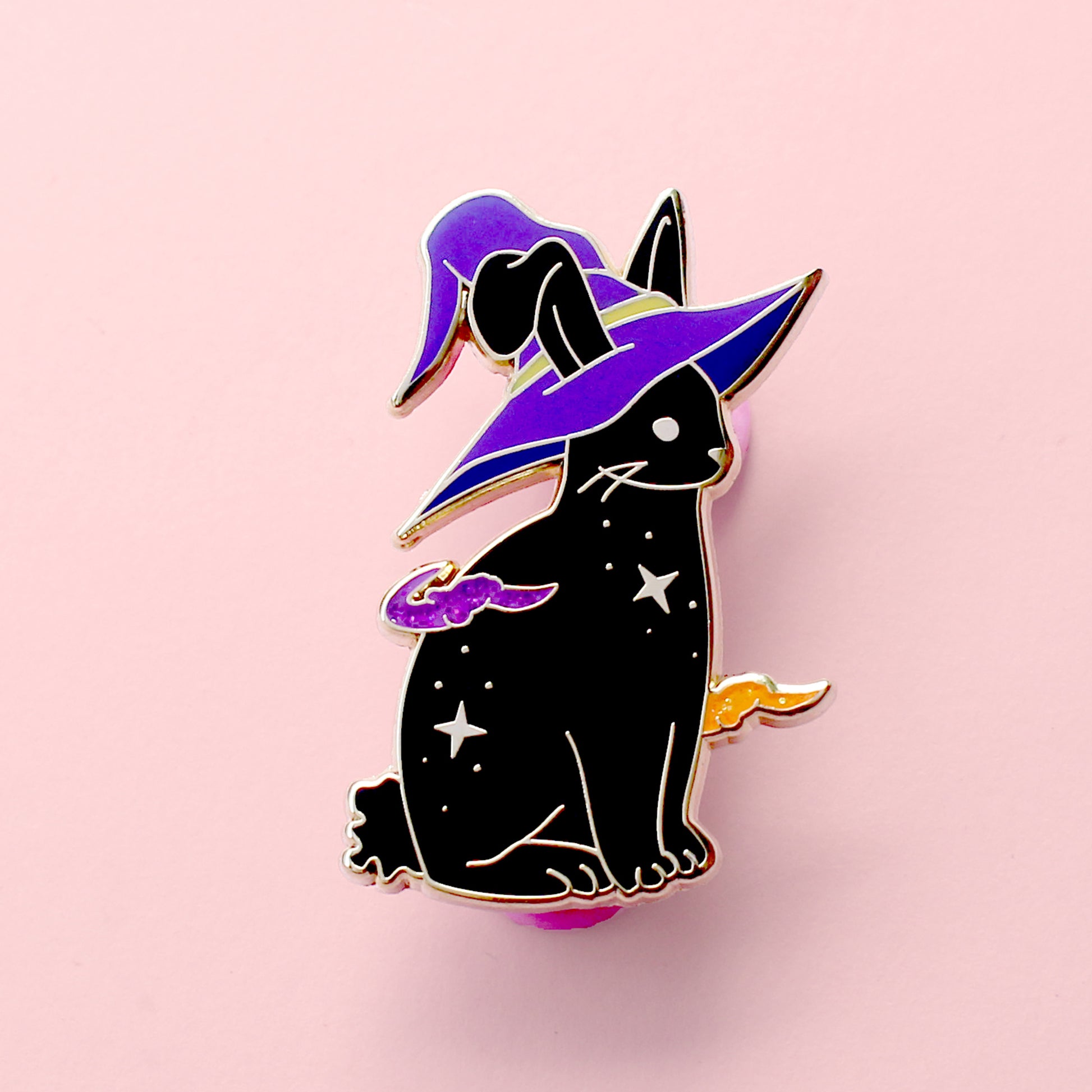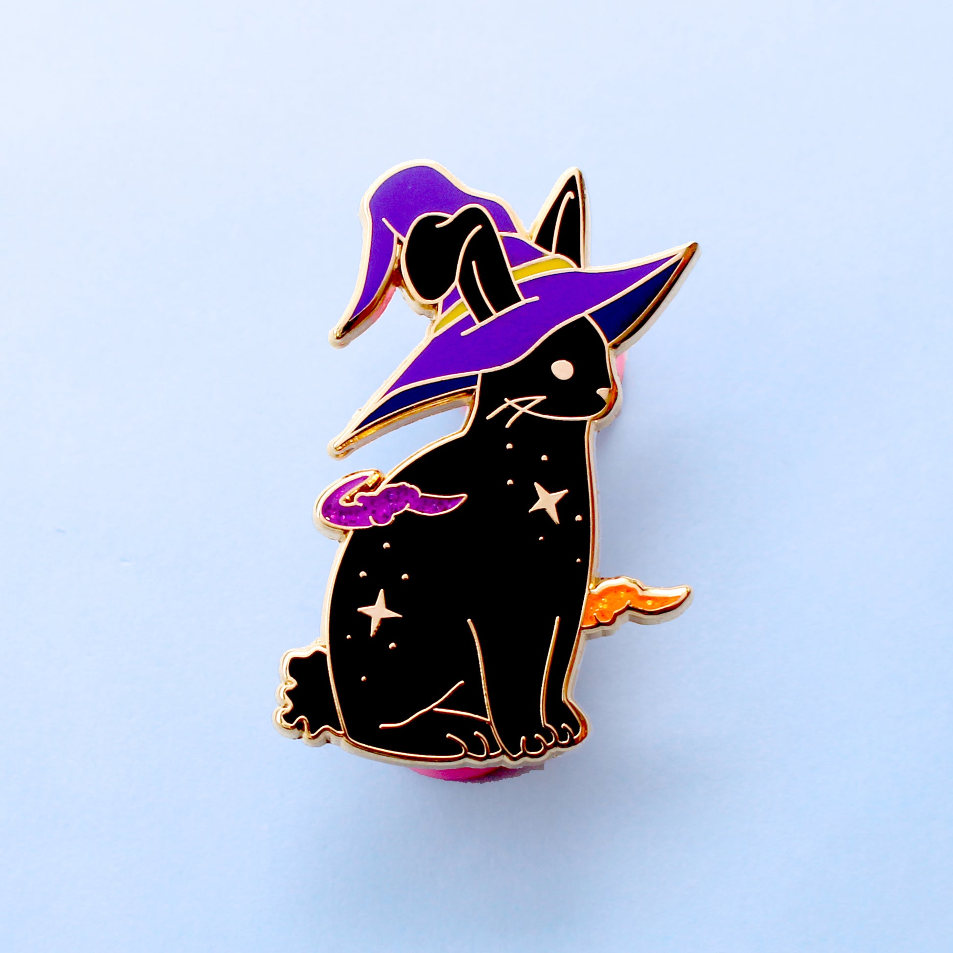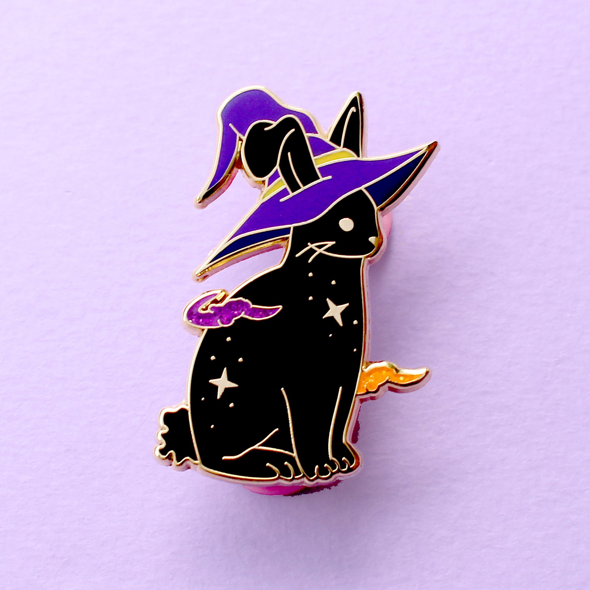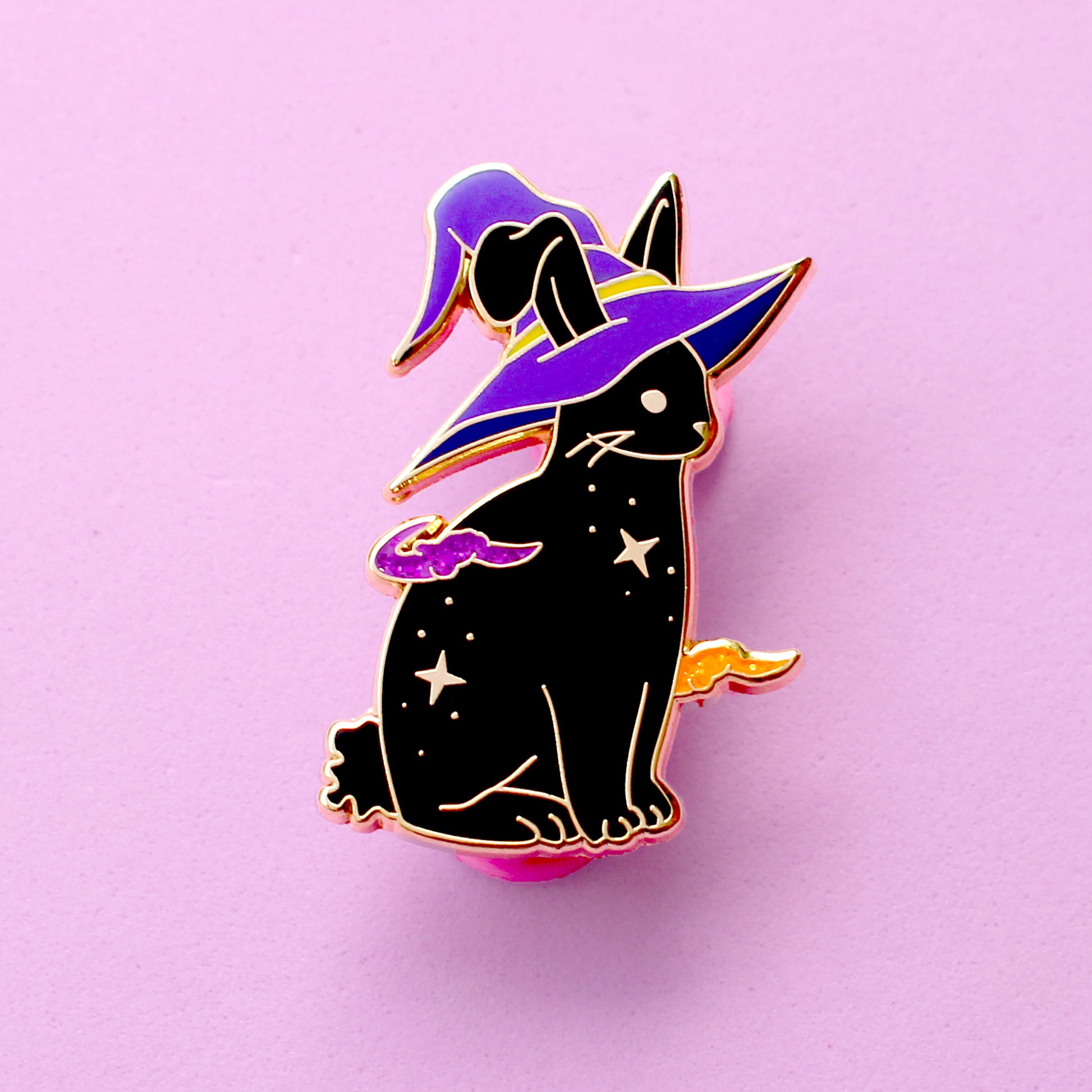 This pin features a black rabbit wearing a purple witches hat, surrounded by mystical glitter clouds.