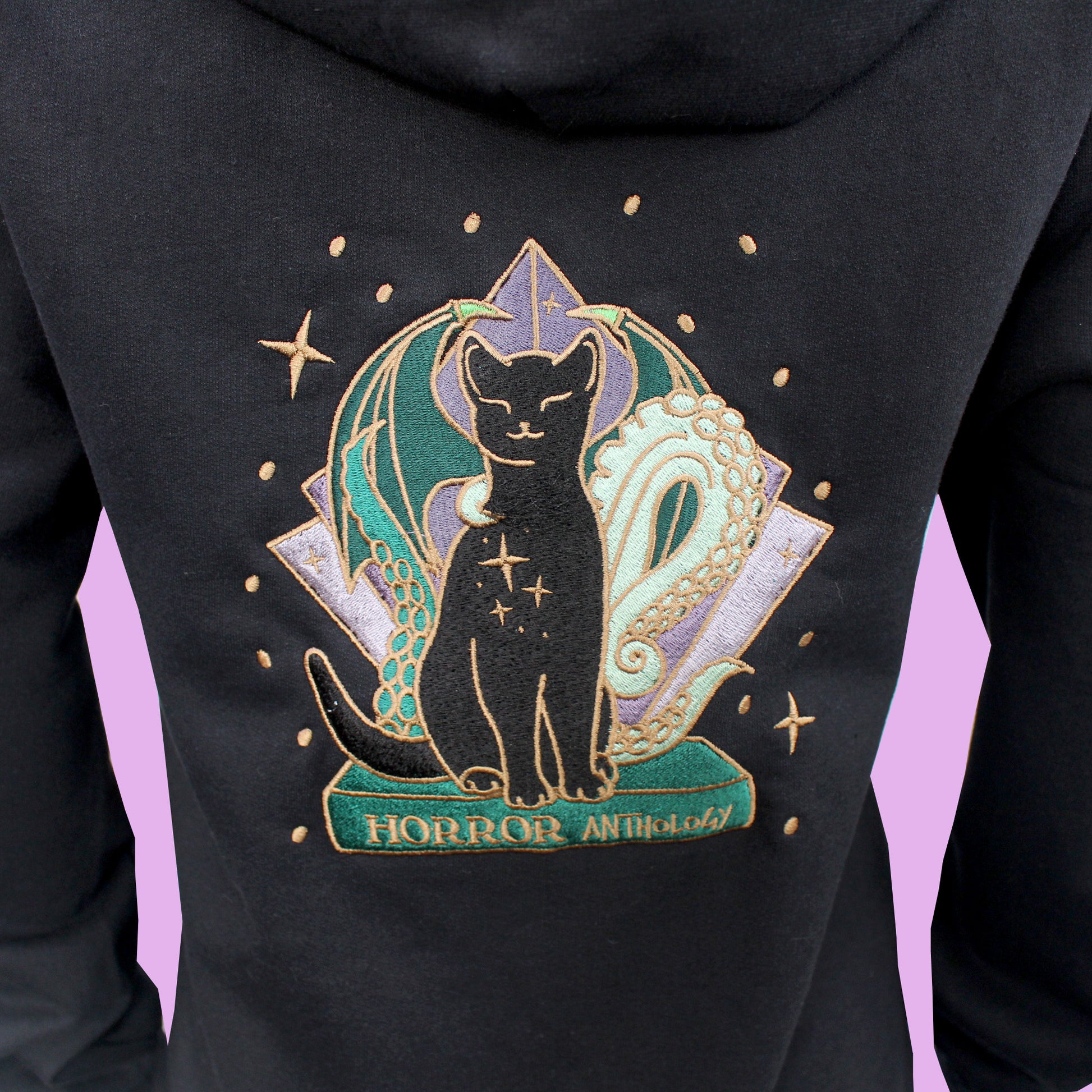 Made from a super soft cotton mix, this relaxed black unisex zip-up hoodie has the horror anthology cat embroidered onto the back, a green book on the front right chest, and starry sleeves.