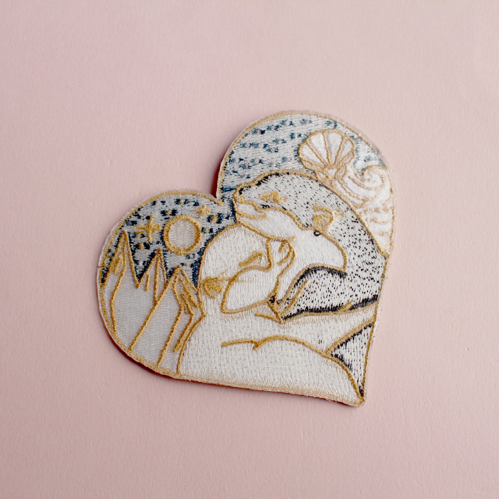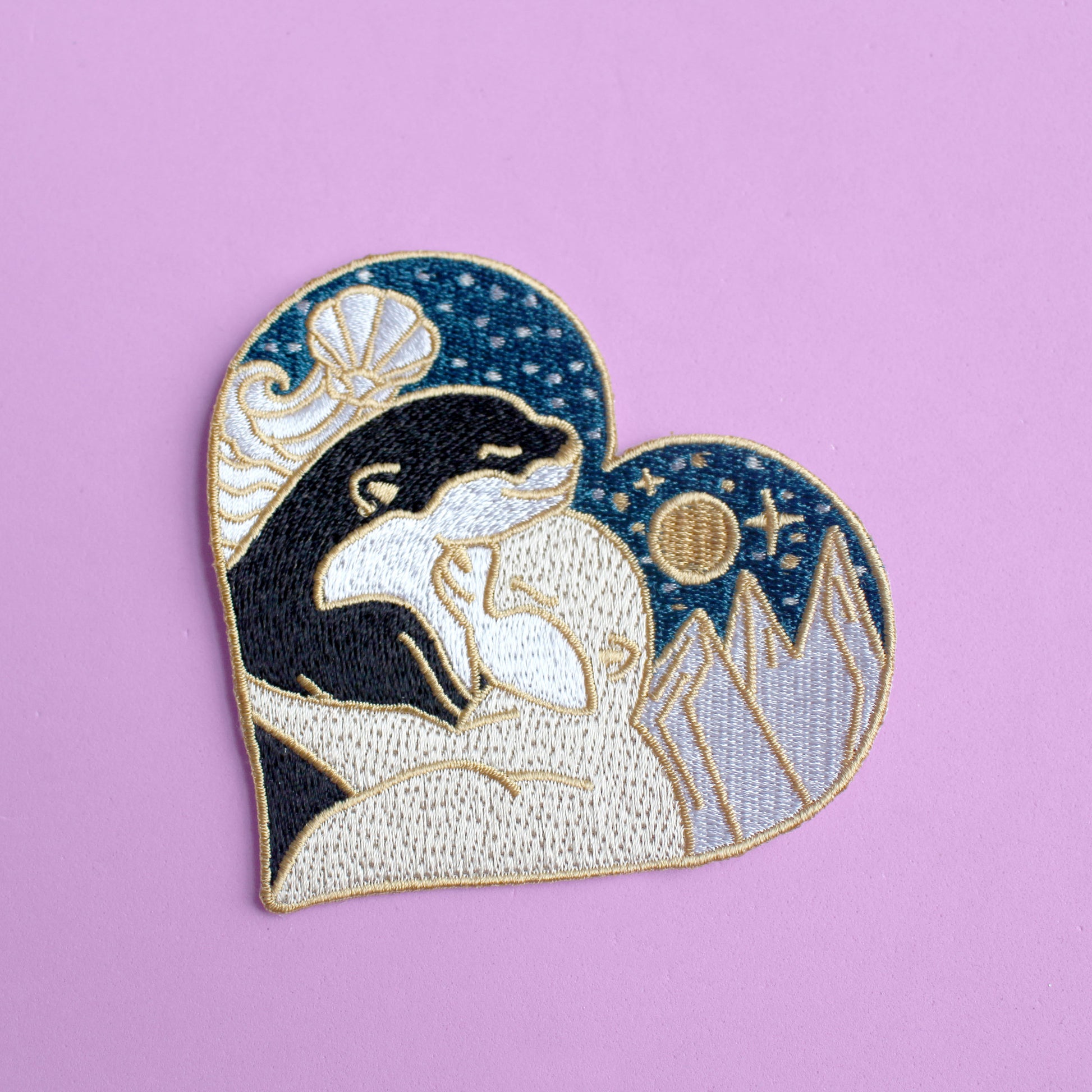 Express your love of all things otter with this in-love pair! And now it's available as an iron-on patch! Beautifully woven with black and gold threads, this fabulous 8.5cm patch will brighten up any coat, bag or hat!
