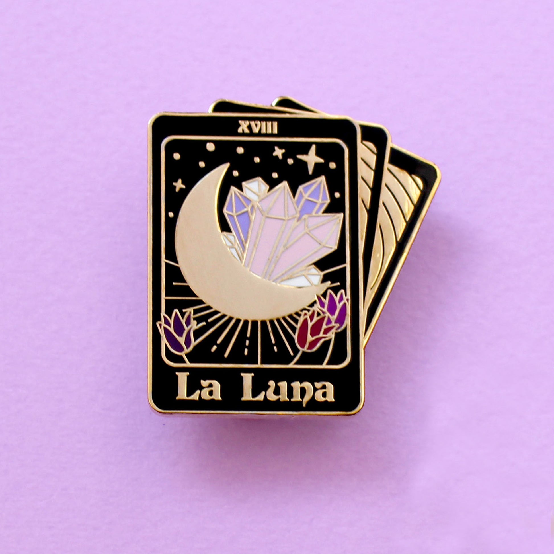Get your witchy vibes on with this awesome La Luna tarot card enamel pin! Made from gold hard enamel, this awesome pin features the moon tarot card surrounded by purple crystals and flowers! It has two back posts, and is presented on a cute Glitter Punk backing card.