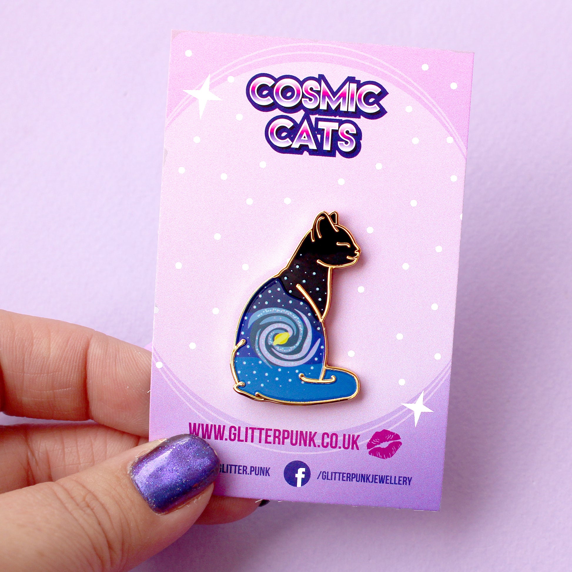 The pin is secured by two blue heart backs and comes on a special ‘Cosmic Cat’ Glitter Punk backing card, making it perfect for a gift or to keep as a special treat for yourself.