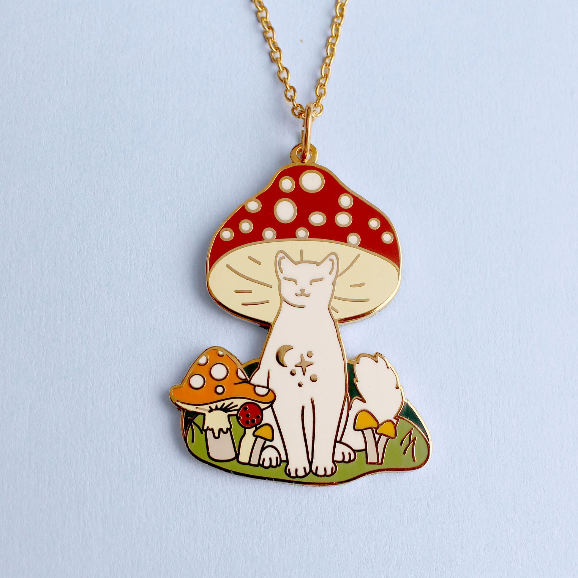 The autumnal vibes are strong with this super cute Mushroom Cat necklace! This fab necklace features a white cat wearing a toadstool on its head, surrounded by red, orange and yellow mini mushrooms.