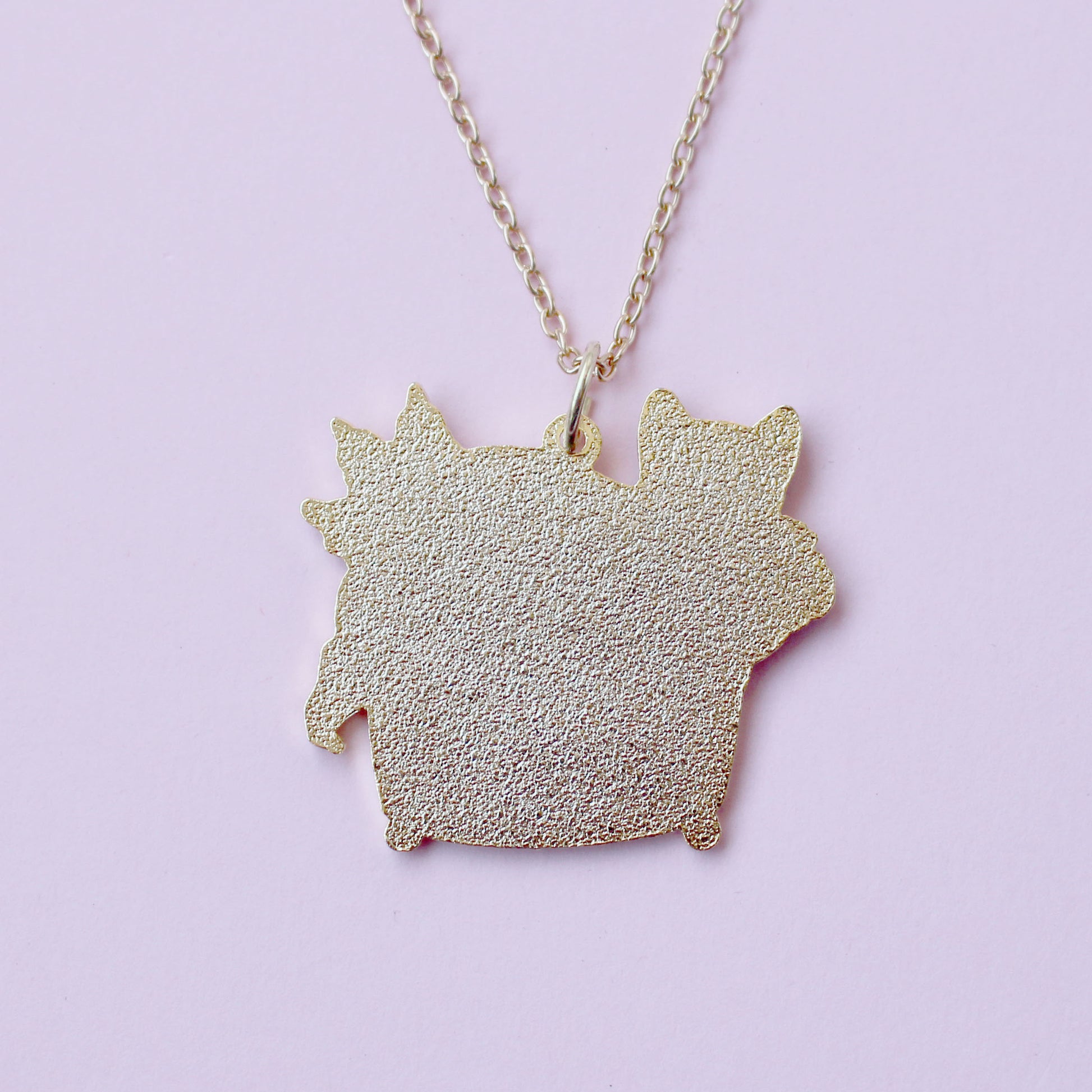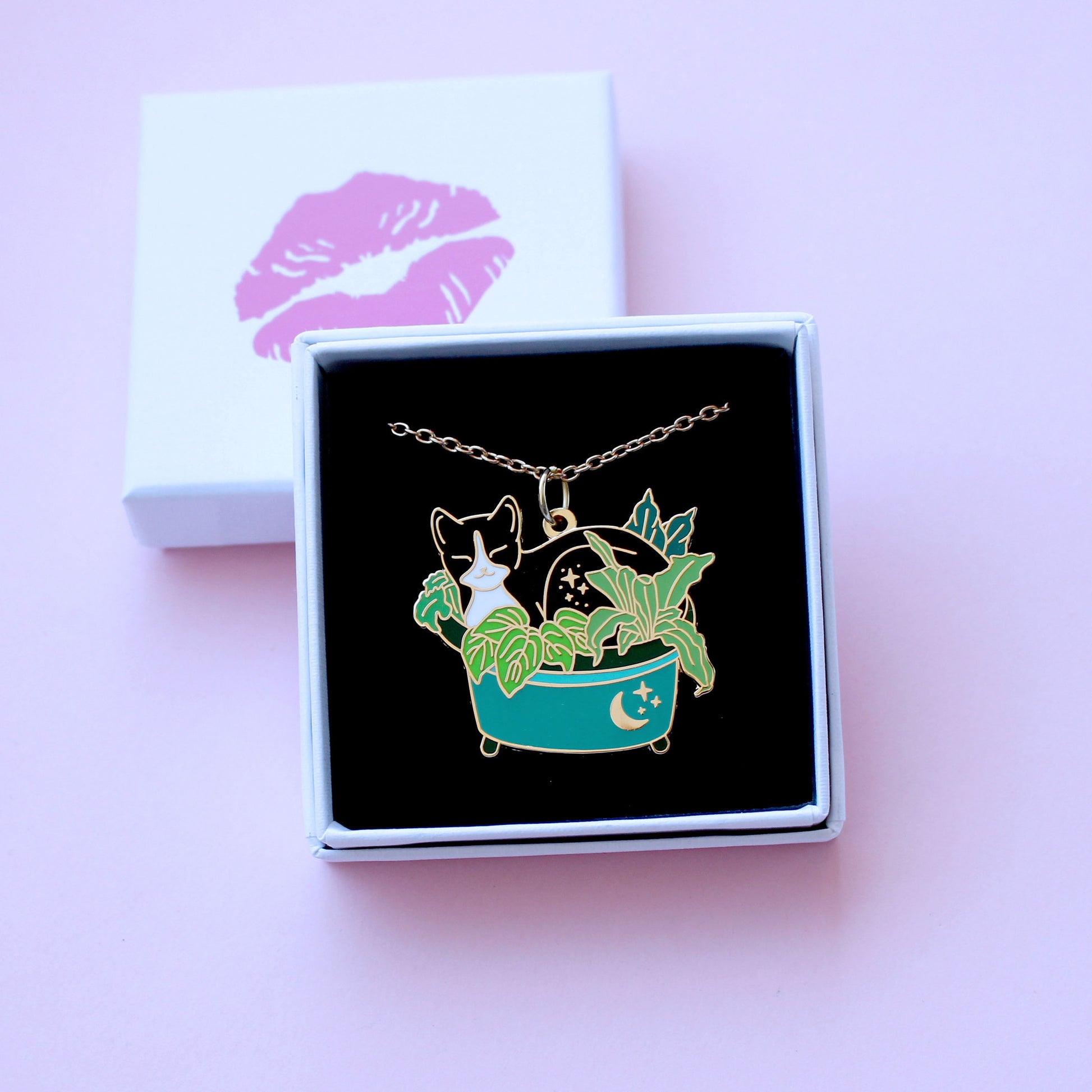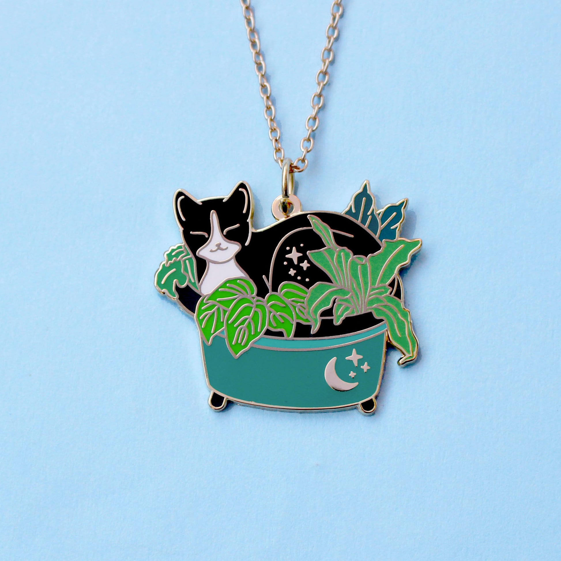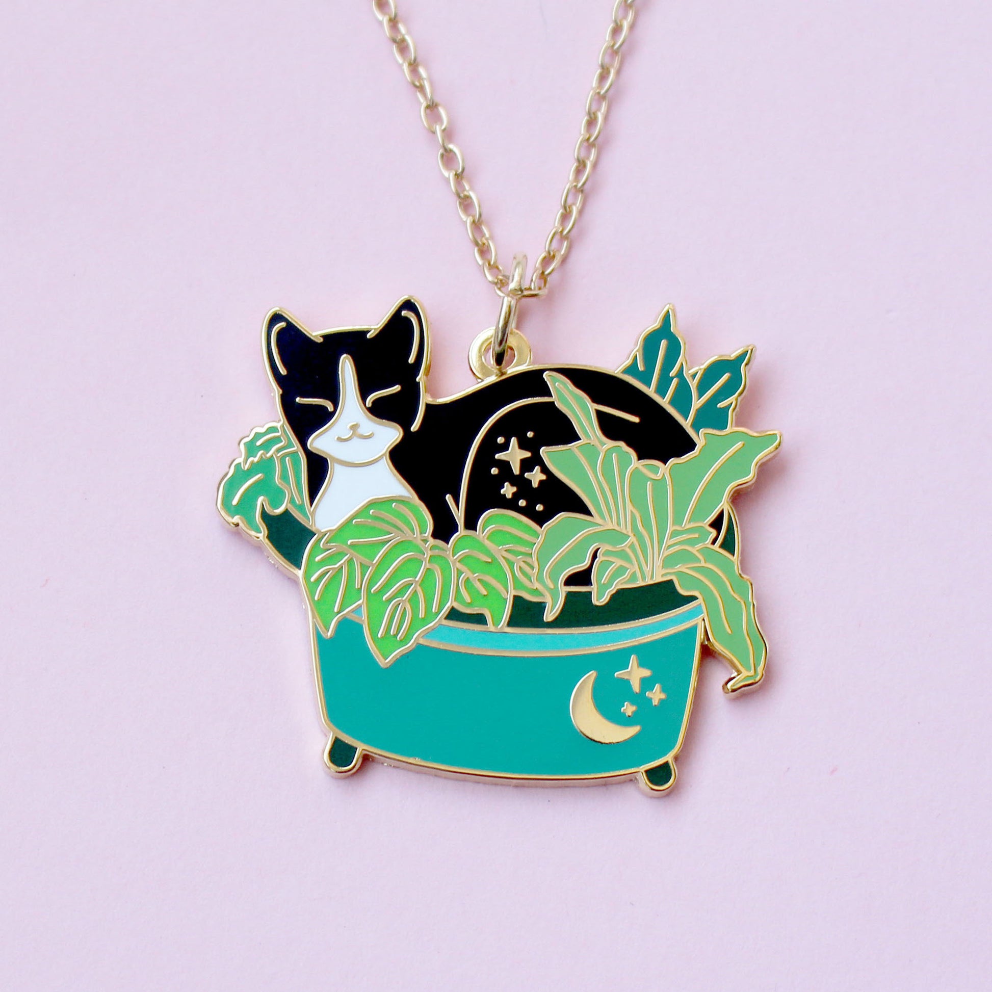 Any cat owner who has tried to keep their furry friend away from their best plants knows what a challenge it can be! This cute little necklace (originally a pin design) captures the moment the cat successfully snuck into the plants for a nap!