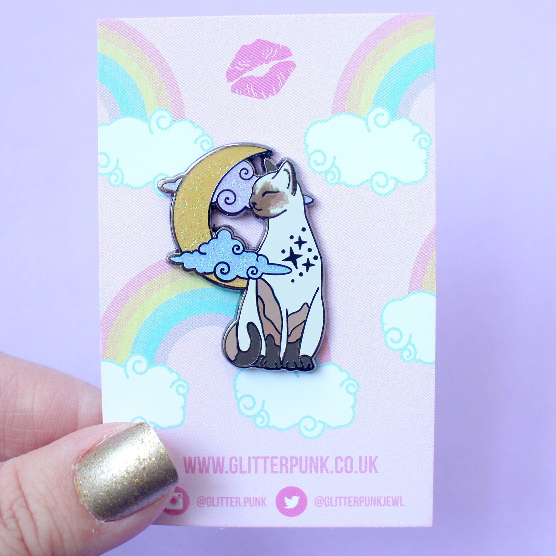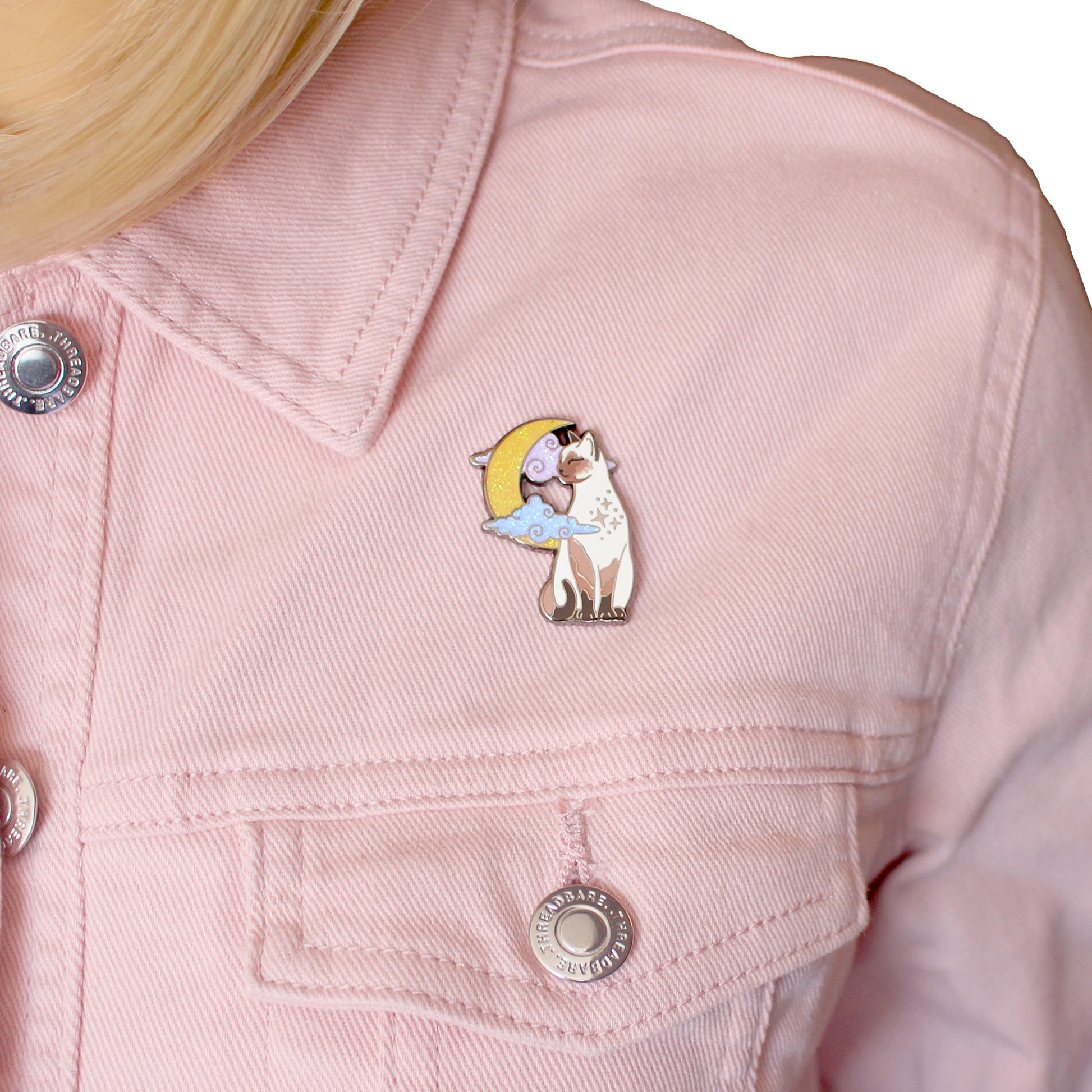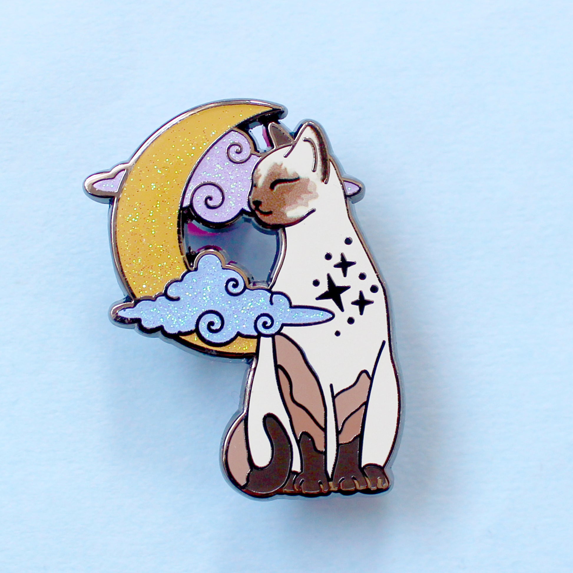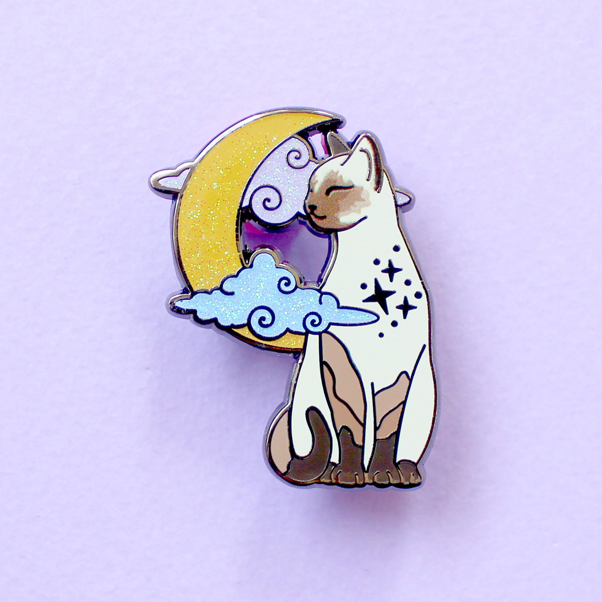 This super sweet enamel pin depicts a pointed cat in a relaxed moment, in front of a glittery moon and clouds.