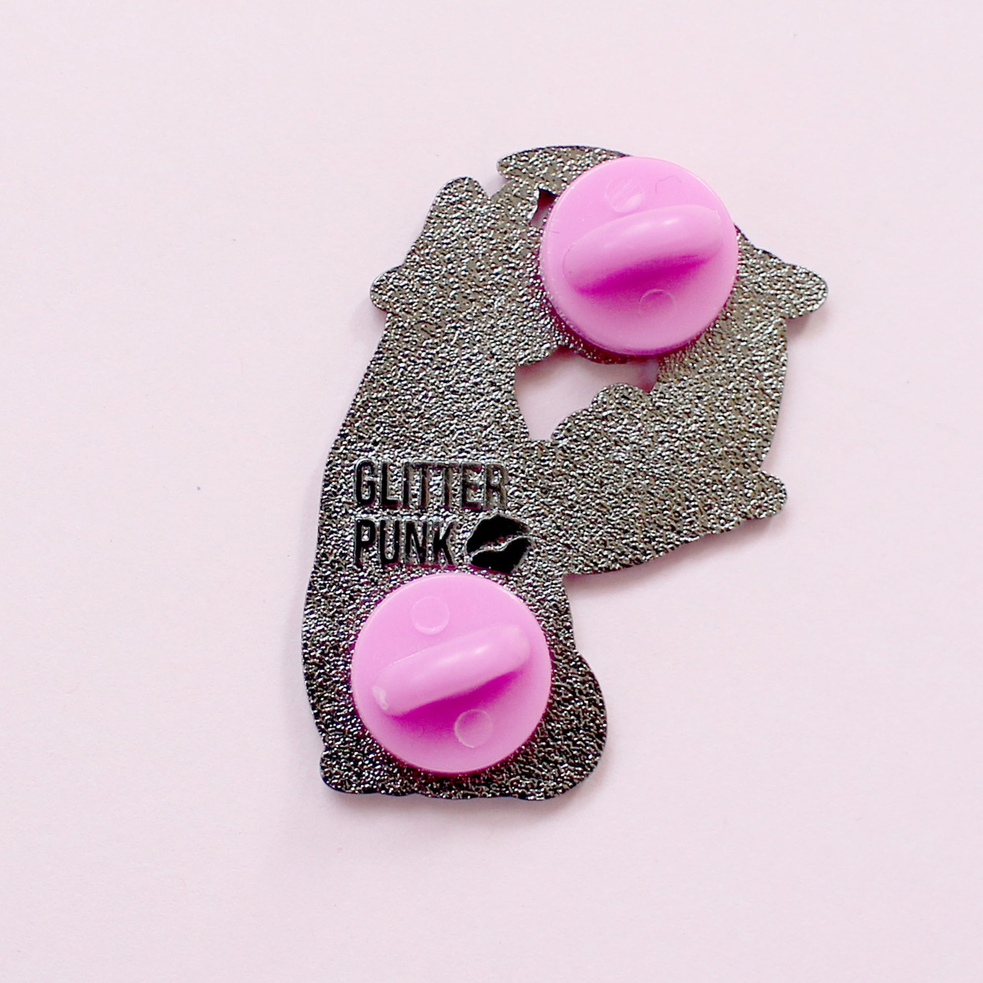 The pin is 36mm tall, and is made from gunmetal hard enamel, with glitter and screen printed details. It's secured with 2 pink clutches to keep the pin in place.