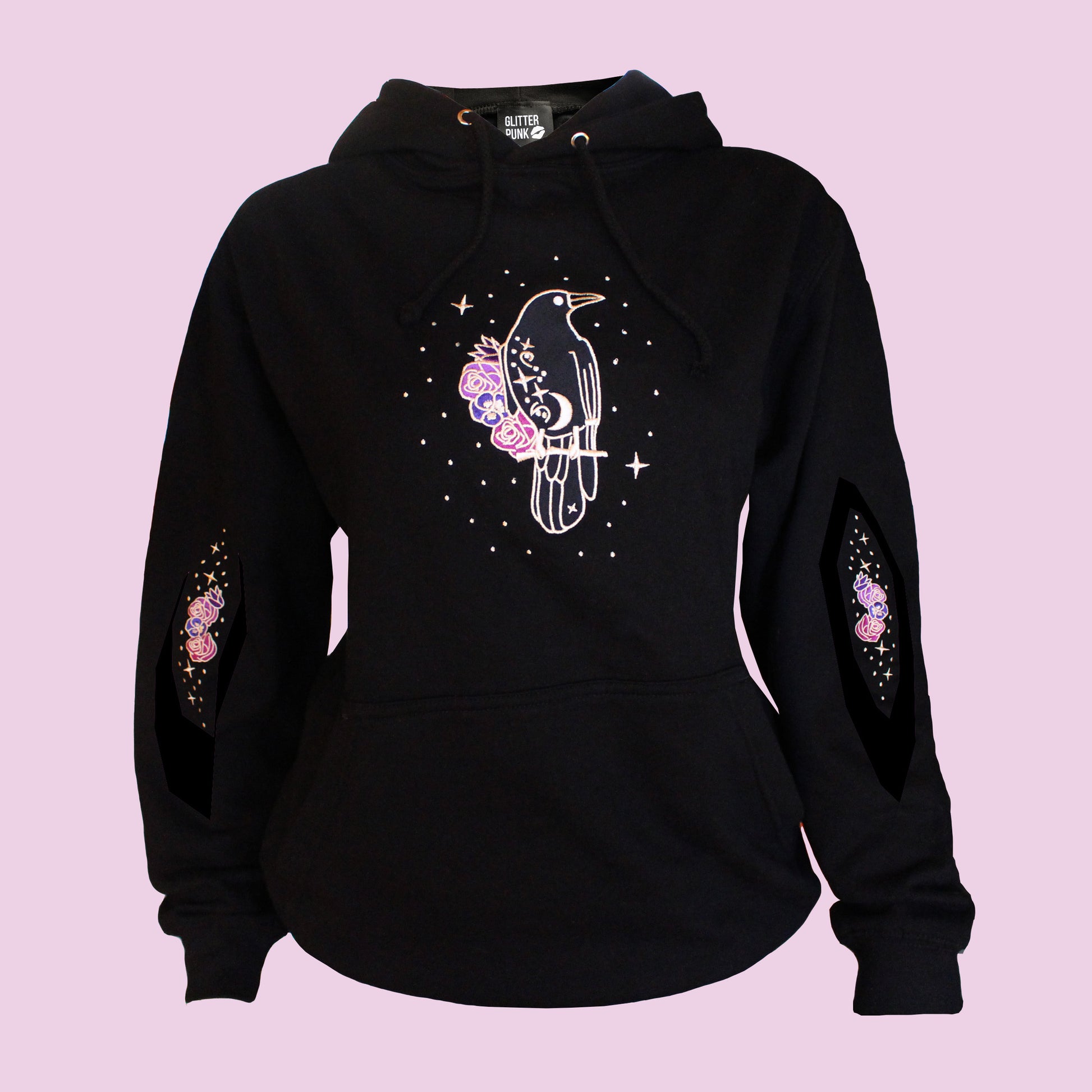 Stand out with a Crow Hoodie, featuring an embroidered black and gold crow surrounded by purple flowers and decorative stars.