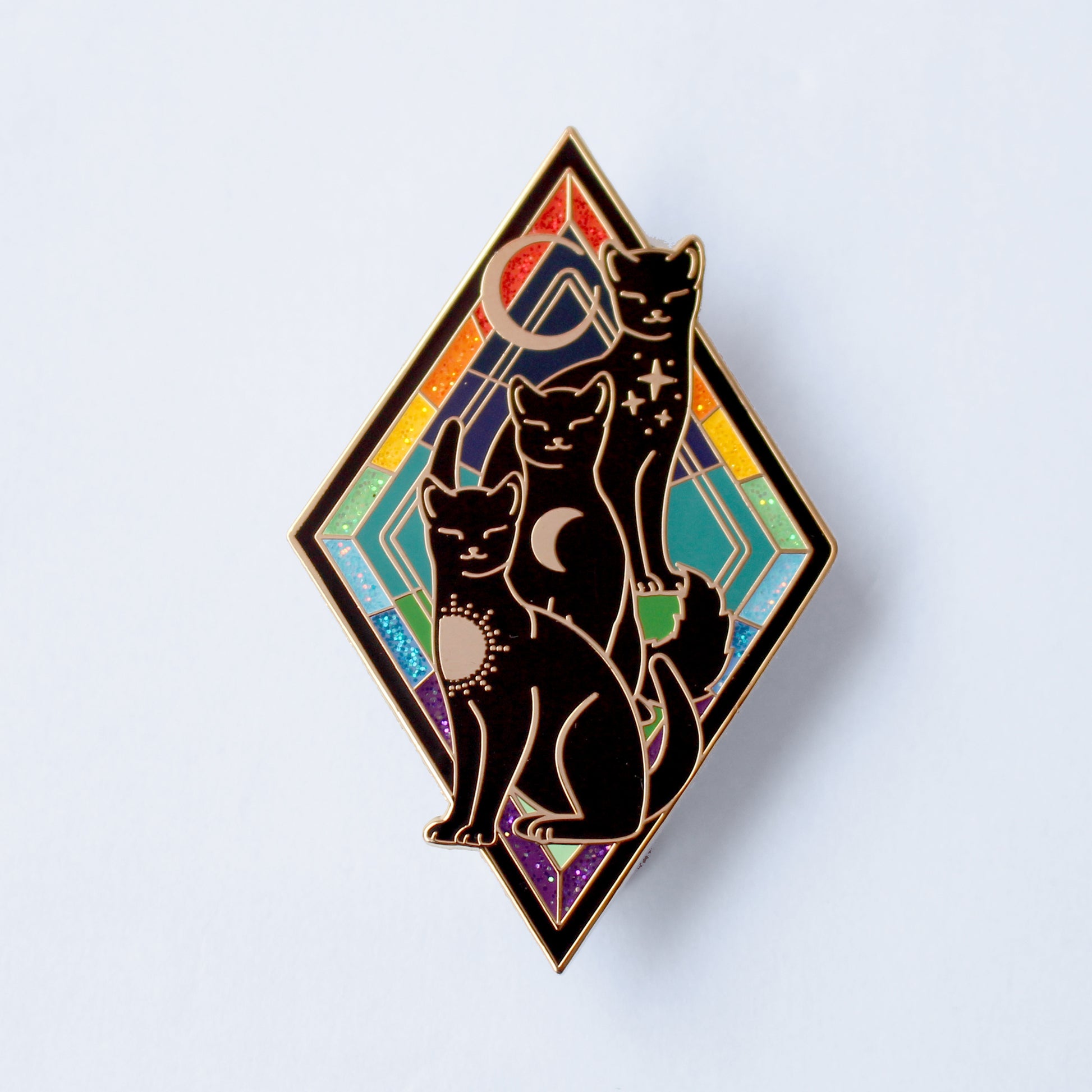 This fabulous Rainbow Cats pin features 3 black cats adorned with the sun, moon & stars. They are surrounded by a glittery rainbow triangle!