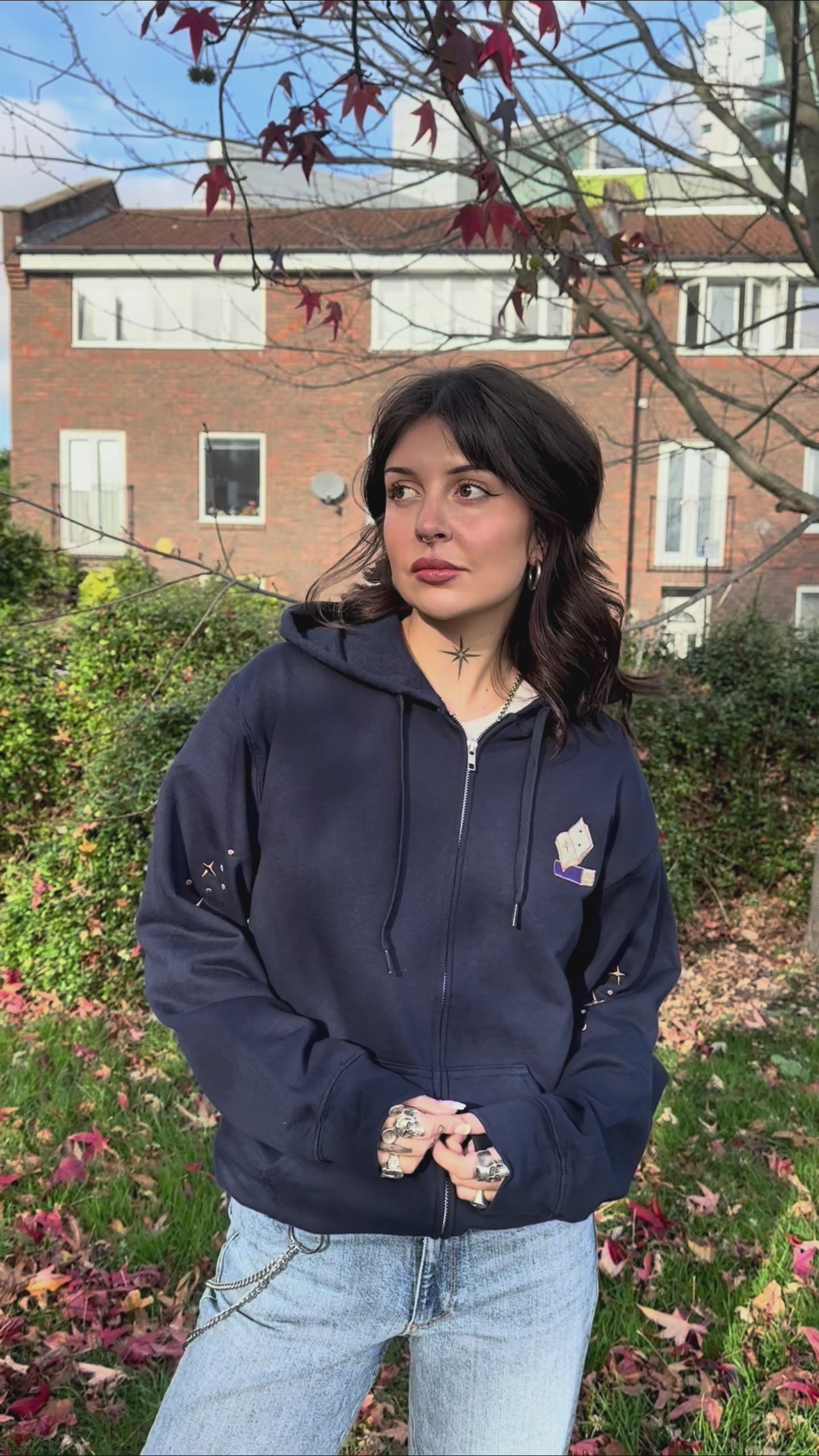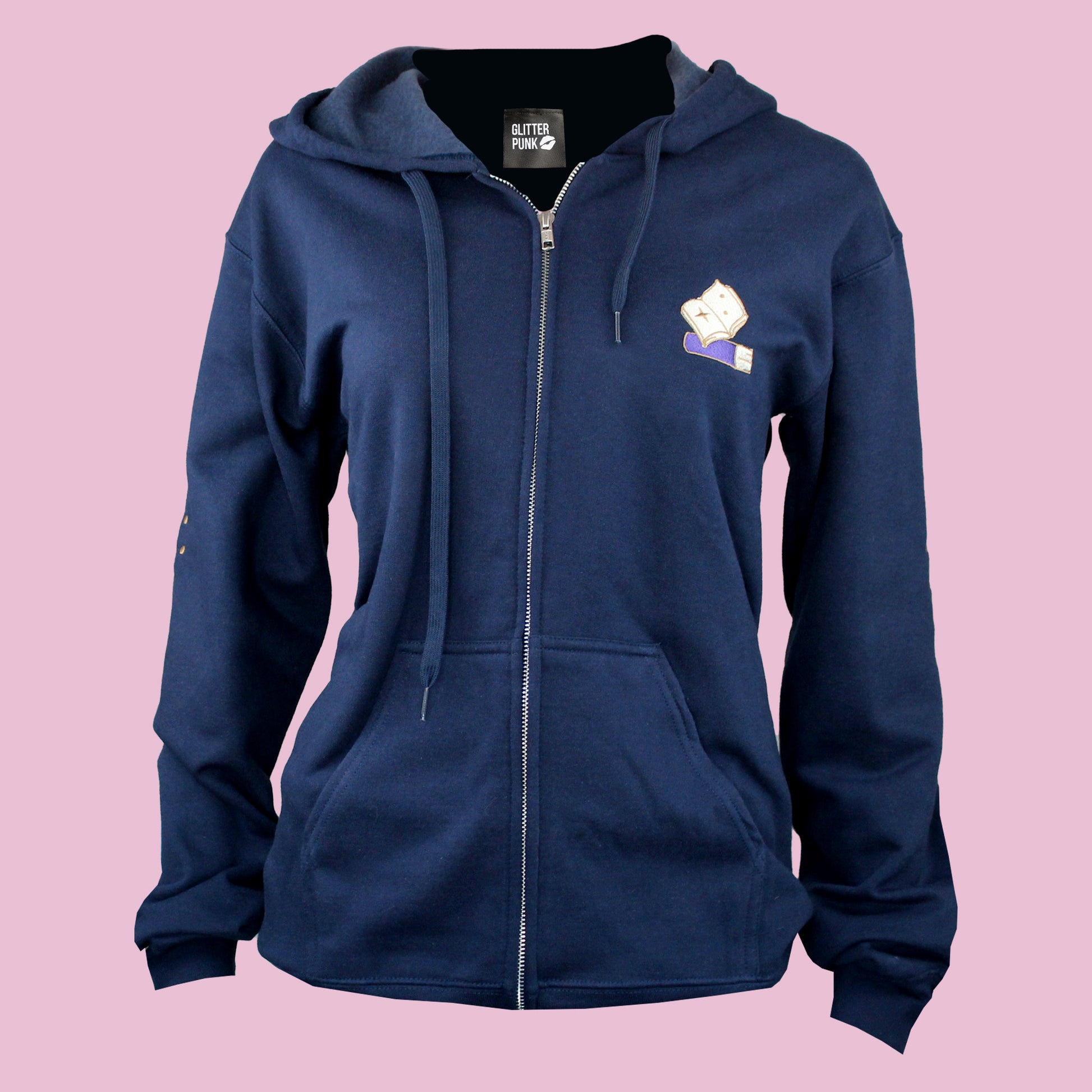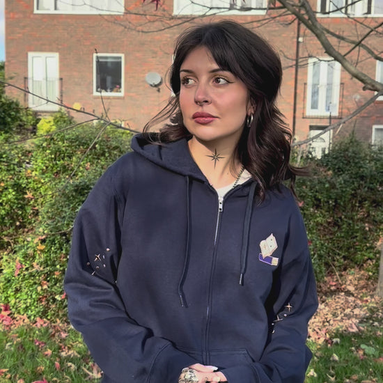 Made from a super soft cotton mix, this relaxed navy unisex zip-up hoodie has the 'Reality is Overrated' design embroidered onto the back, a mini book on the front right chest, and starry sleeves.