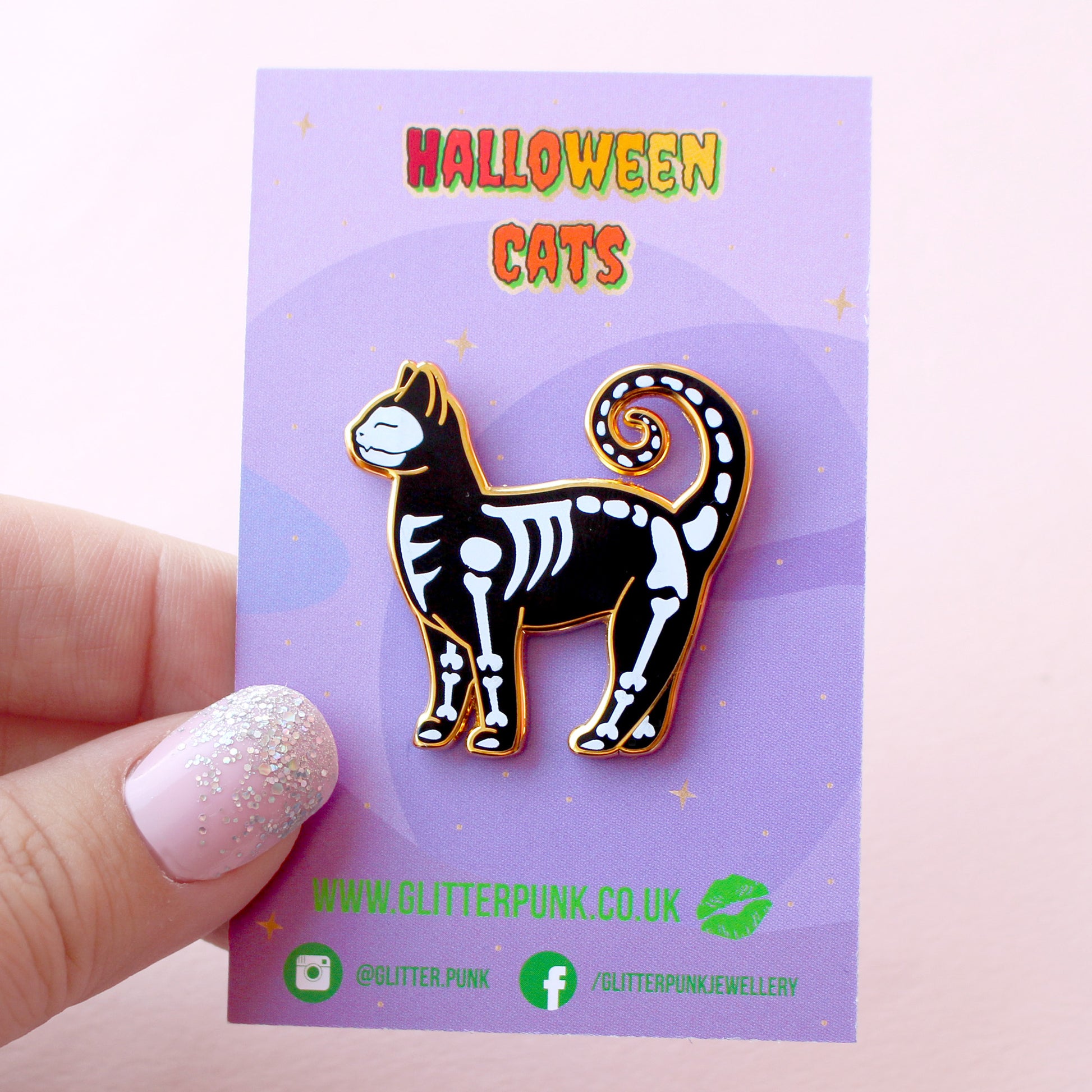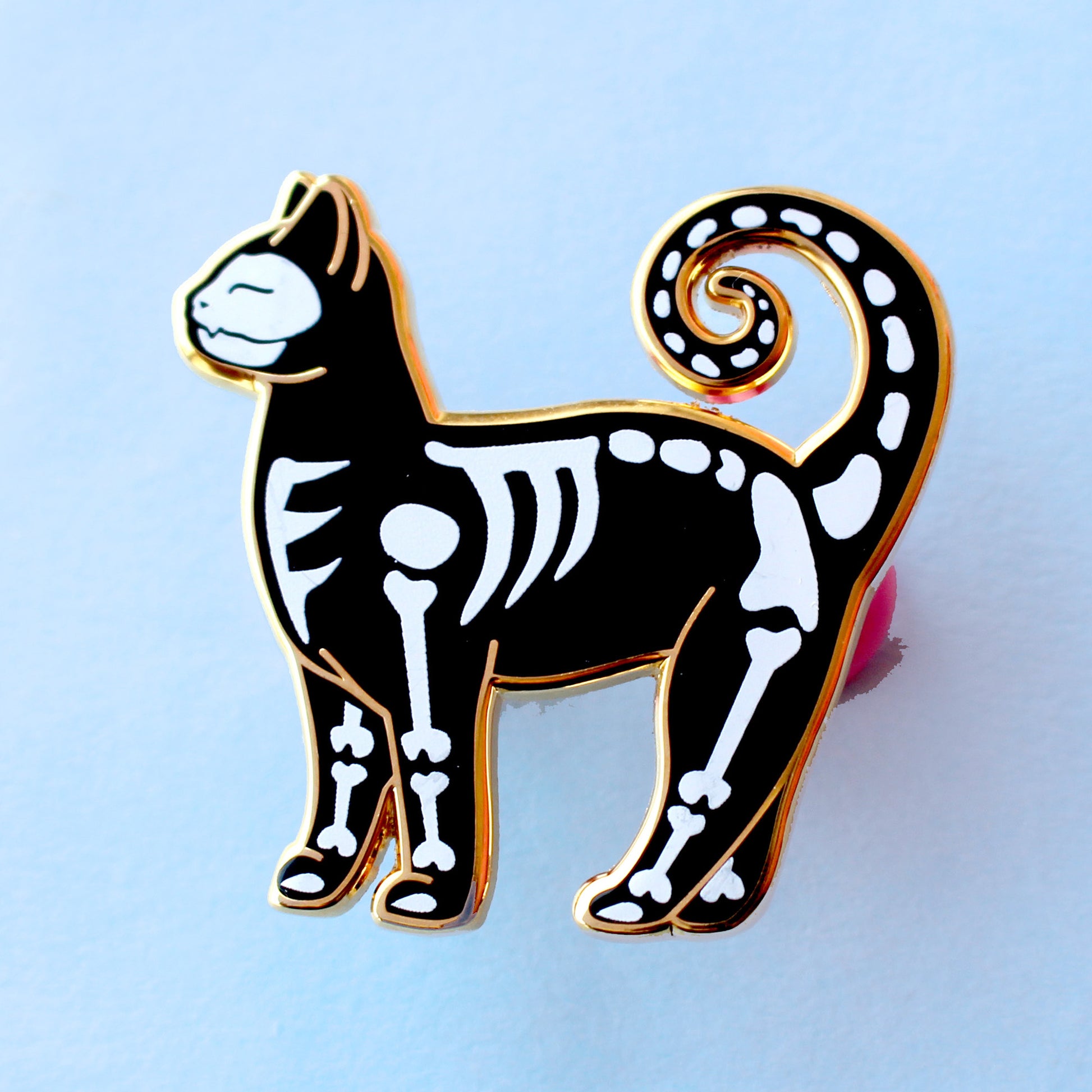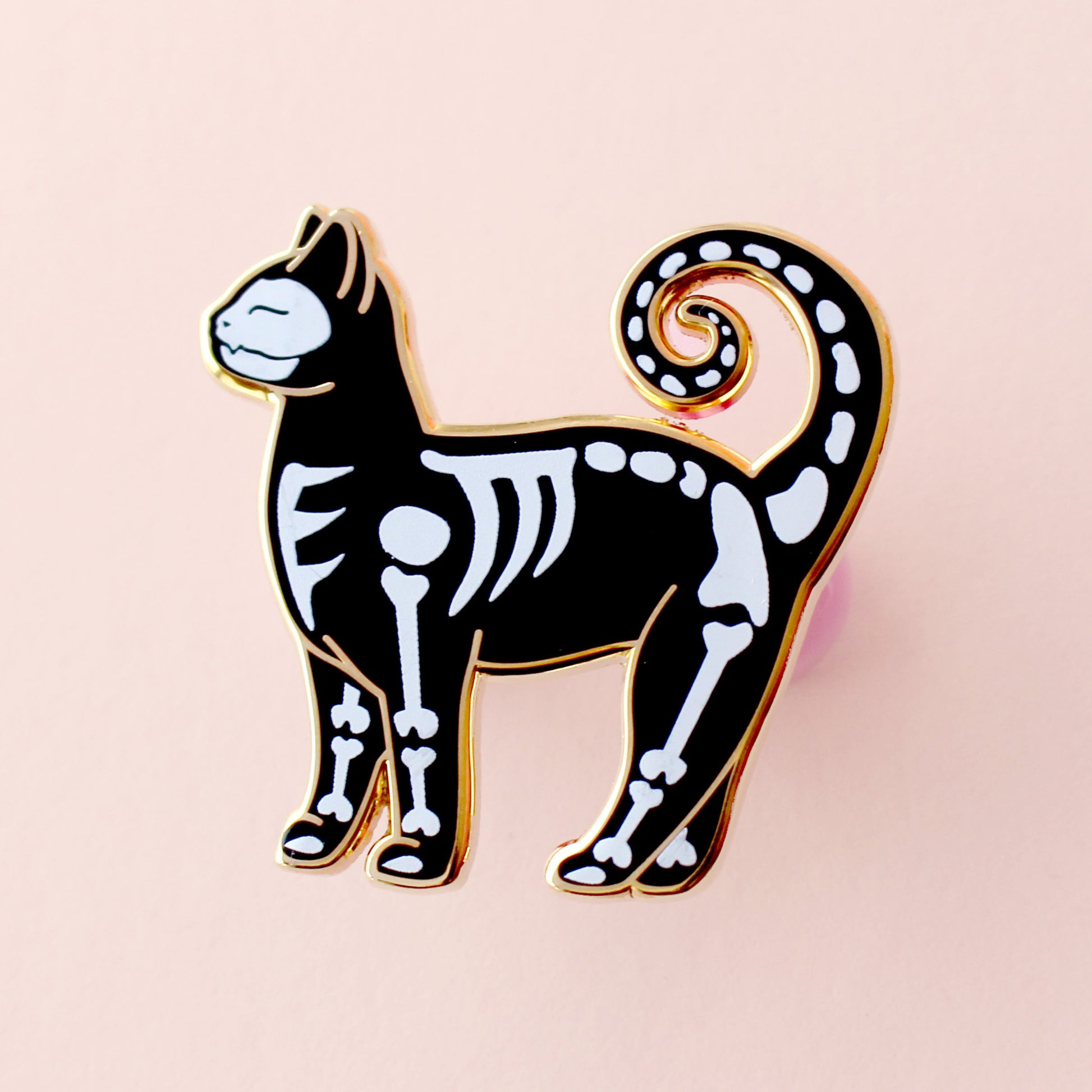 This fab pin features a black cat with skeleton markings, created with screen print.
