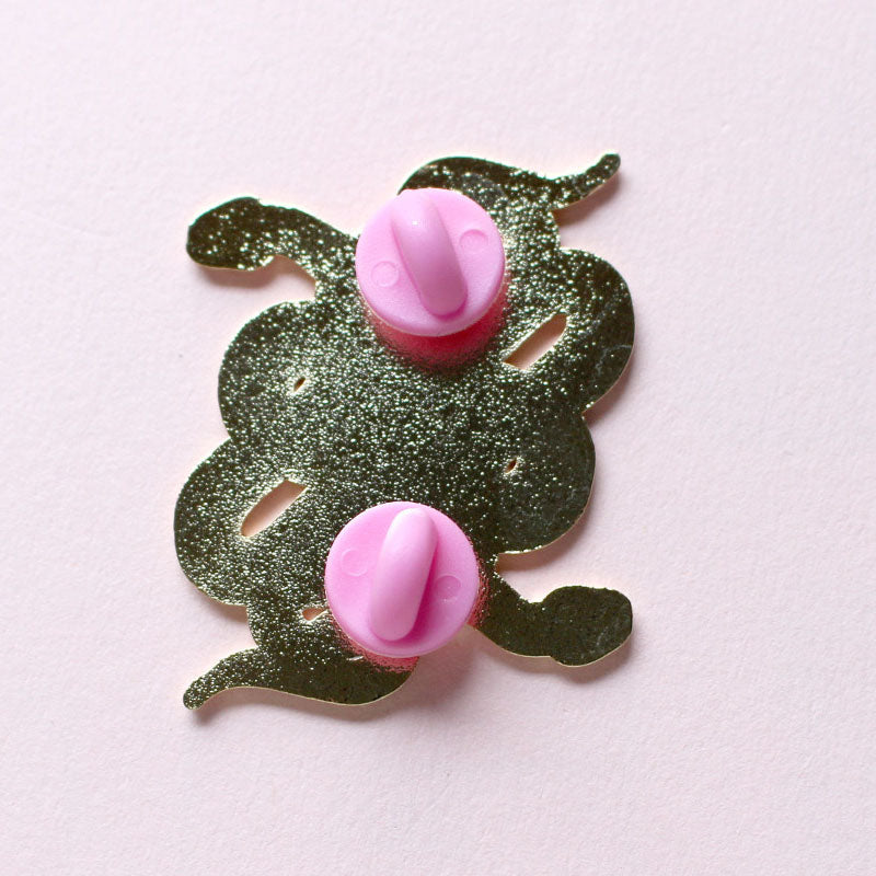 If you love snakes this cute intertwined Black & White Snake enamel pin is the one for you! This 40mm gold hard enamel pin features a black snake with stars on it’s body and a white snake with hearts.
