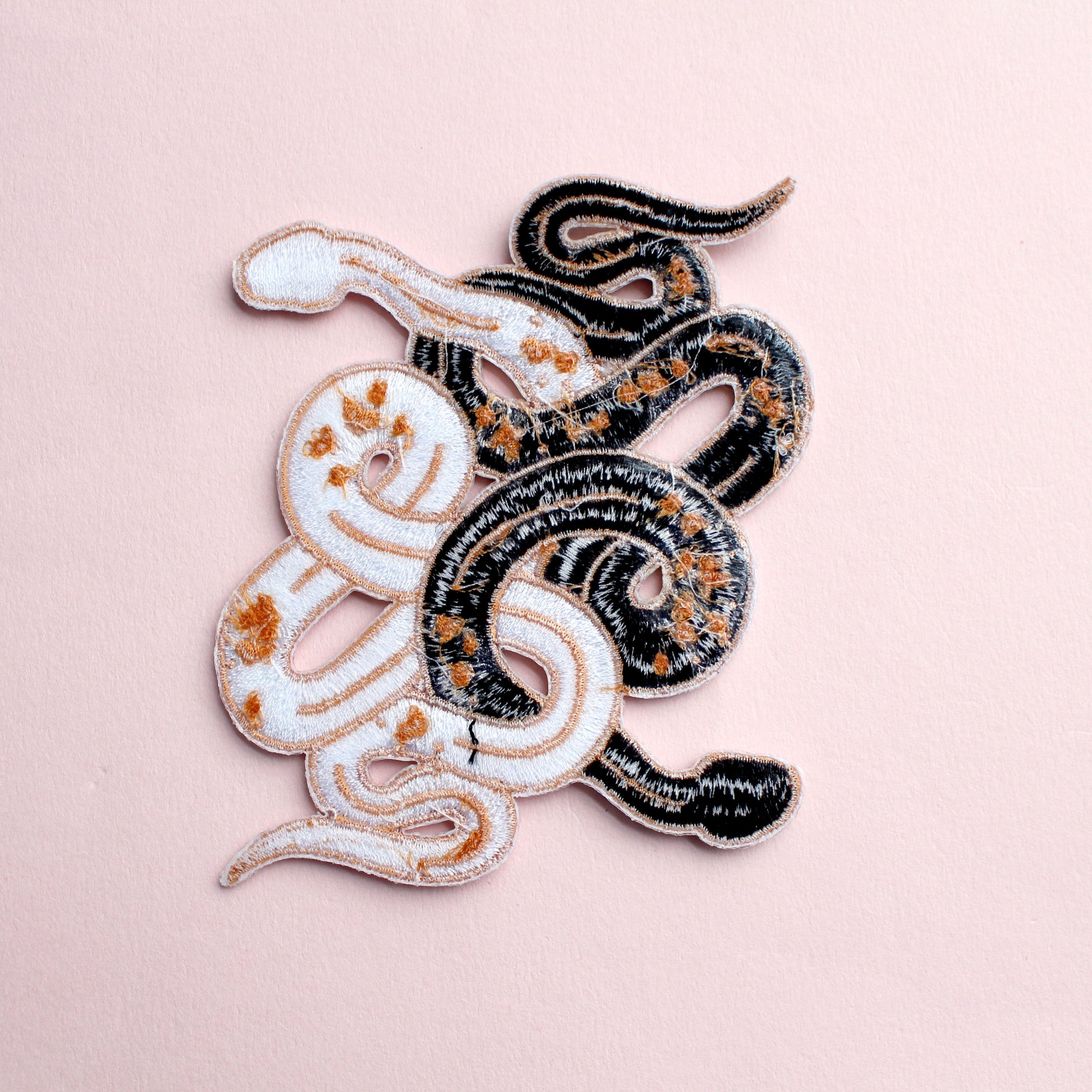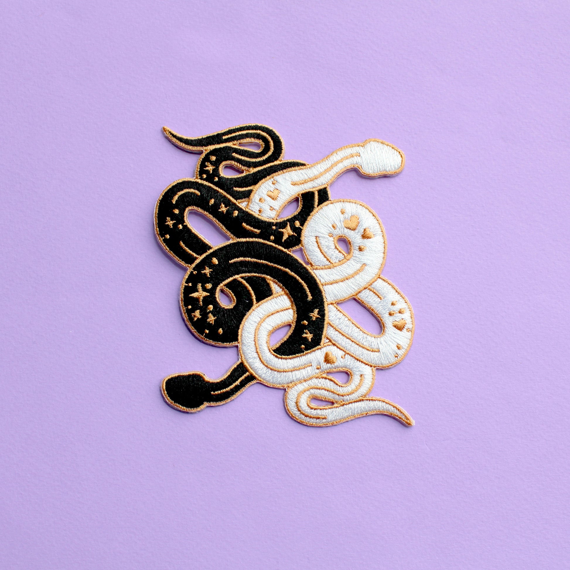 If you love snakes this cute intertwined Black & White Snake design is the one for you! And now it's available as an iron-on patch! Beautifully woven with black, white and gold threads, this fabulous 10cm patch will brighten up any coat, bag or hat!