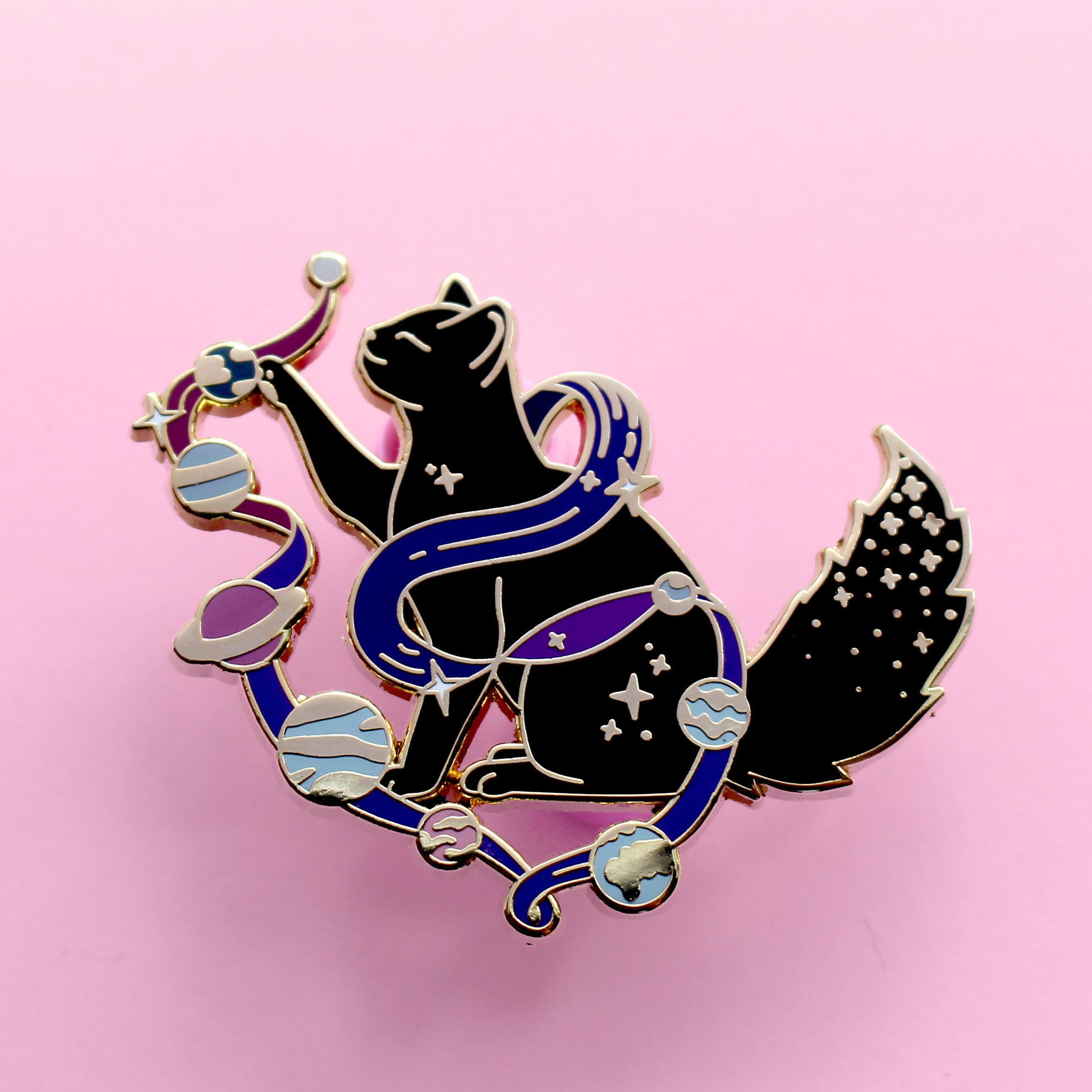 This fantasy enamel pin features a black cat playing with the planets in our solar system. Perfect for anybody who loves cats & outer space!