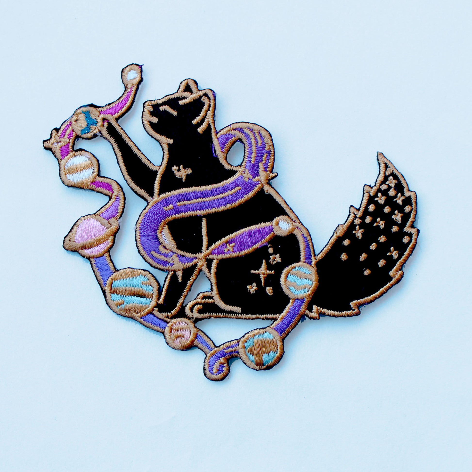 This fantasy embroidered patch features a black cat playing with the planets in our solar system. Perfect for anybody who loves cats & outer space!