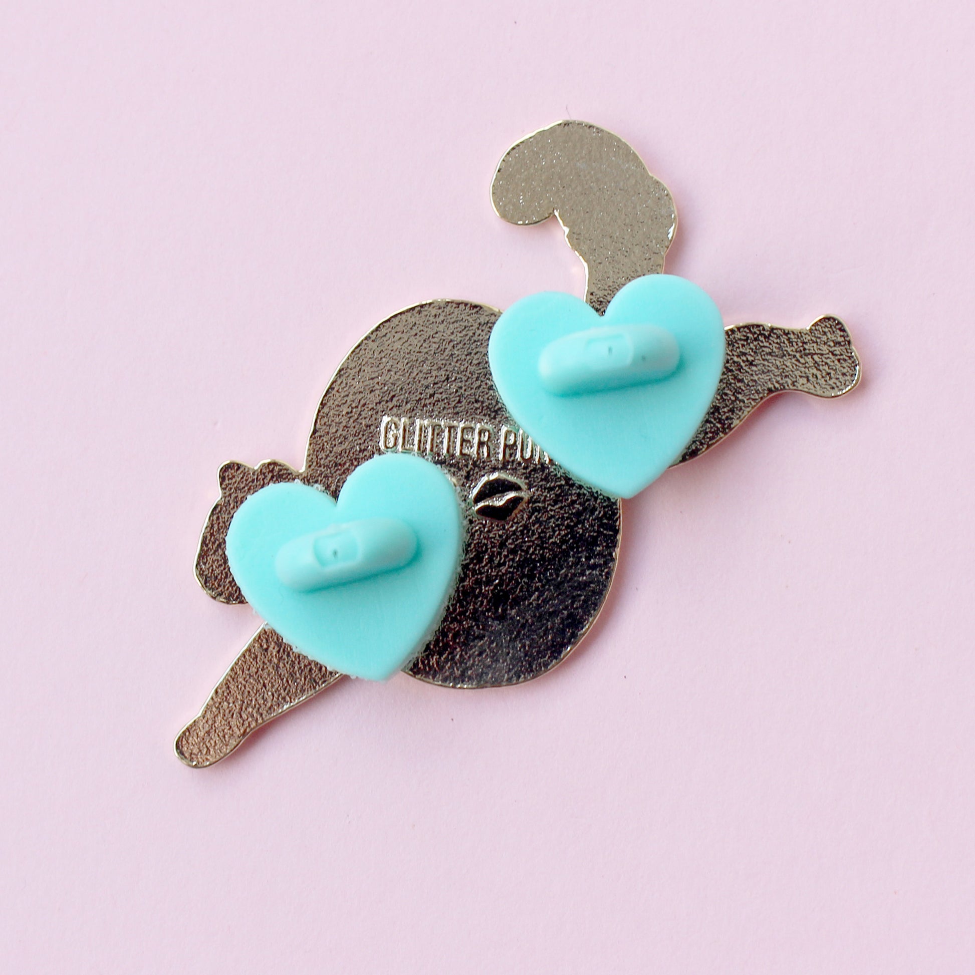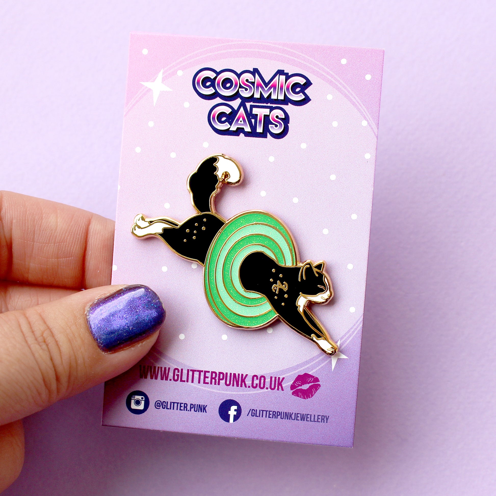 The pin is secured by two green heart backs and comes on a special ‘Cosmic Cat’ Glitter Punk backing card, making it perfect for a gift or to keep as a special treat for yourself.
