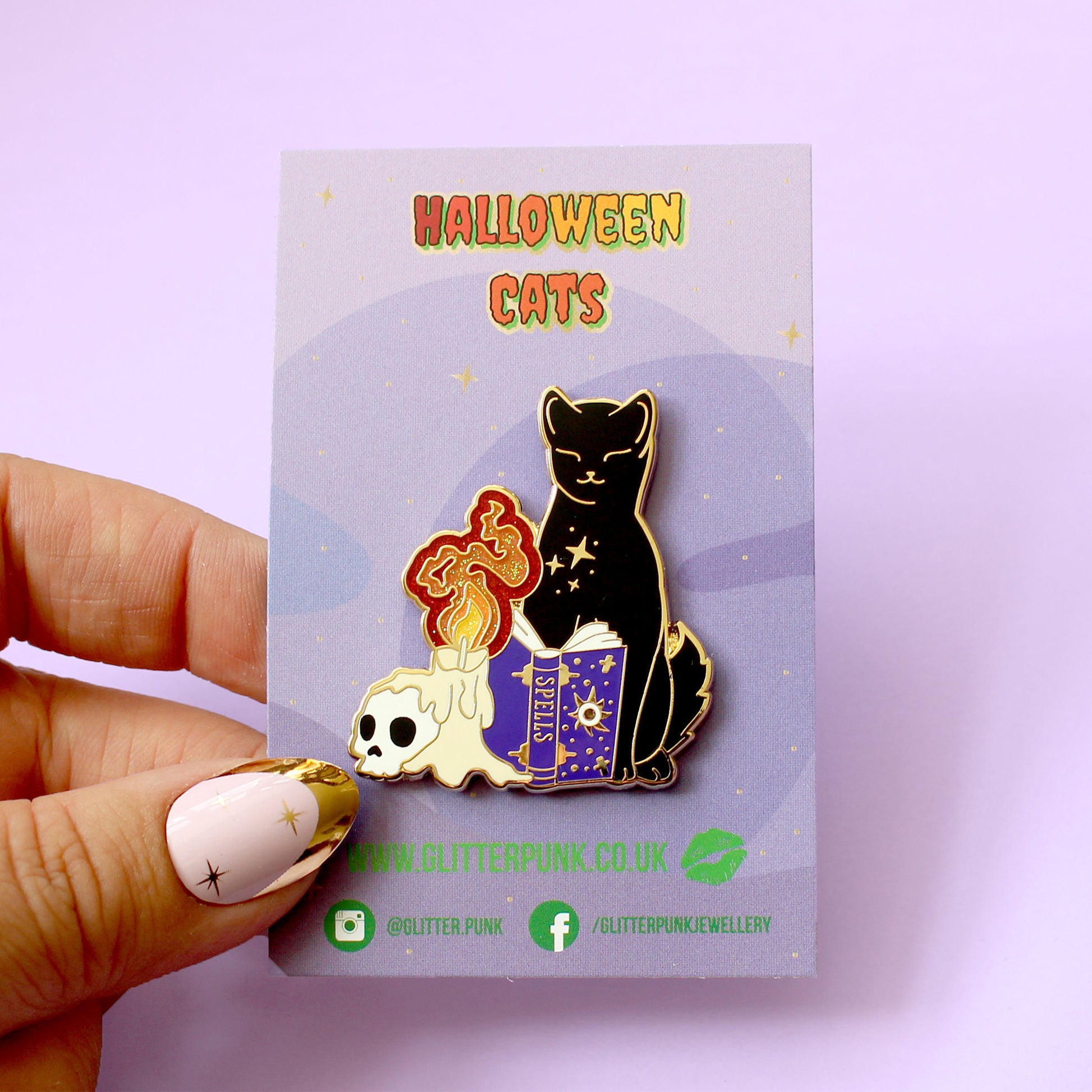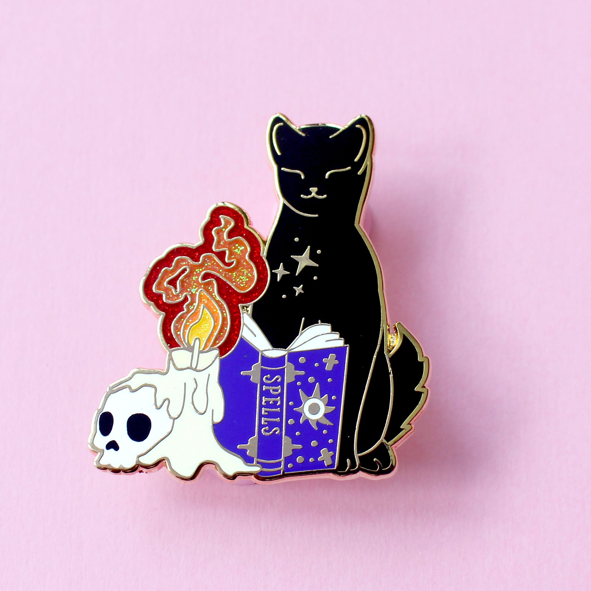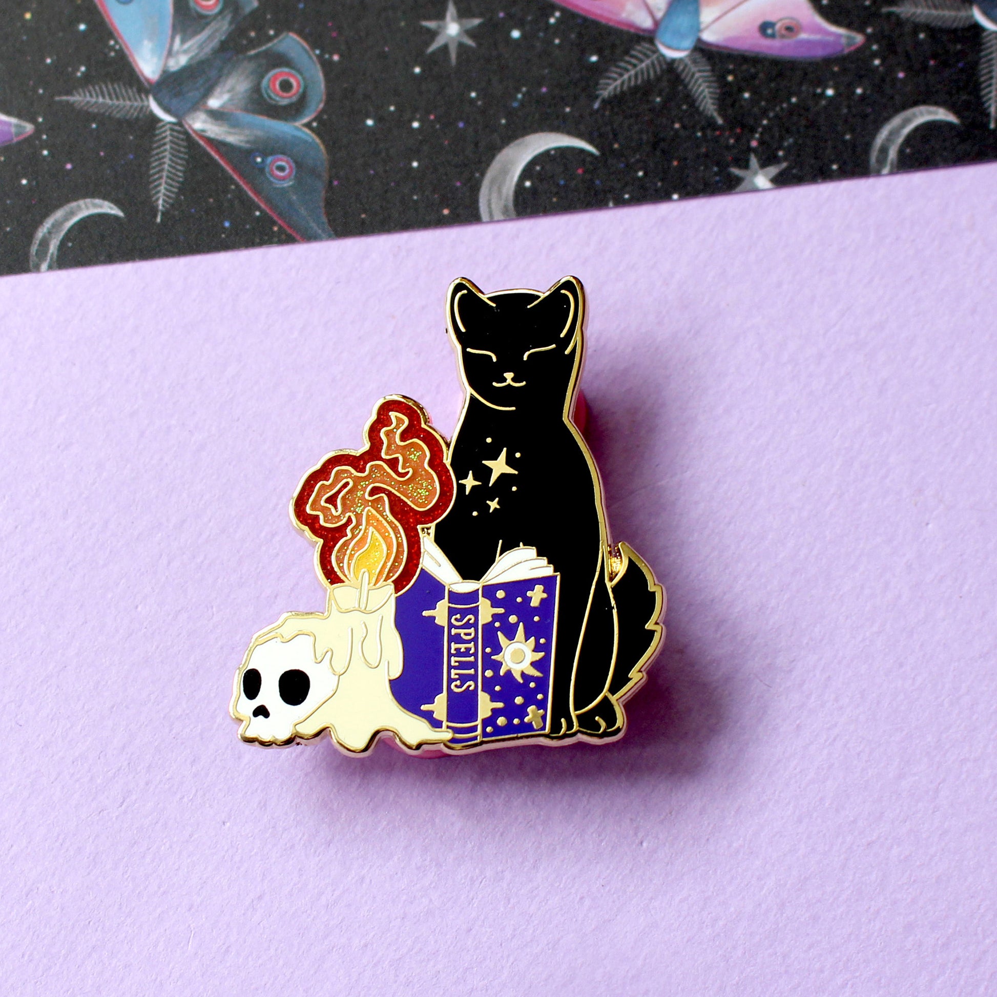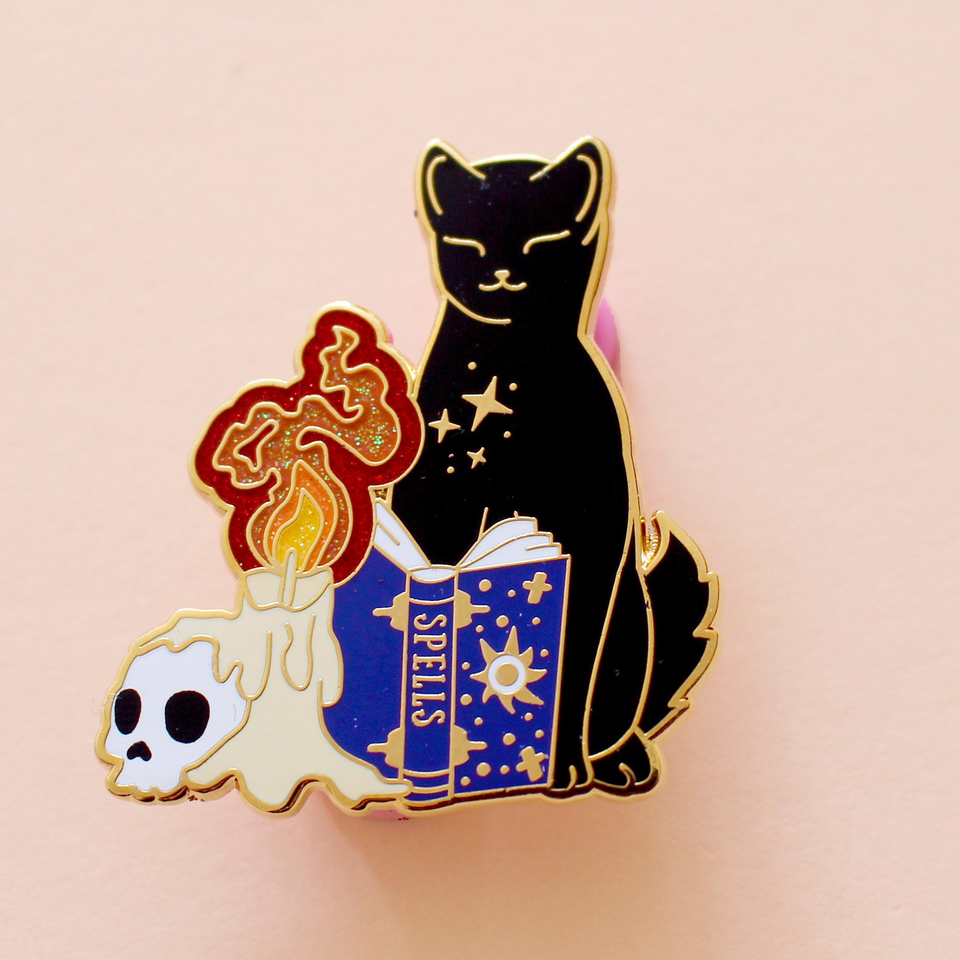 Calling all Halloween lovers! This super cute Spell Cat pin is perfect for those who love spells & sparkles.