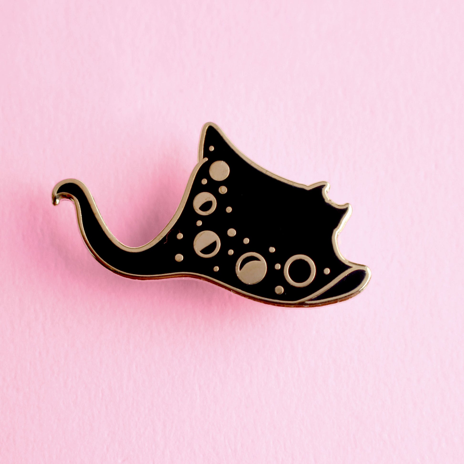 Calling all sea lovers! This fabulous Stingray Enamel Pin features a black Ray with moon phases in gold detail. The pin is secured by two pink backs and comes on a Glitter Punk backing card.