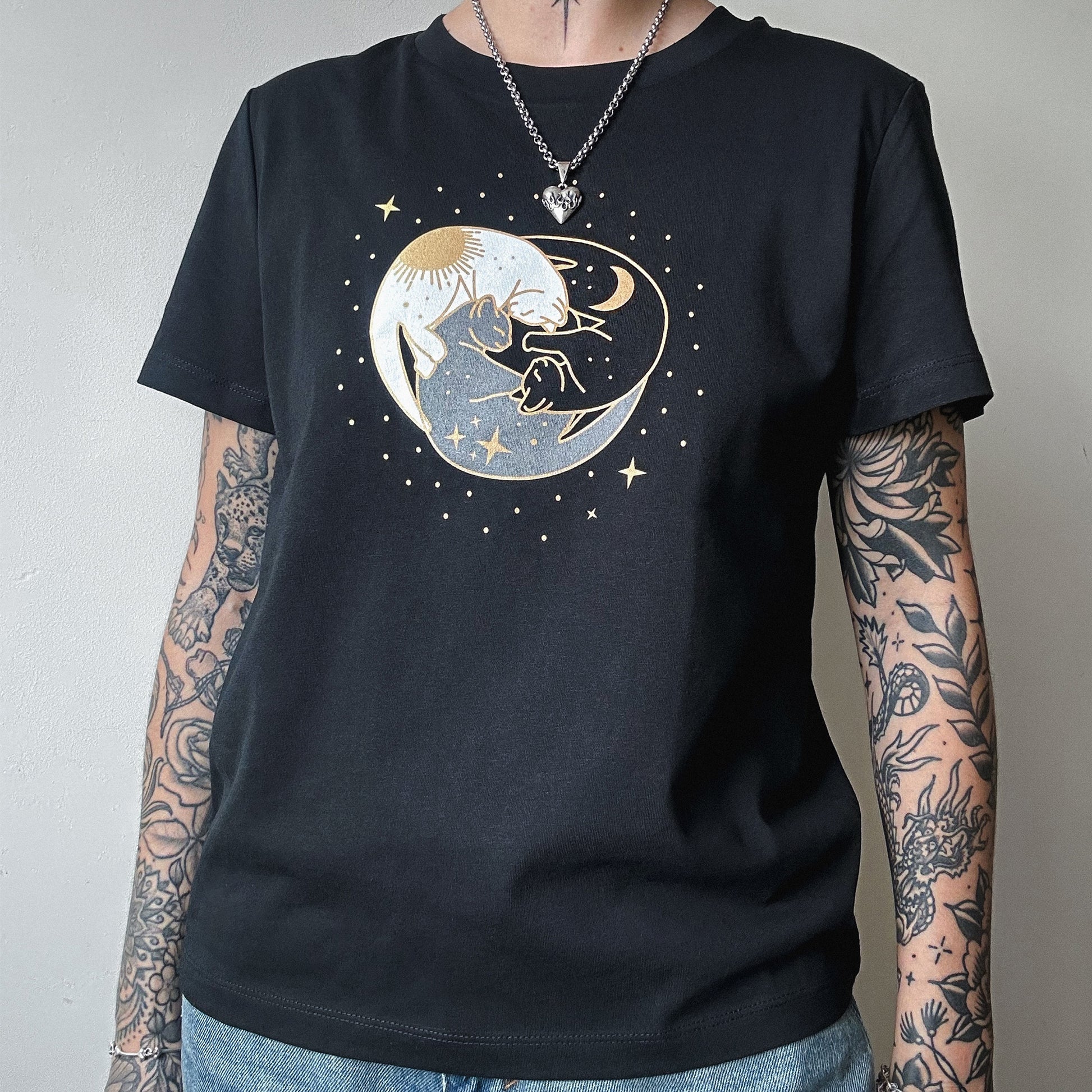 Who doesn't love a good nap?! This trio of sleepy cats certainly do! Representing the sun, moon and stars, this stunning trio is the perfect relaxed t-shirt for cat lovers.