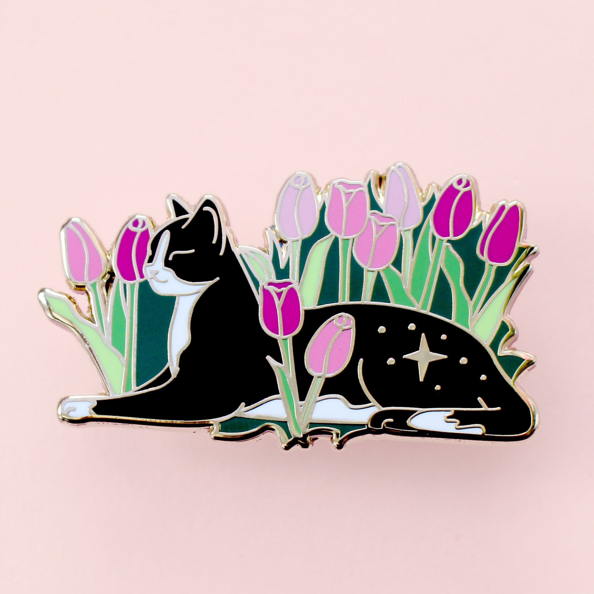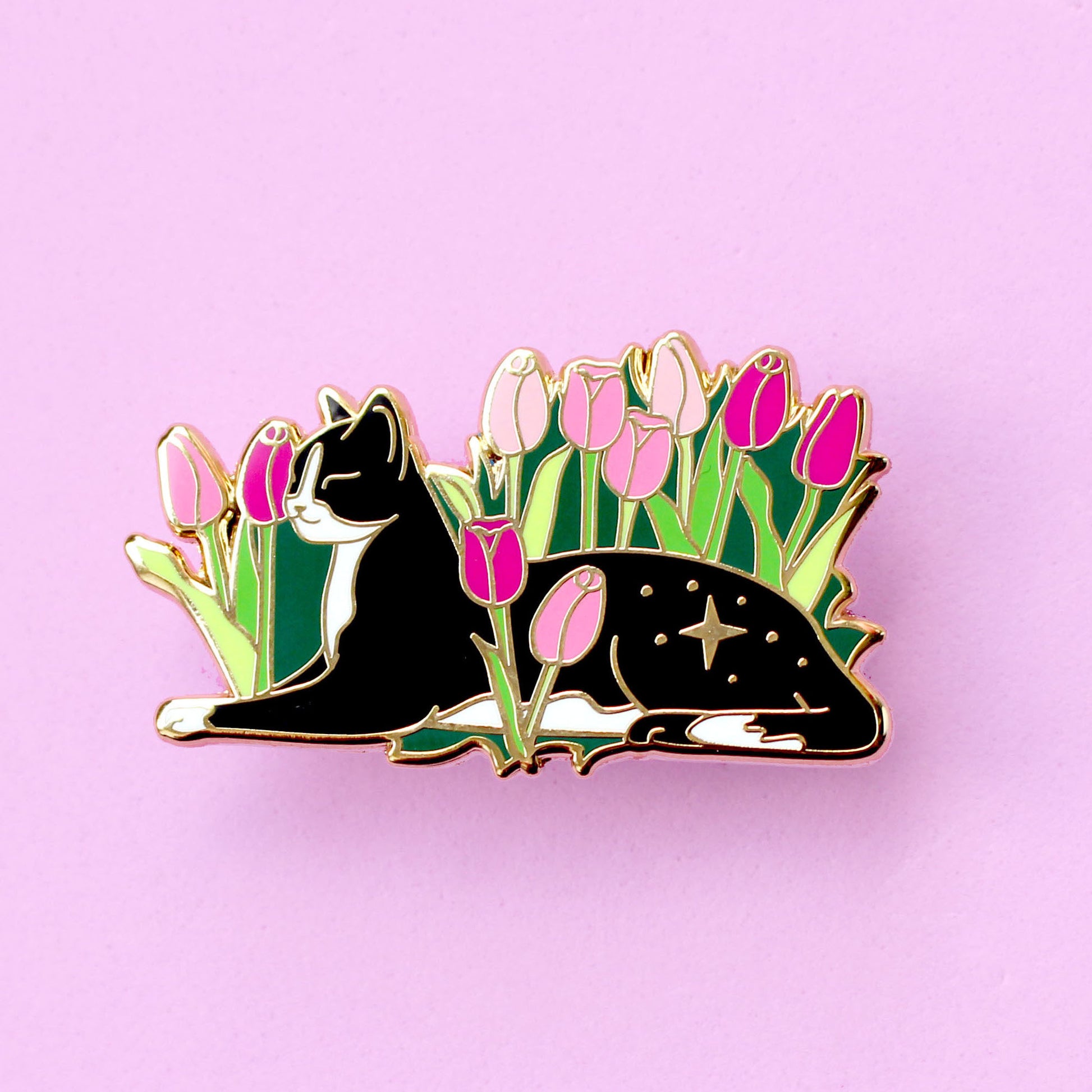 Cats love nothing better than relaxing in a flower bed – and this cute cat is no exception! This awesome pin features a black and white tuxedo cat lying down in some pink tulips.