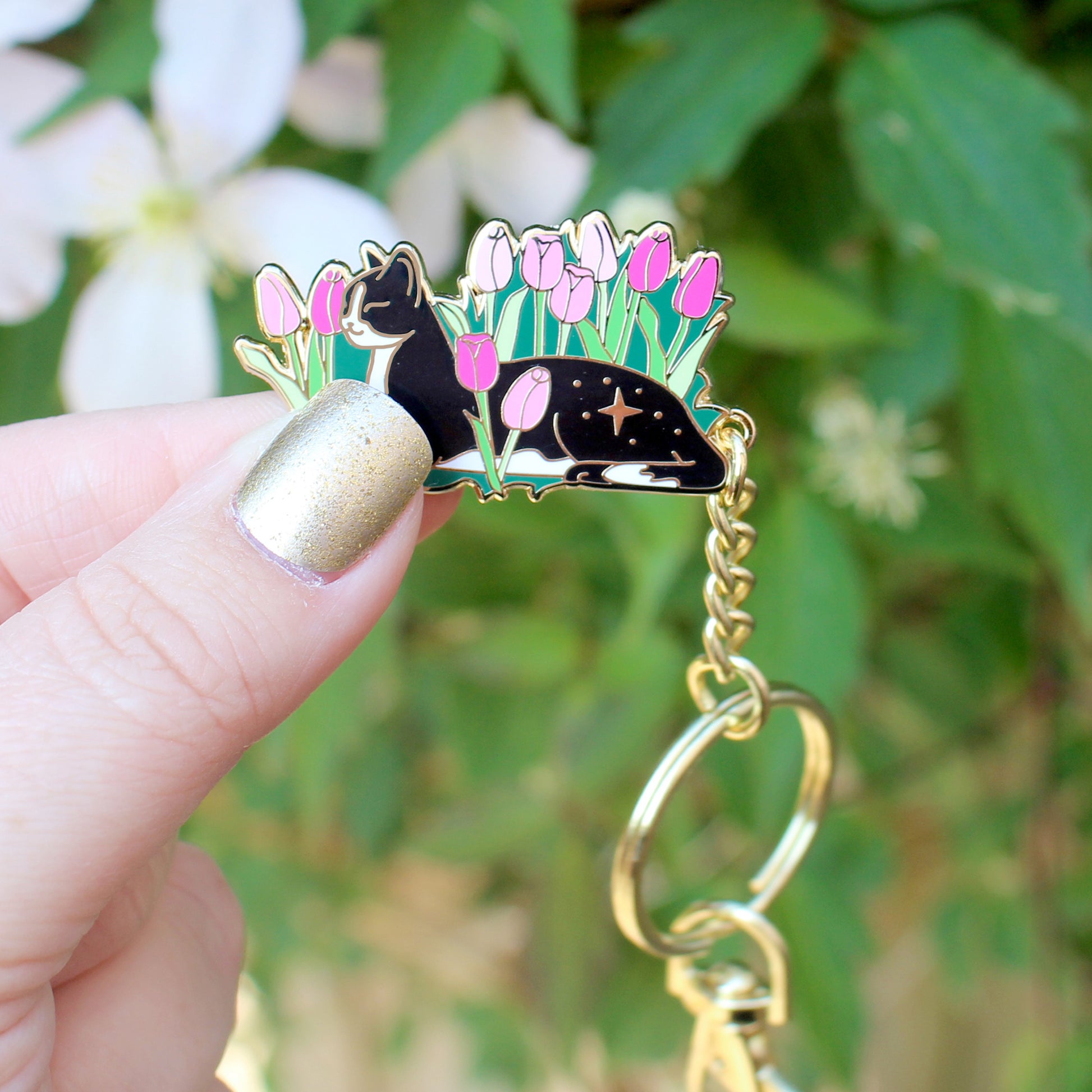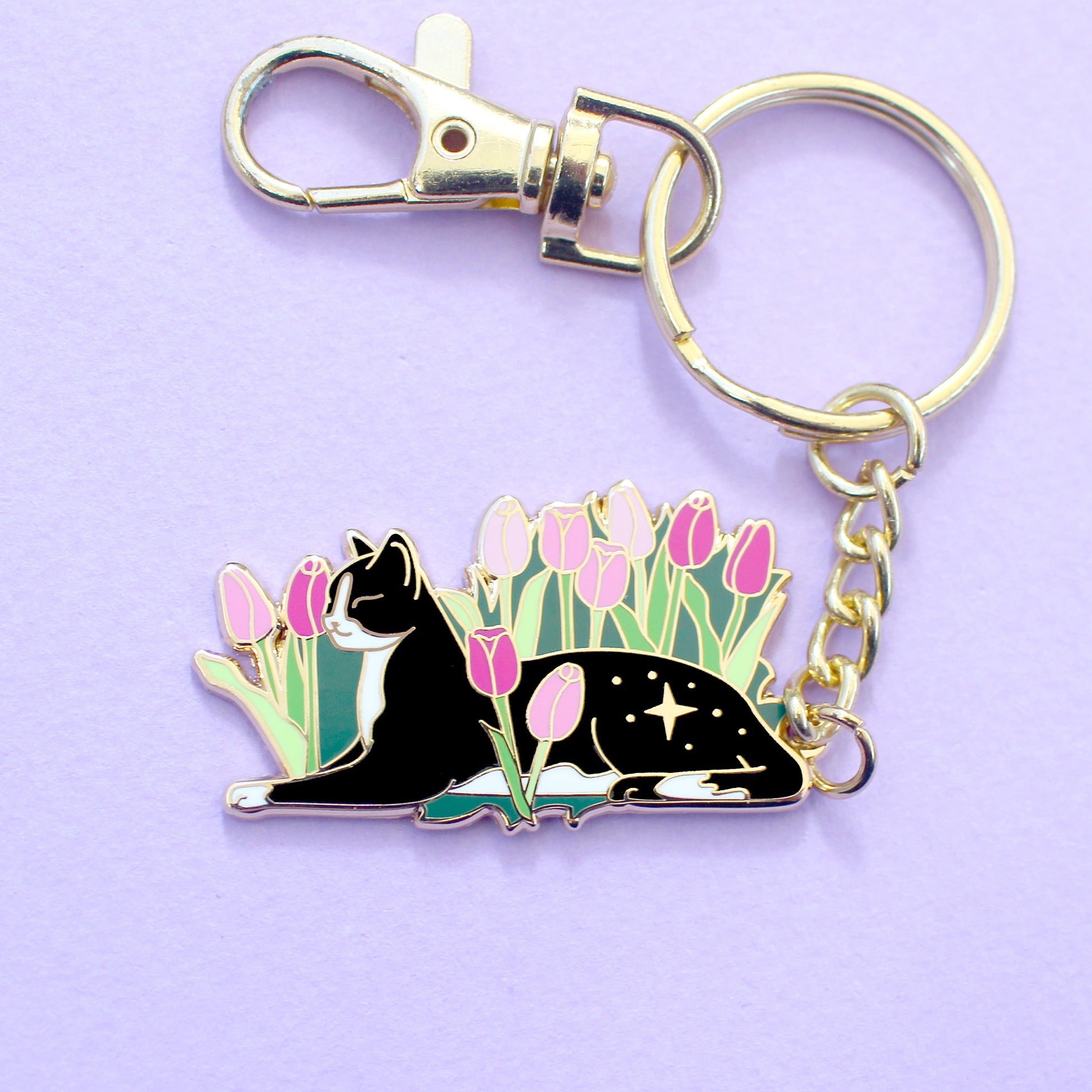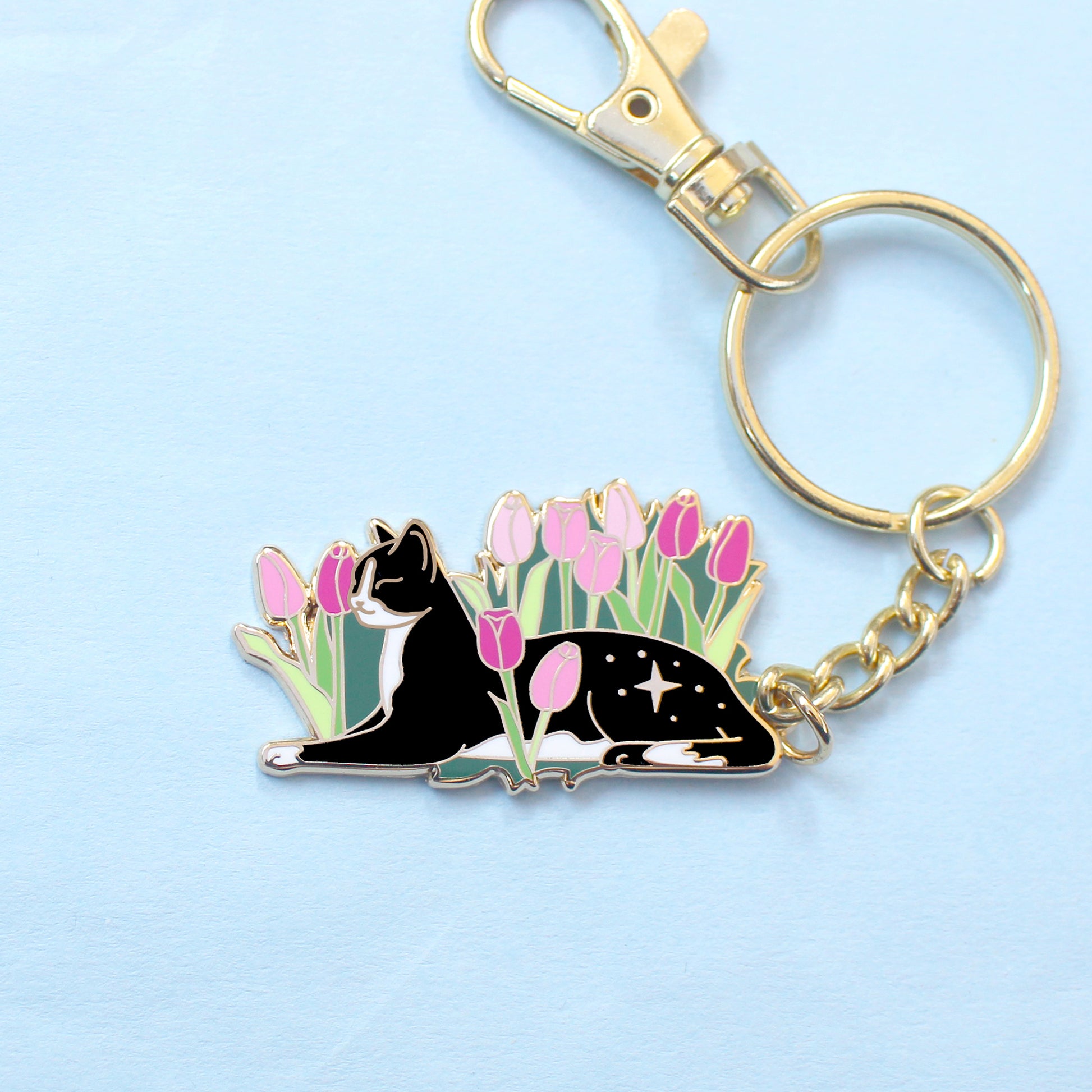 Cats love nothing better than relaxing in a flower bed – and this cute cat is no exception! This awesome key chain features a black and white tuxedo cat lying down in some pink tulips.