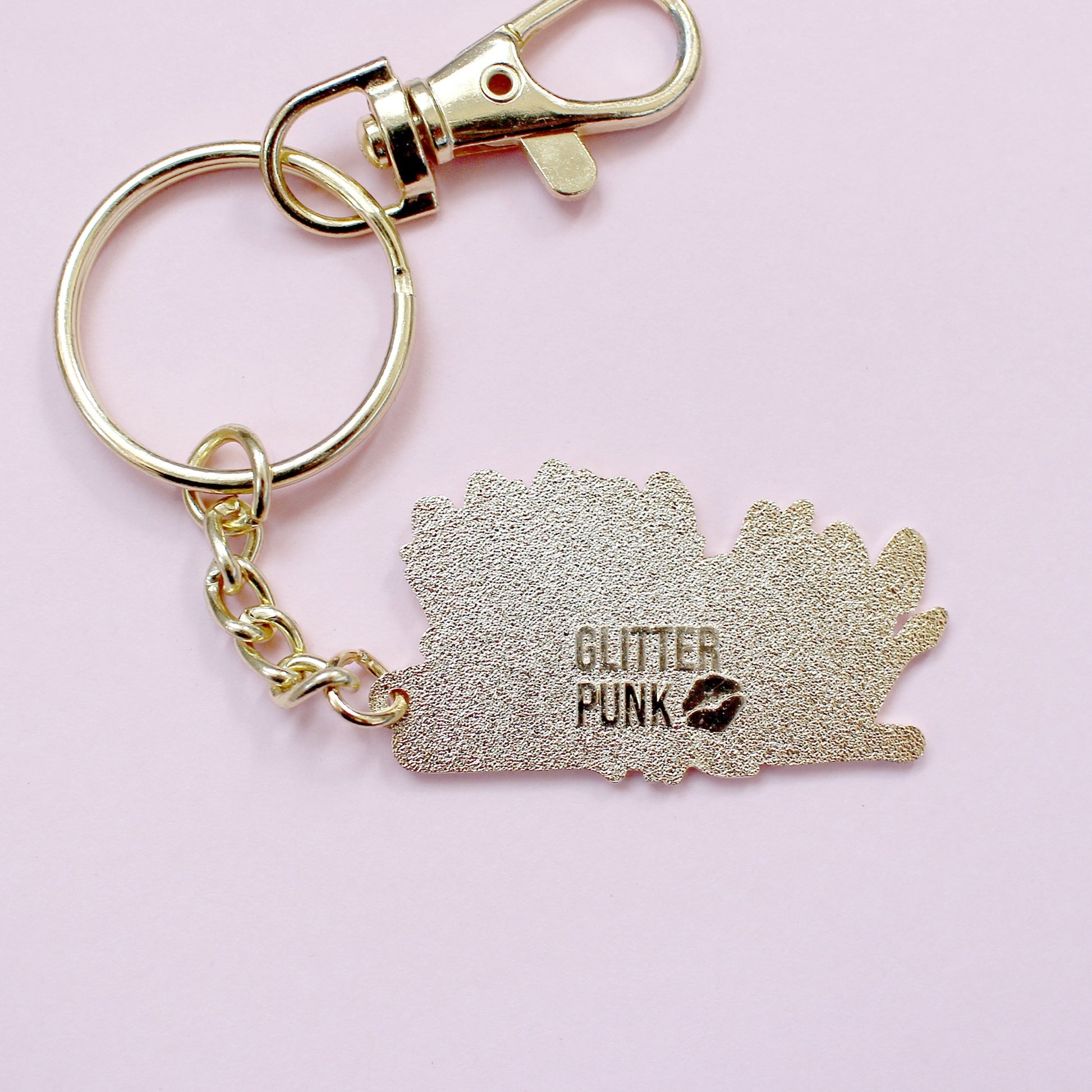 Made from gold hard enamel, the charm measures 42mm and is hung from a heavy gold key chain.