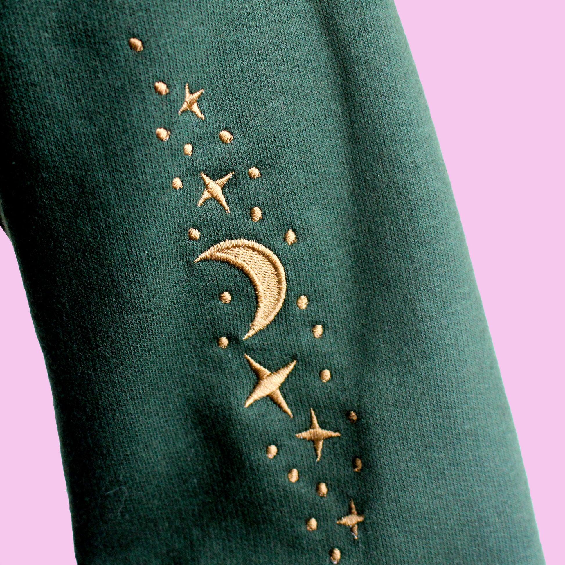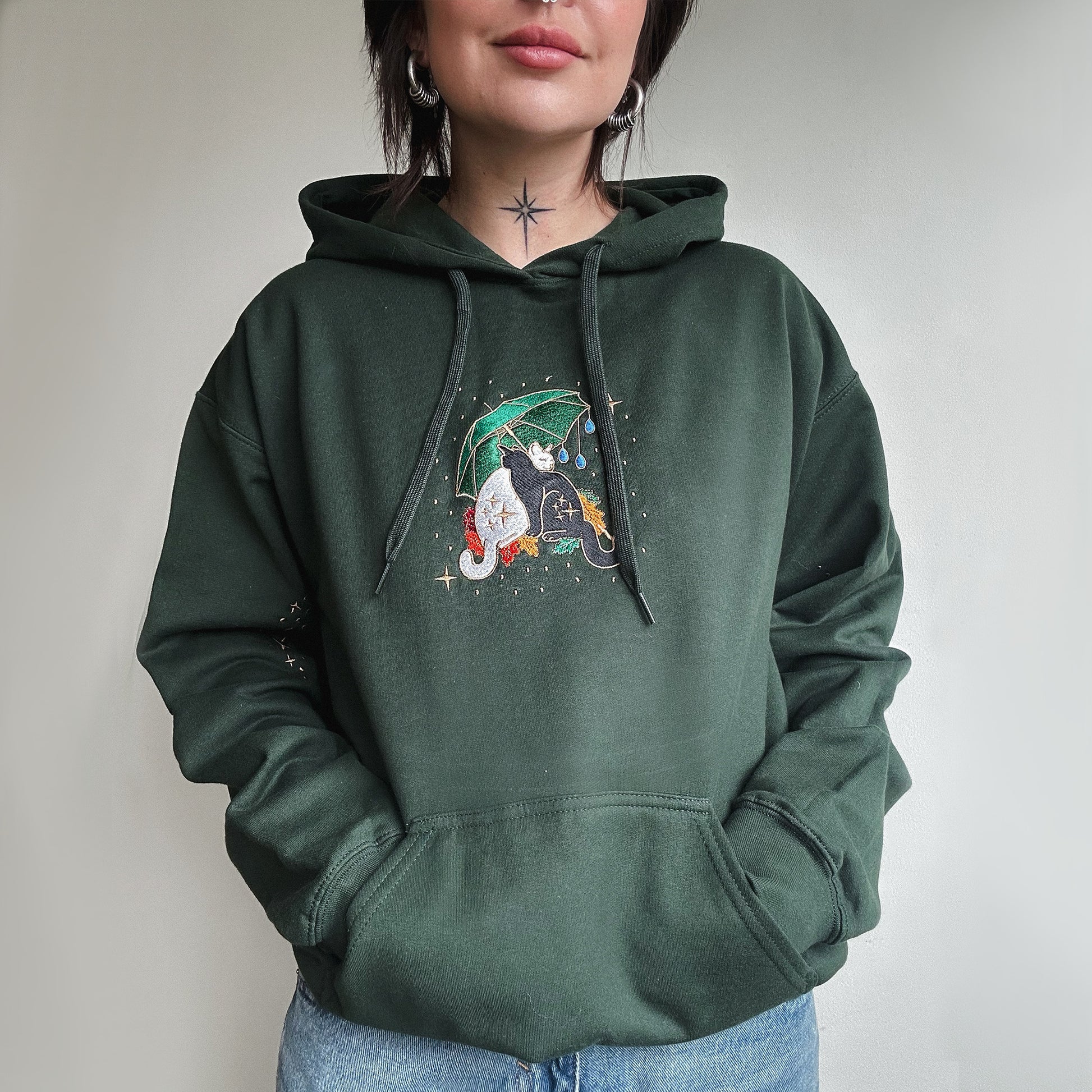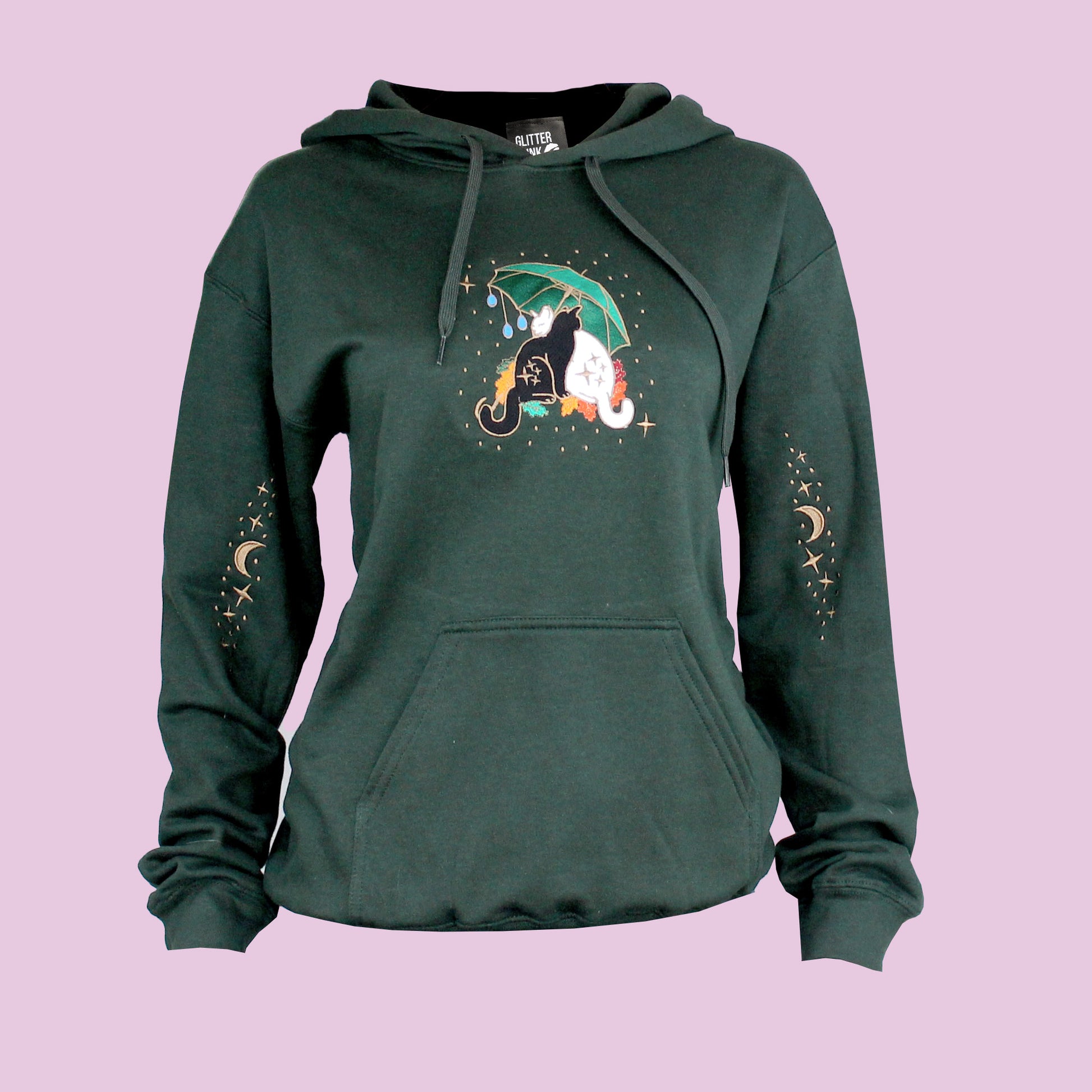 Made from a super soft cotton mix, this relaxed forest green unisex hoodie has starry sleeves, as well as the umbrella cats design embroidered onto the chest.