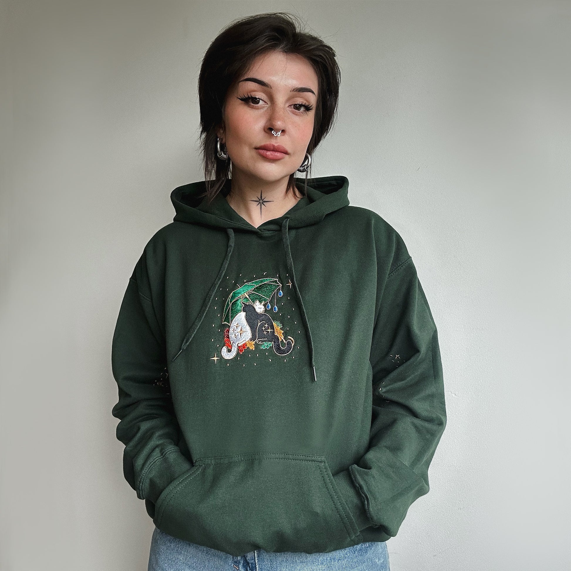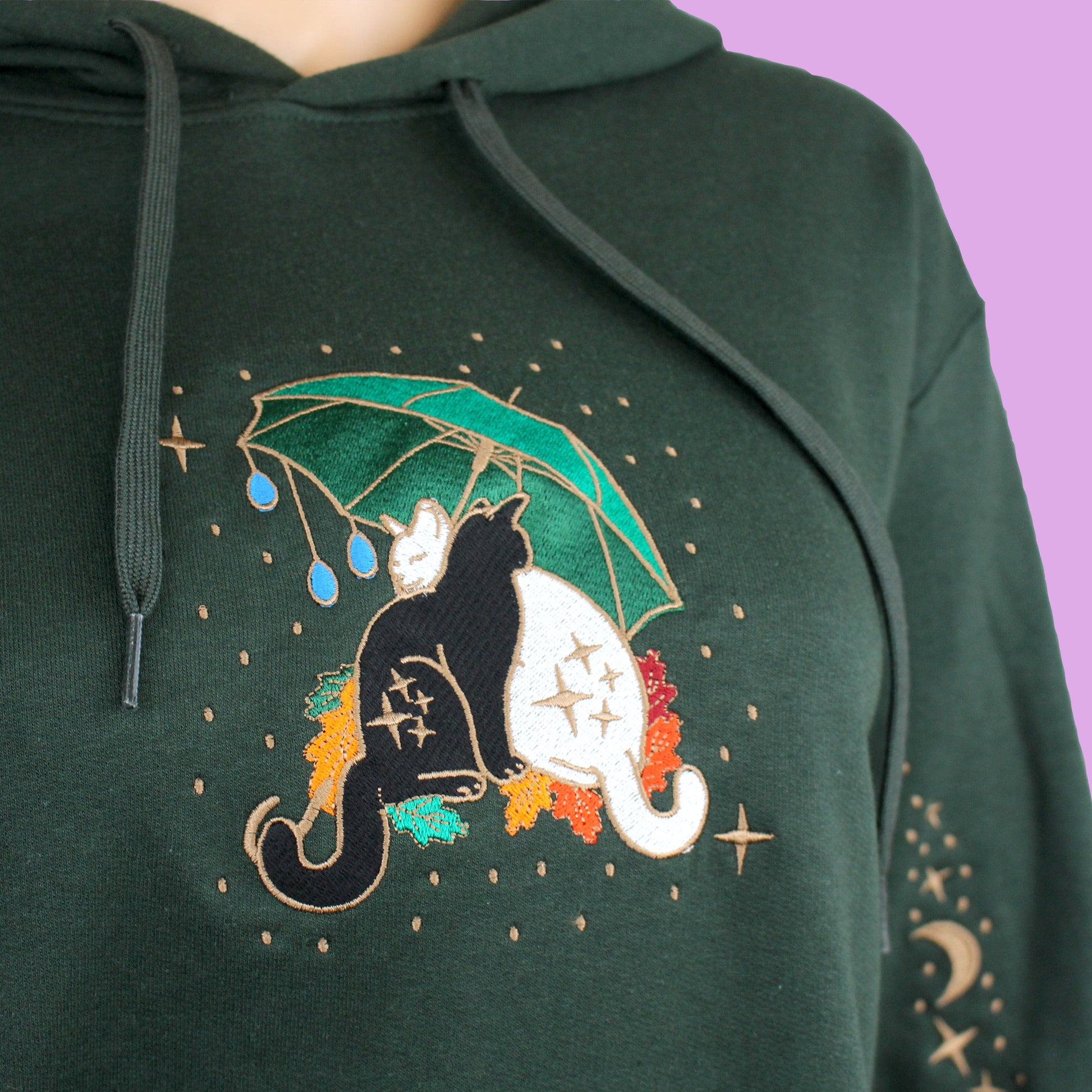 This fabulous autumnal themed Umbrella Cats hoodie features embroidery of two sweet cats snuggling from the rain under an umbrella, surrounded by fallen leaves.