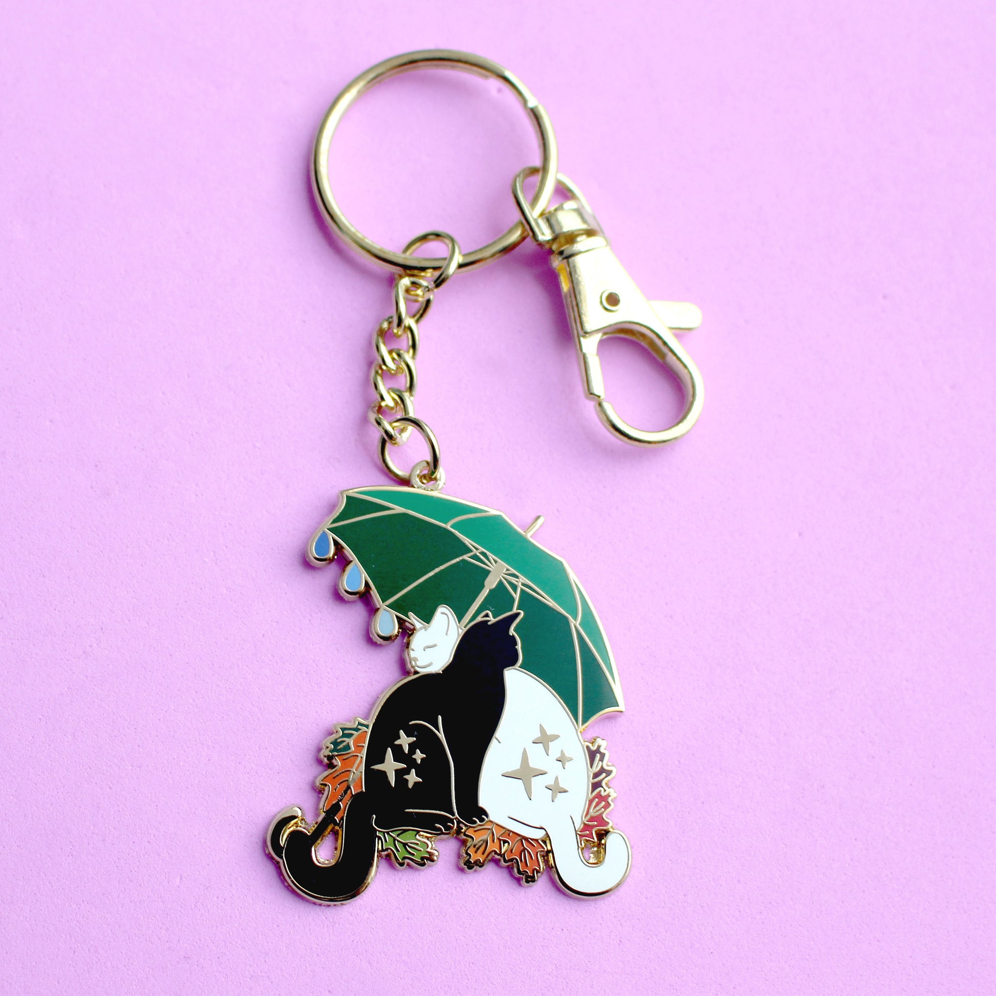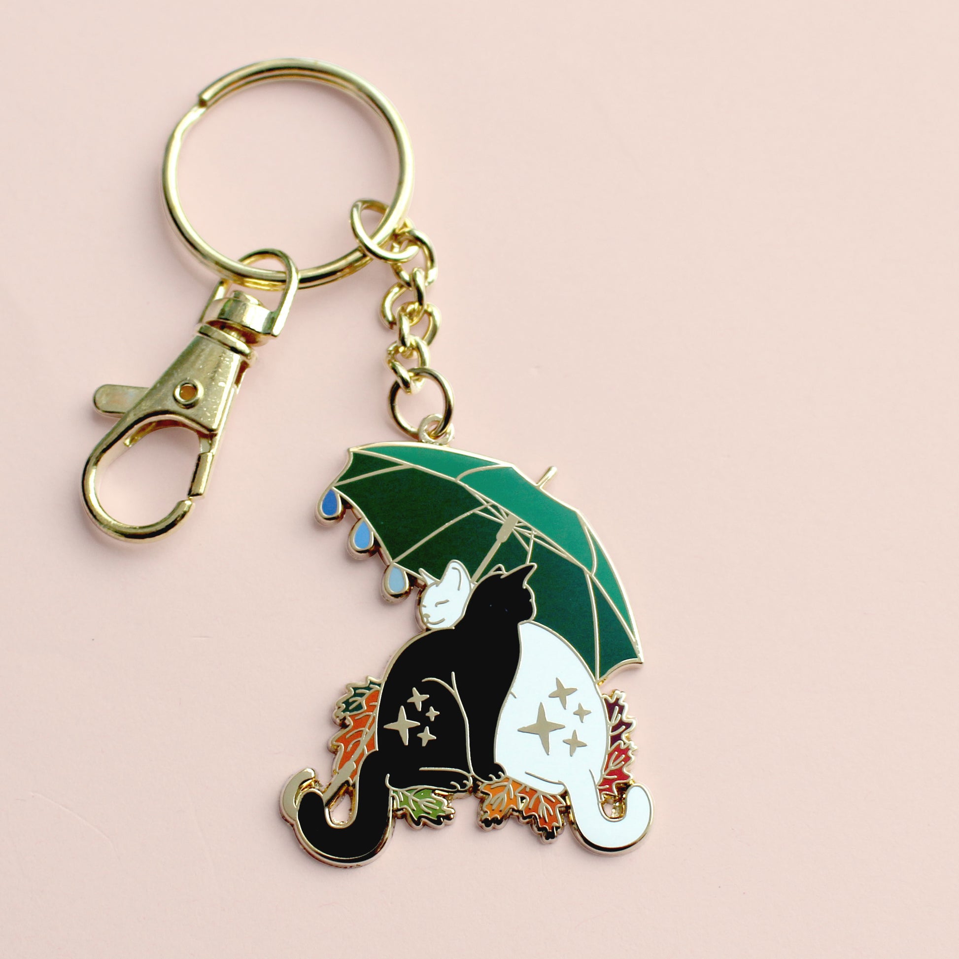 This fabulous autumnal themed enamel keychain features two sweet cats snuggling from the rain under a large green umbrella, surrounded by fallen leaves. Made from gold hard enamel, the charm measures 45mm and is hung from a heavy gold keychain.