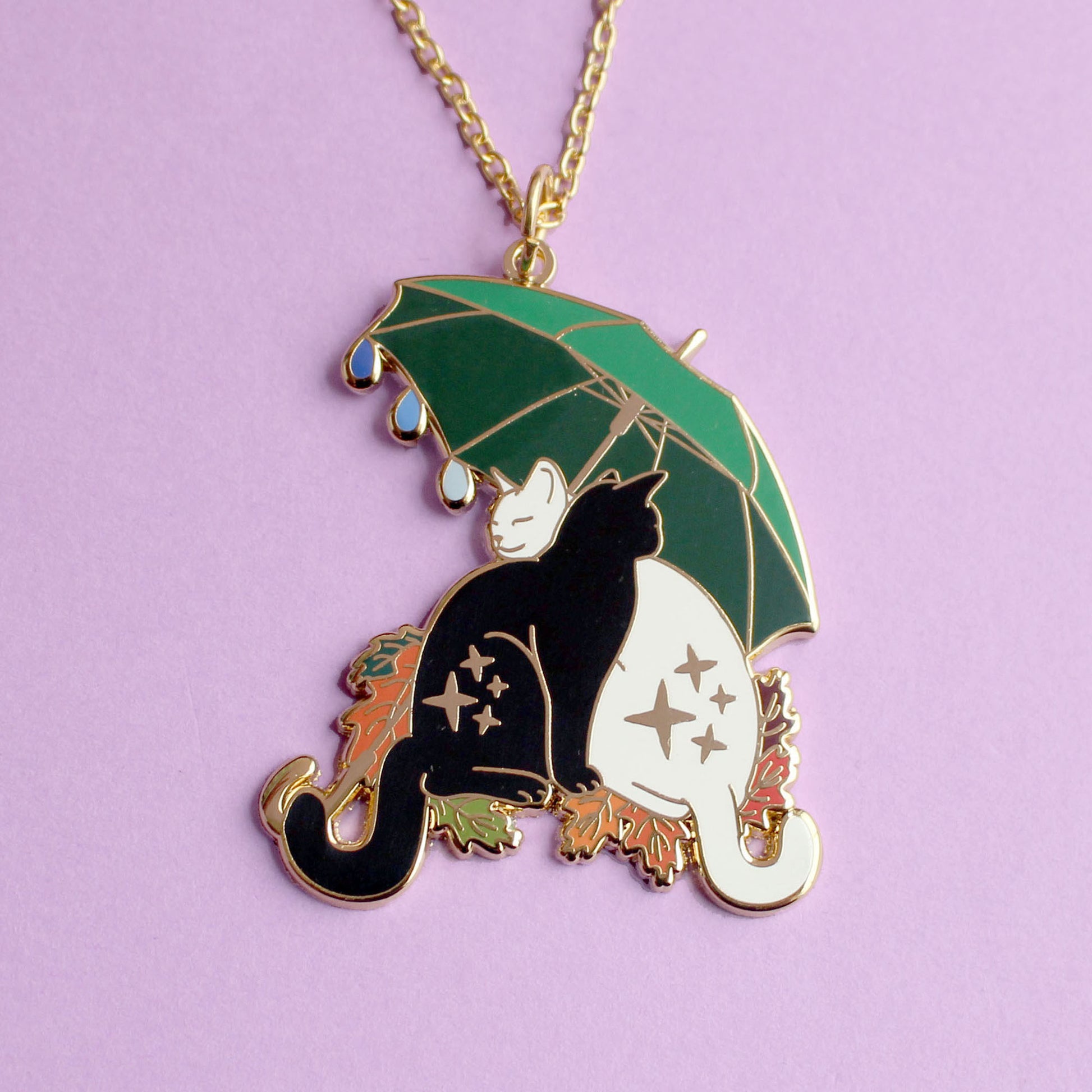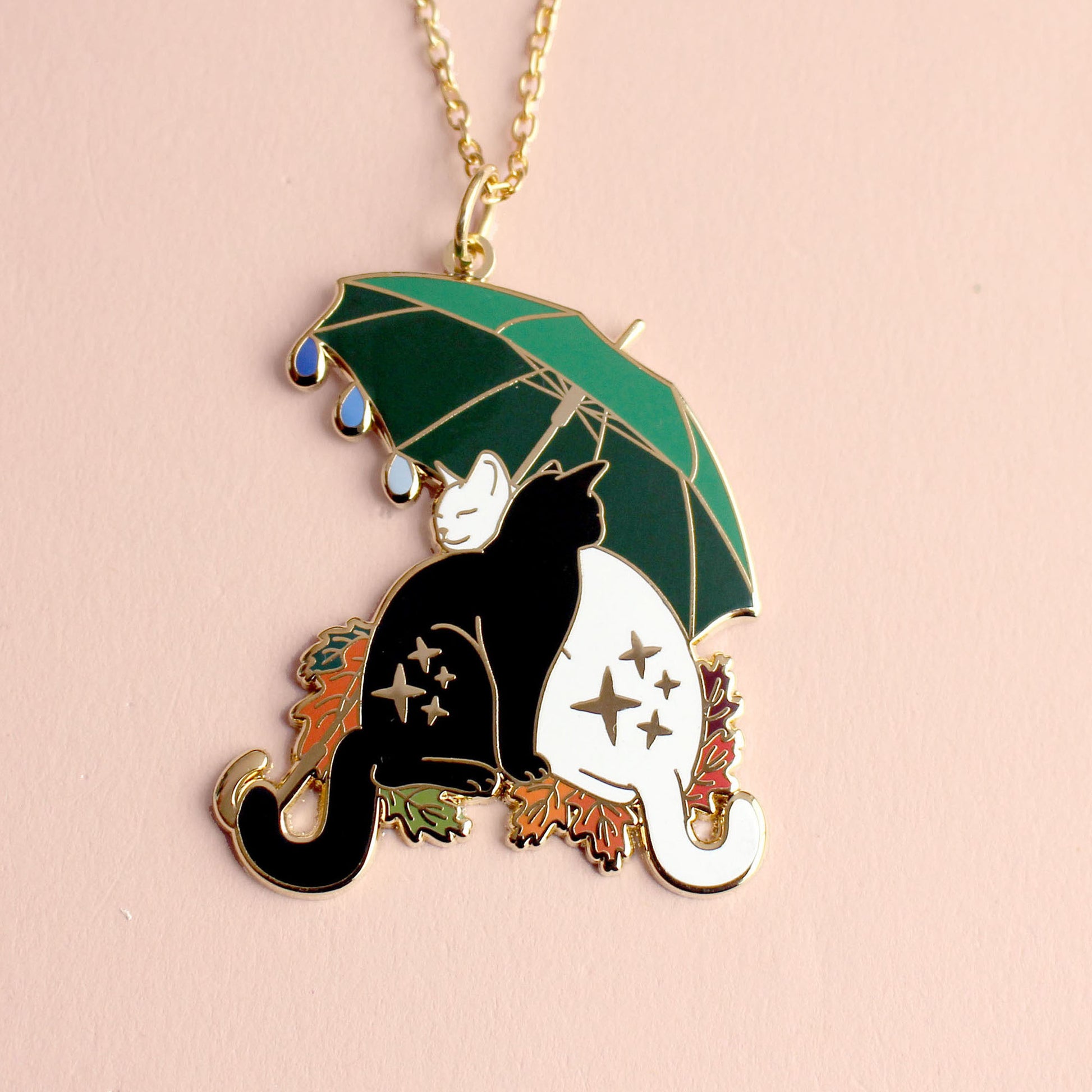 The Umbrella Cats design is now available as a necklace! Made from gold hard enamel, the charm measures 45x37mm and is hung from an 18" gold chain.