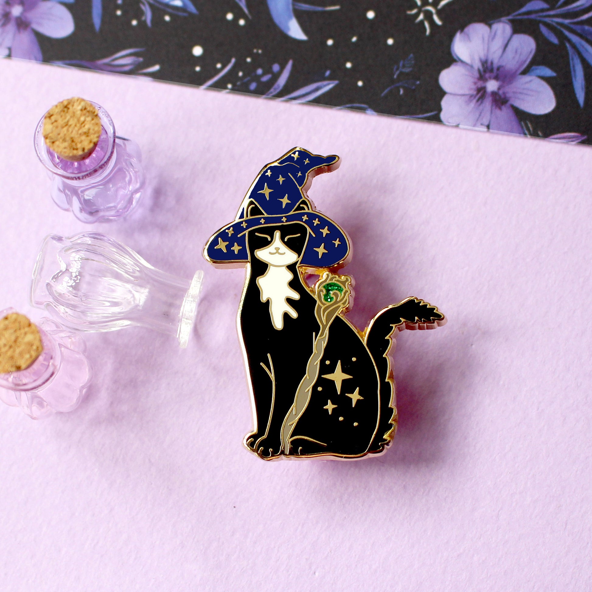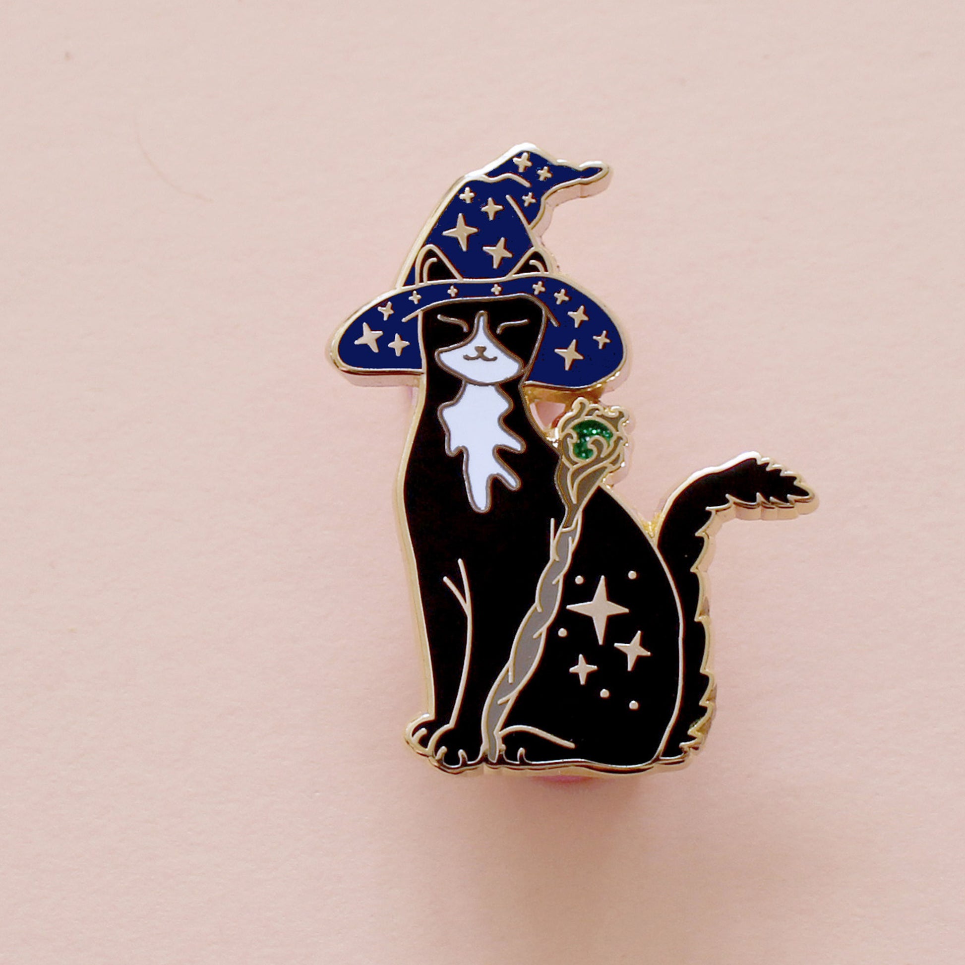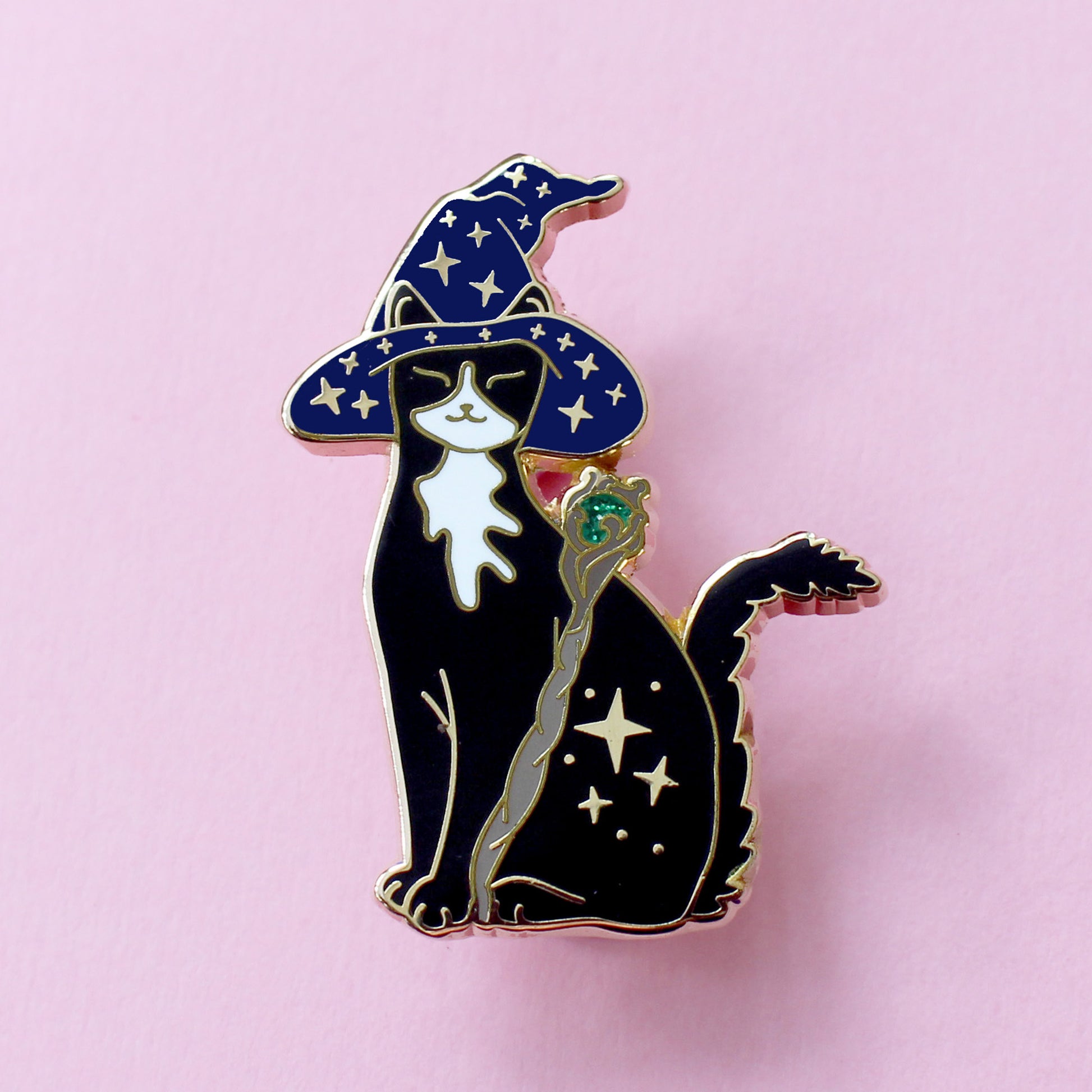 The pin features a black and white tuxedo cat wearing a blue starry wizard's hat, holding a staff with a glittery green globe on the end.