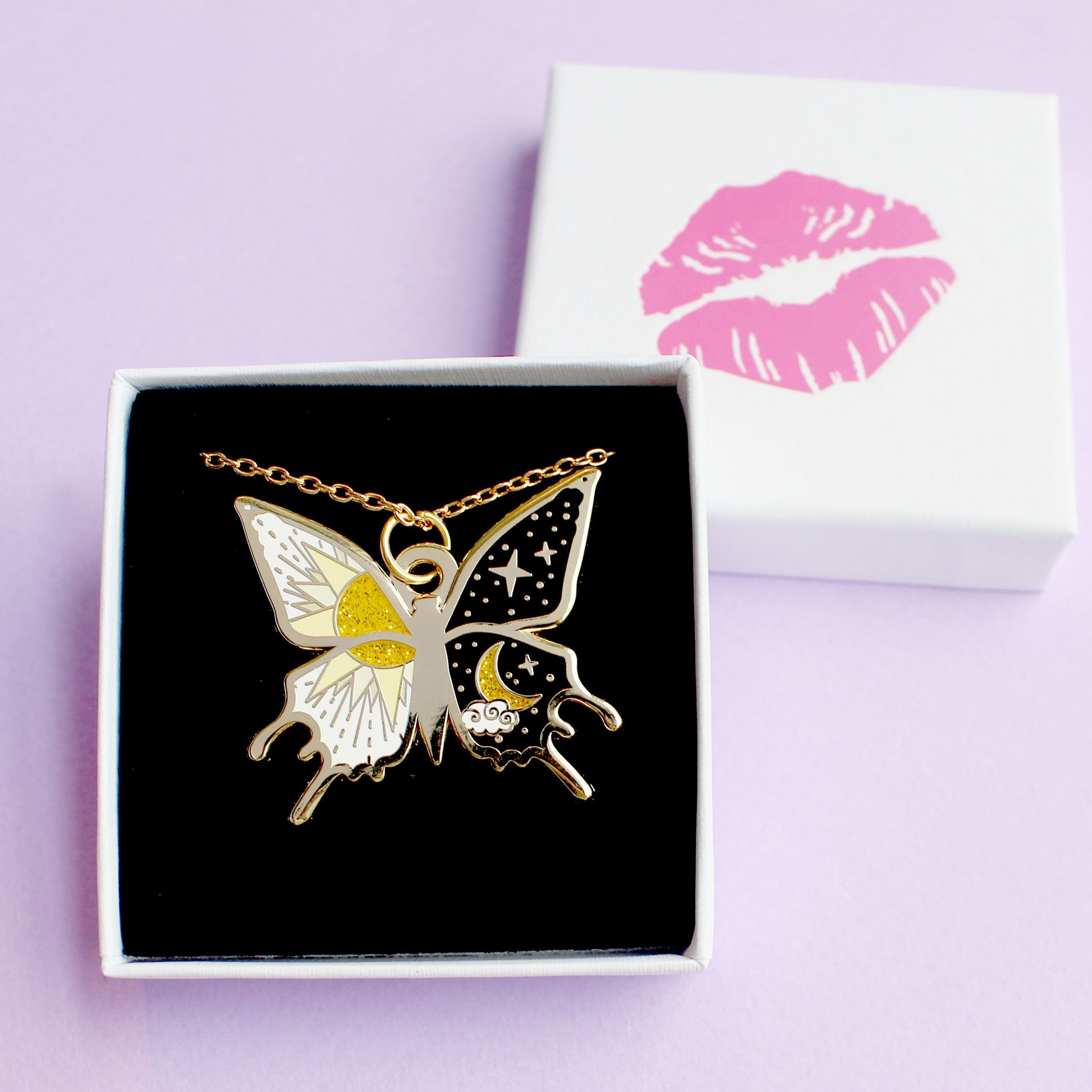 This fab necklace features a butterfly with one wing in white and a glittery sun design, and the other in black with an equally glittery moon.